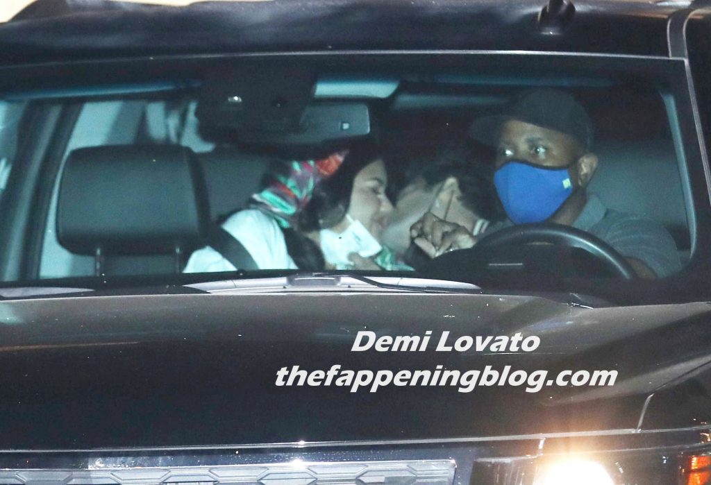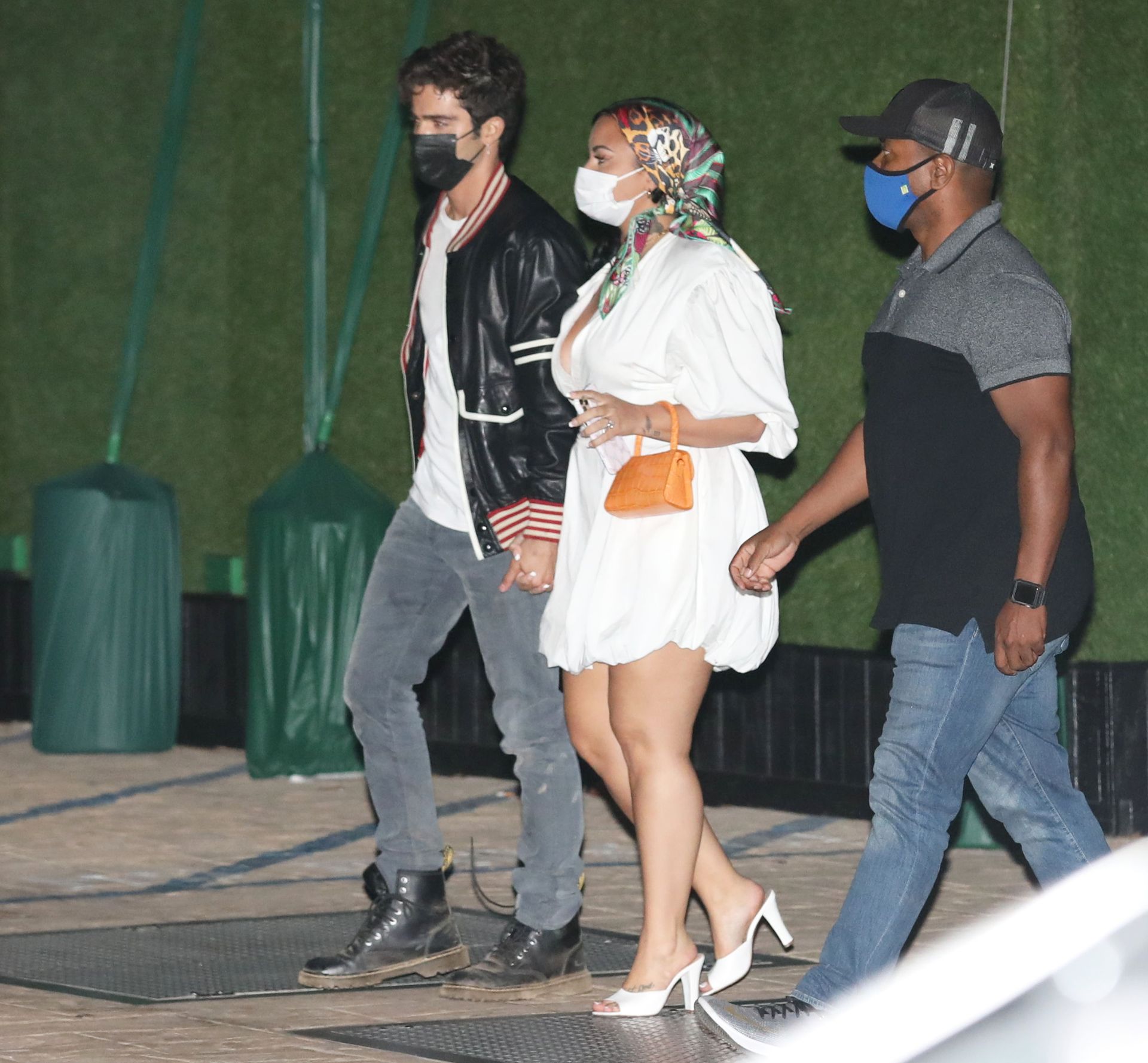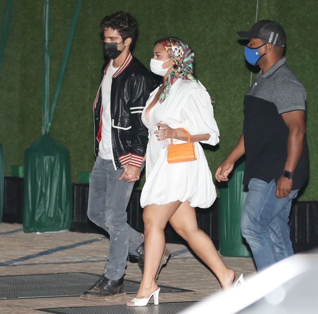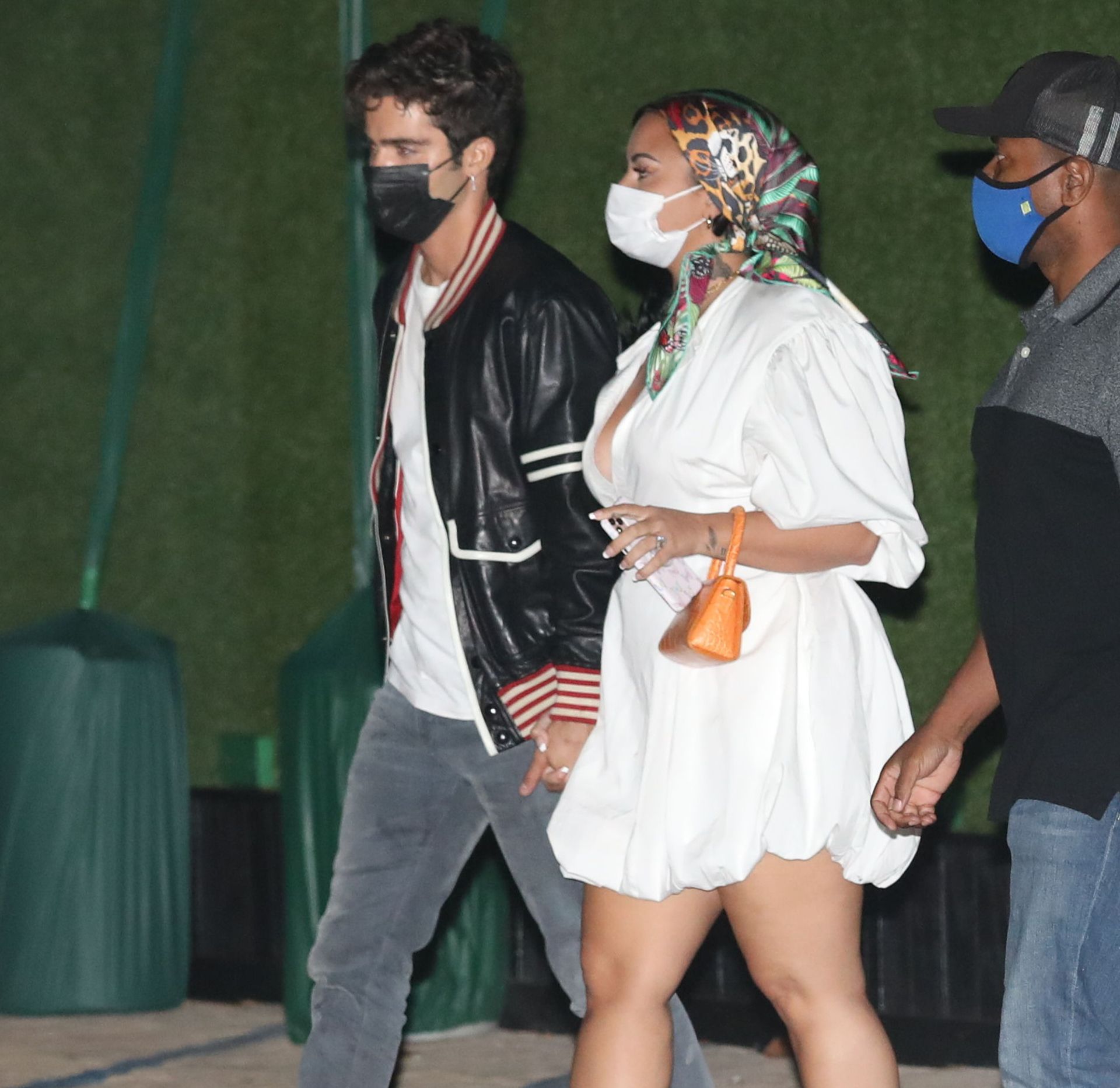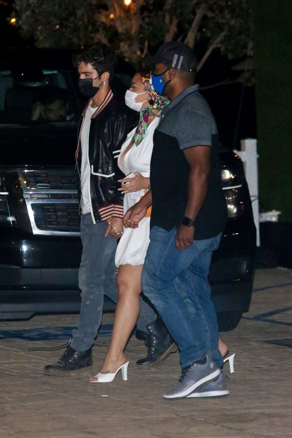 La chanteuse Demi Lovato et son fiancé Max Ehrich se tiennent la main alors qu’ils arrivent pour un dîner tardif au Nobu à Malibu, le 29/08/2020.