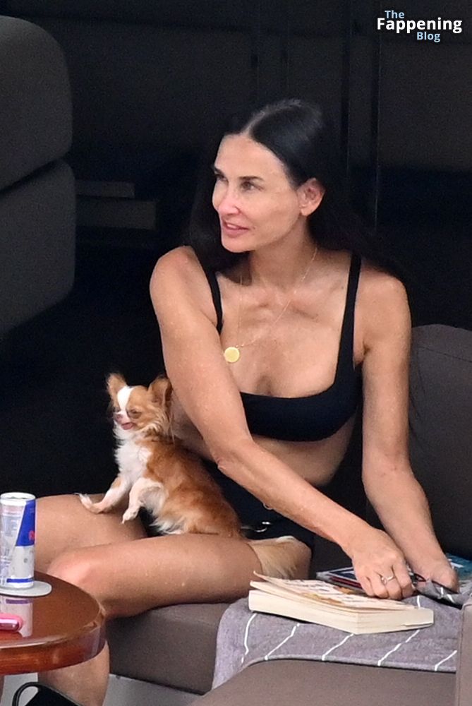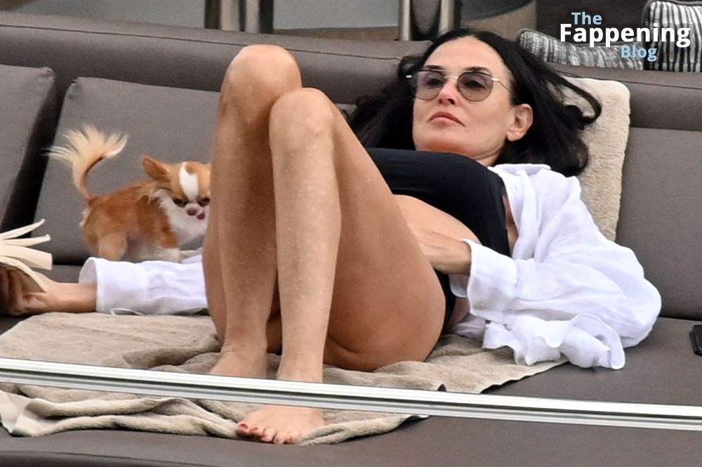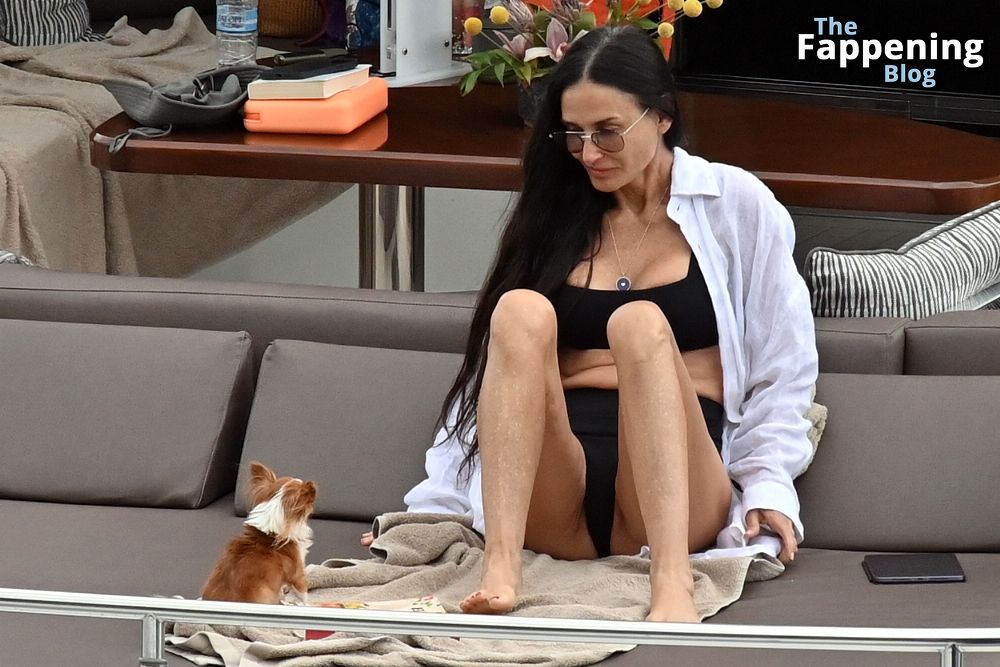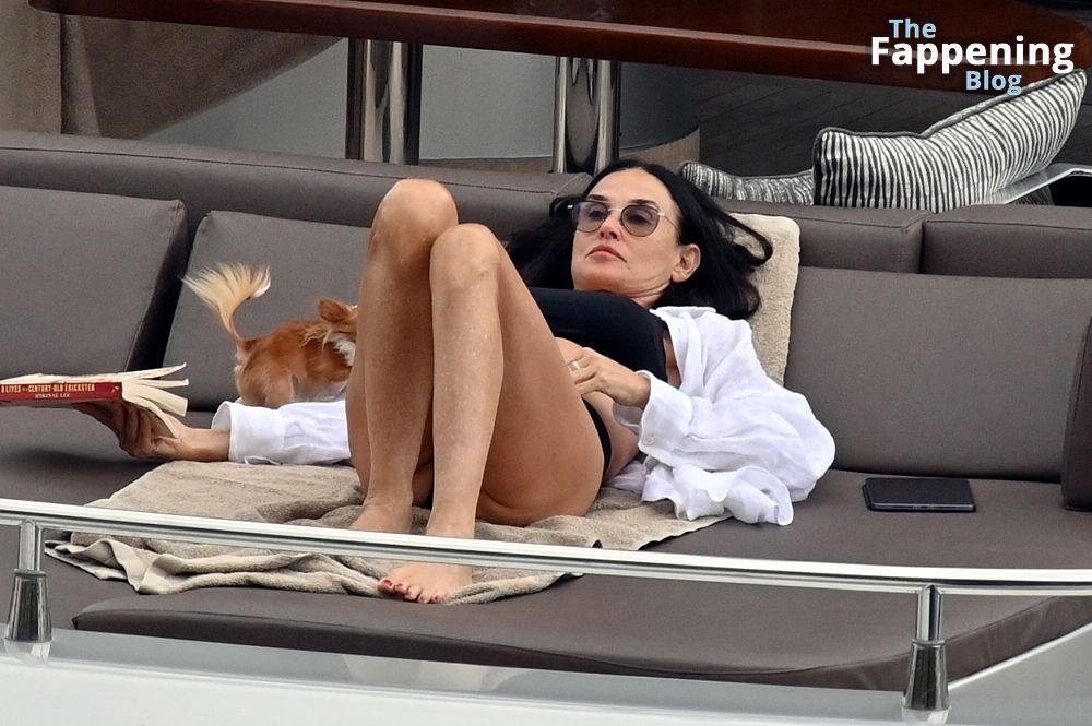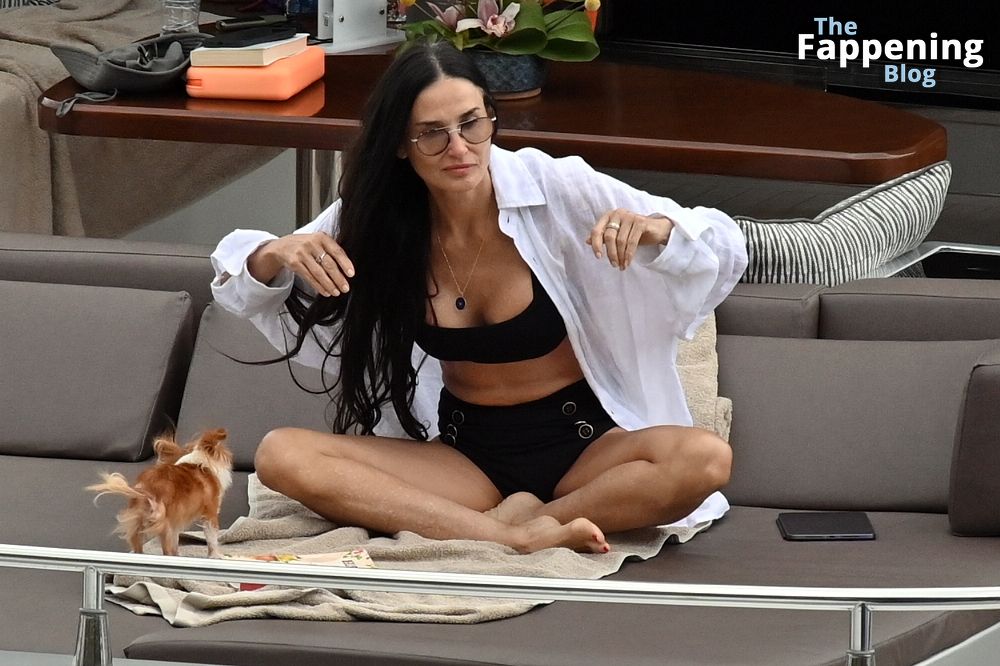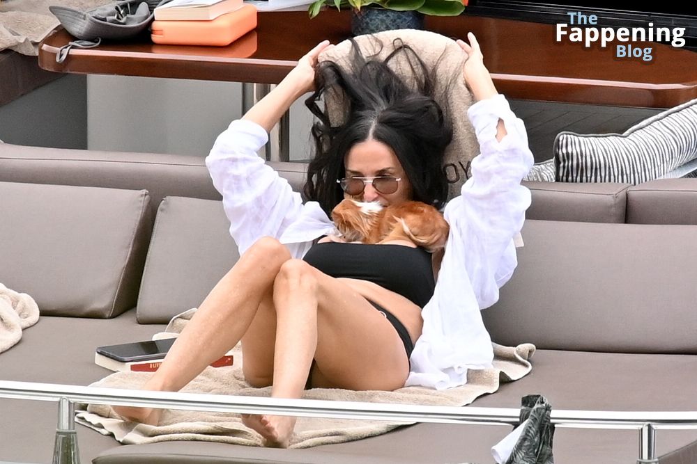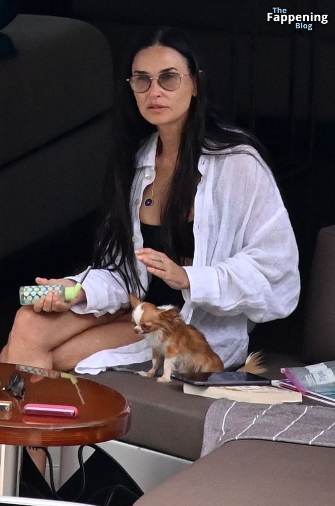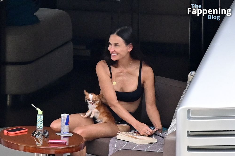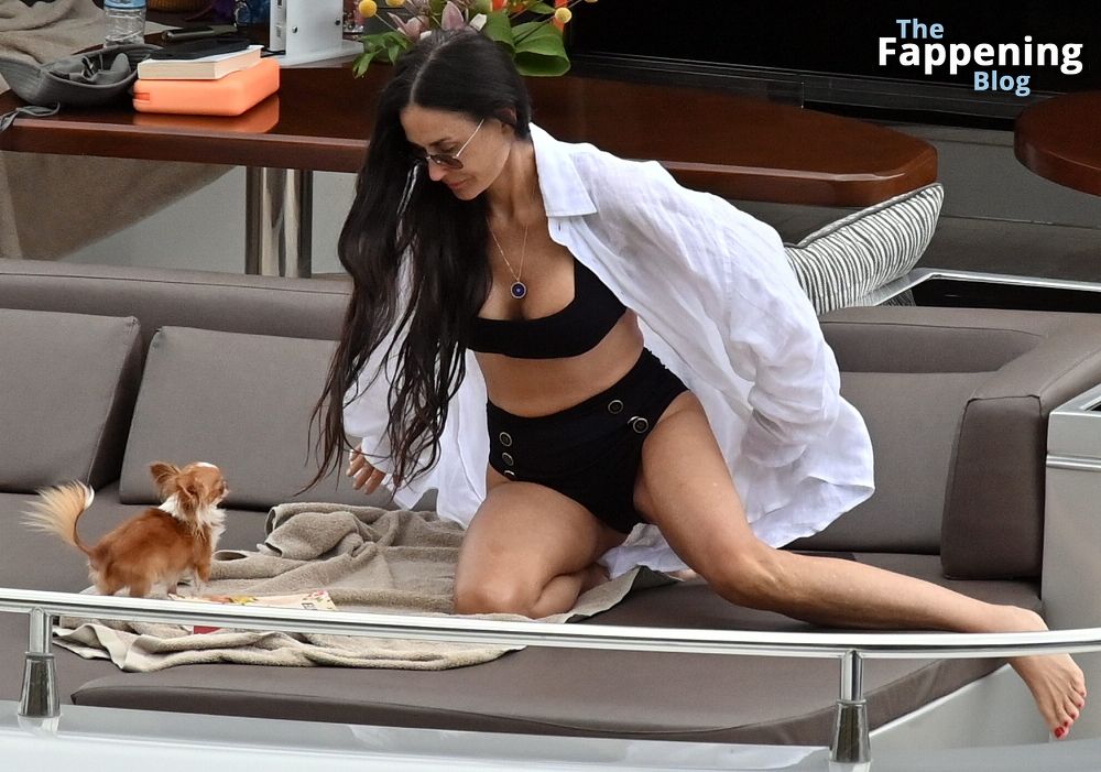 Demi Moore est chic dans un maillot de bain noir taille haute alors qu’elle poursuit ses vacances en Grèce à bord d’un yacht de luxe avec son chien adoré Pilaf, 08/12/2023.
