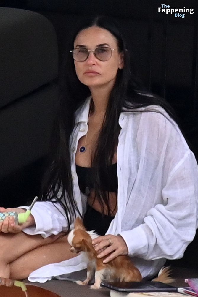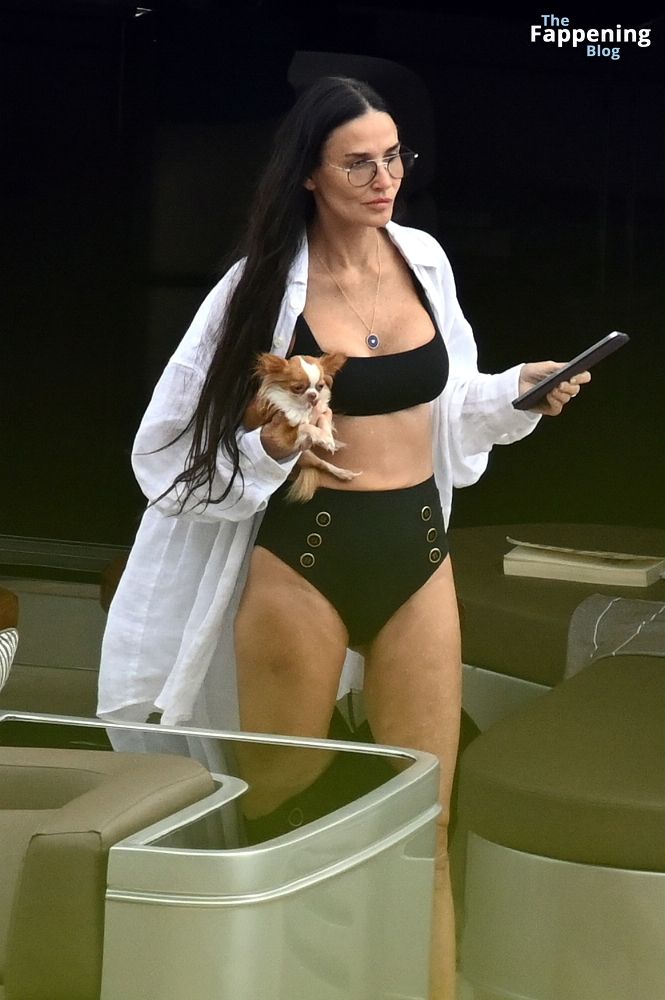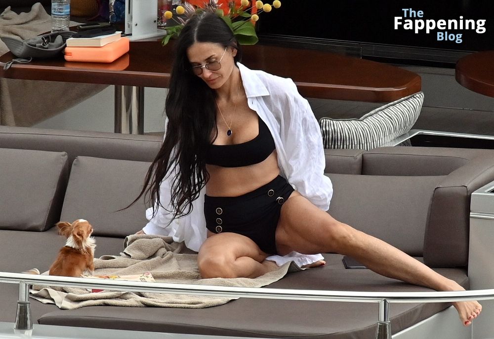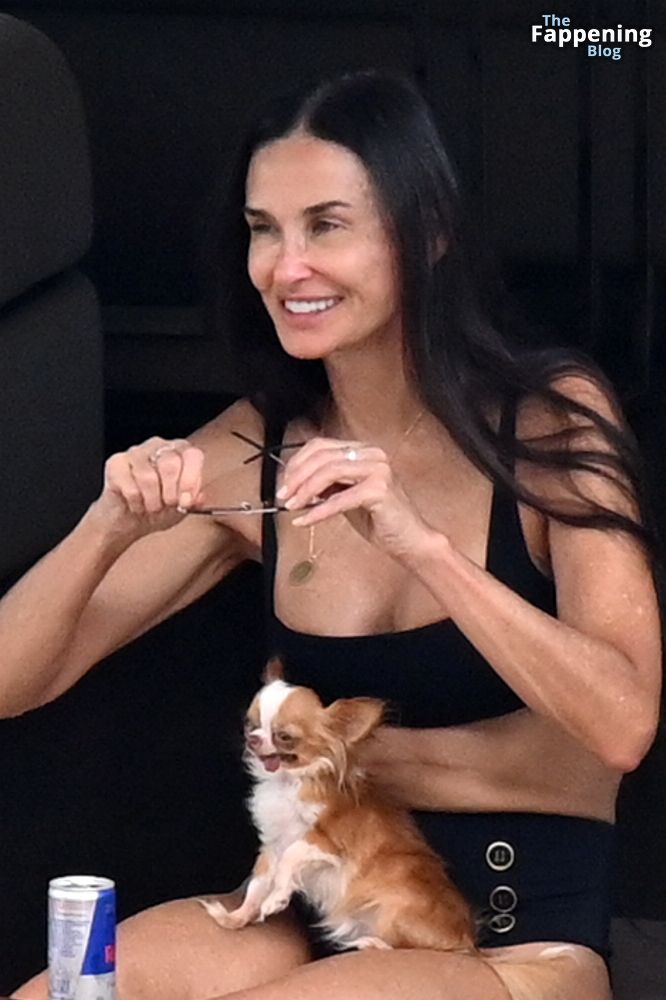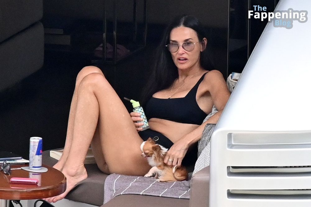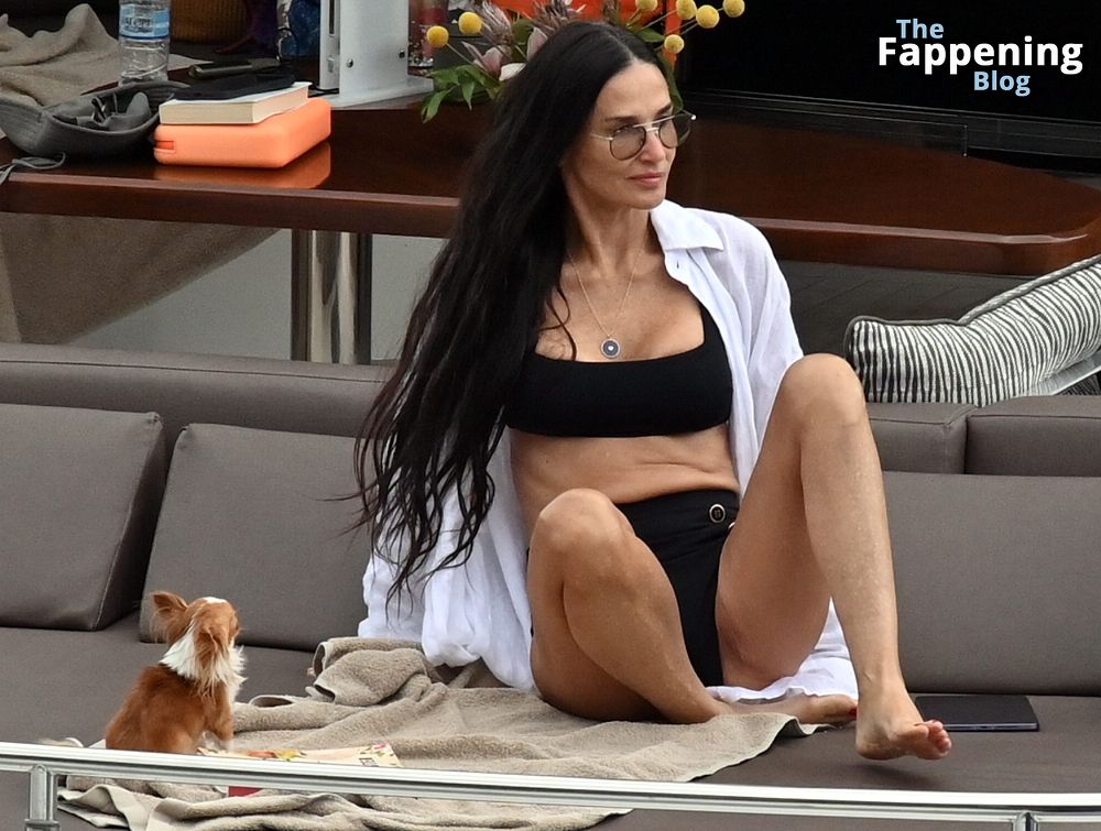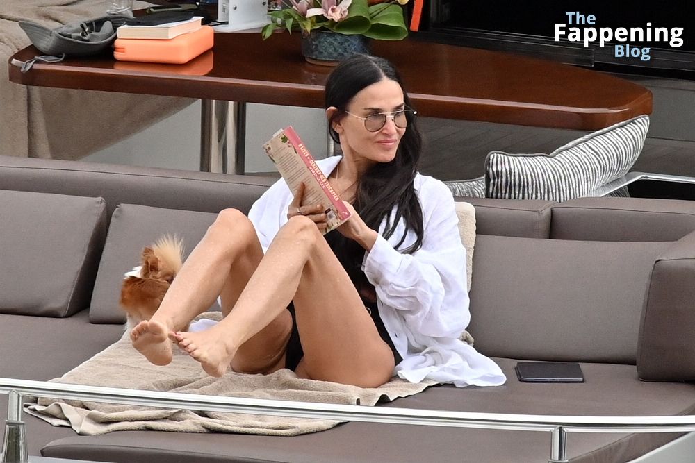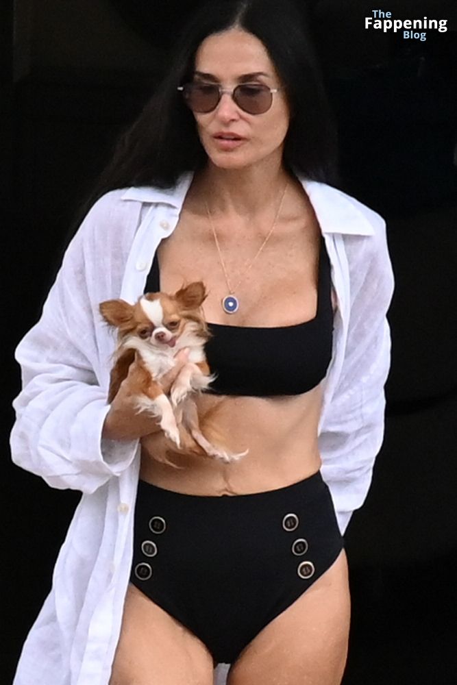 Demi Moore est chic dans un maillot de bain noir taille haute alors qu’elle poursuit ses vacances en Grèce à bord d’un yacht de luxe avec son chien adoré Pilaf, 08/12/2023.