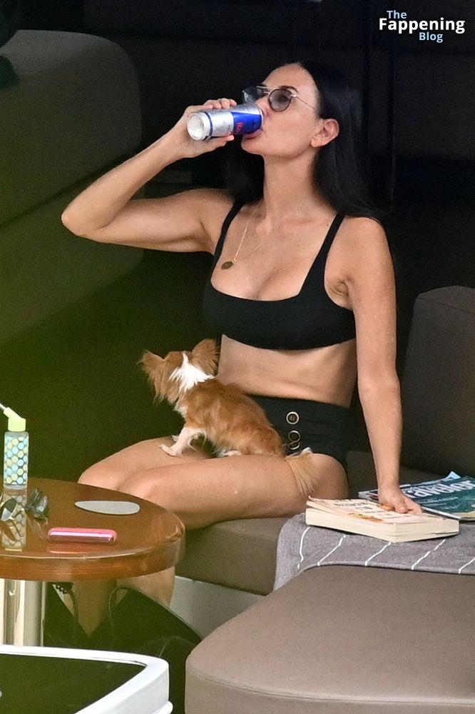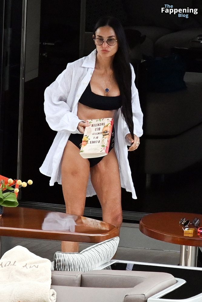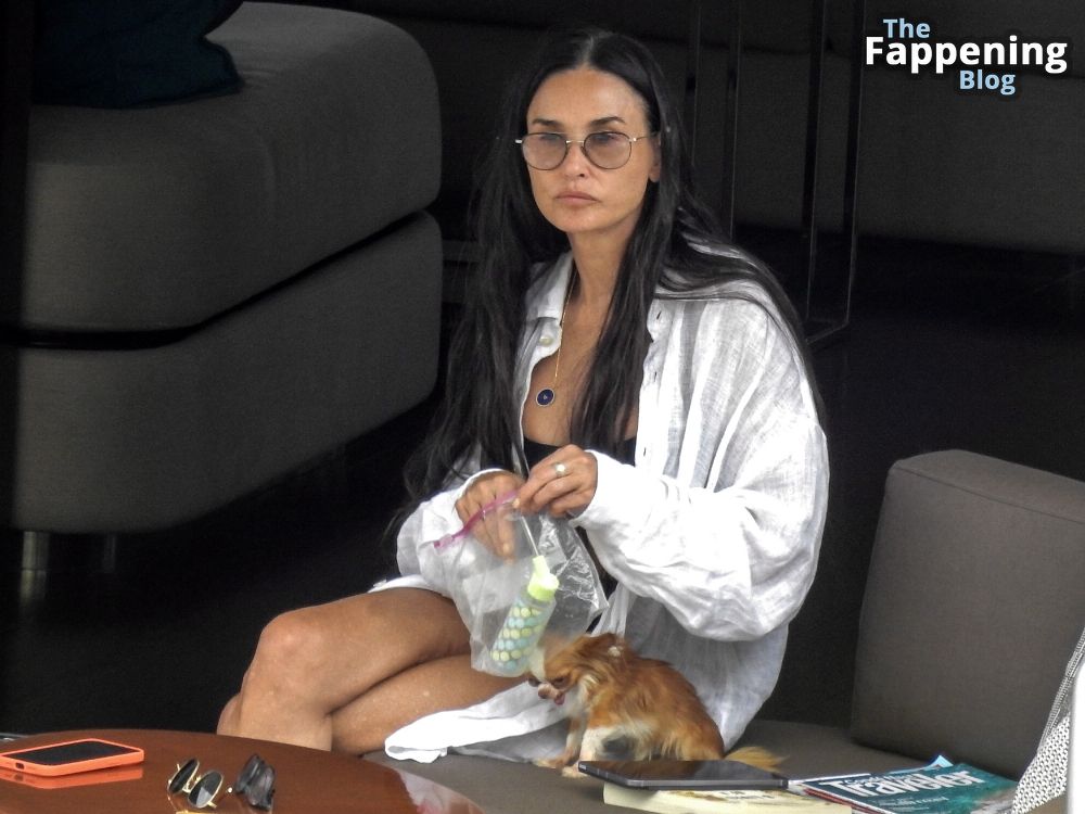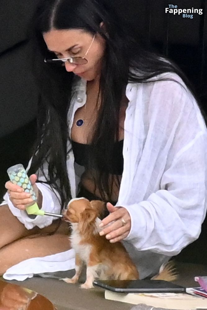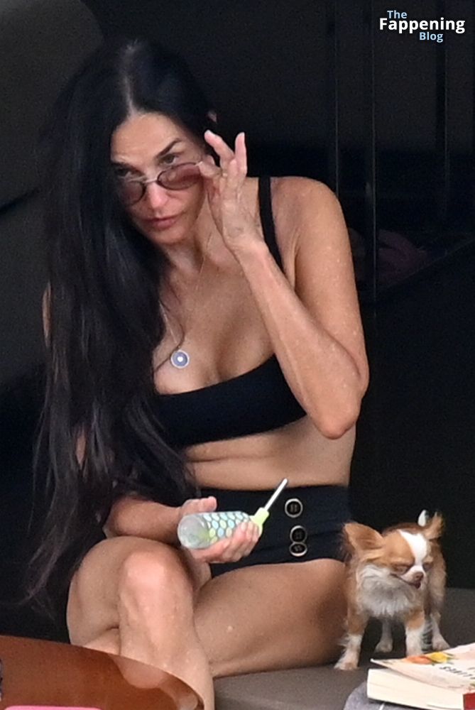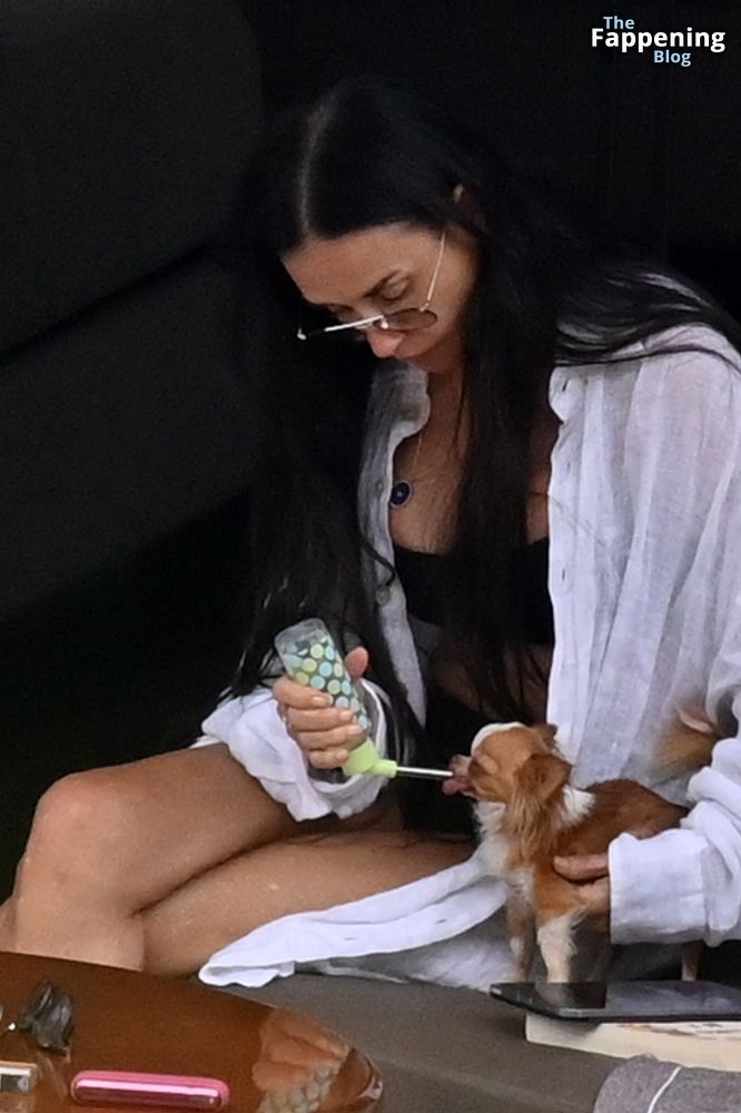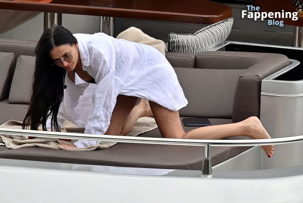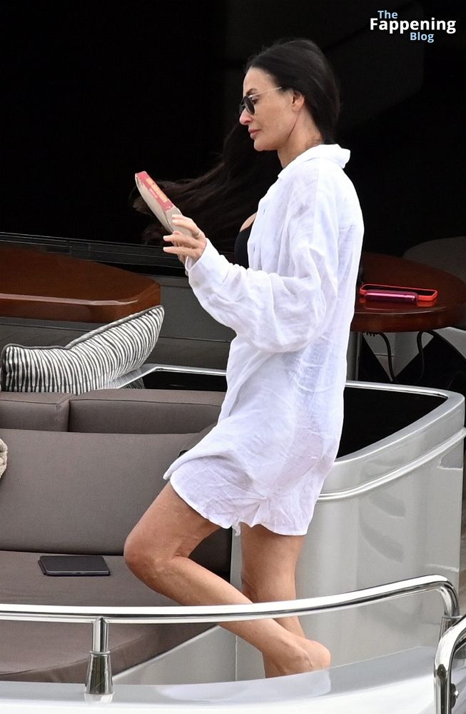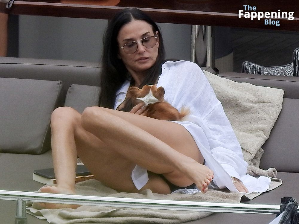 Demi Moore est chic dans un maillot de bain noir taille haute alors qu’elle poursuit ses vacances en Grèce à bord d’un yacht de luxe avec son chien adoré Pilaf, 08/12/2023.