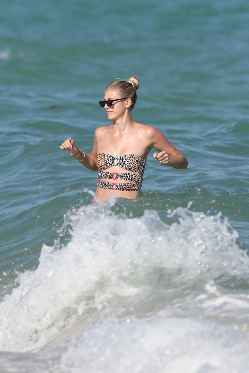 La belle mannequin de Victoria’s Secret portait ses cheveux relevés en chignon et mettait en valeur sa silhouette avec un motif léopard et des boucles néon. Gabby, qui venait d’arriver d’un vol, portait un simple bikini noir.