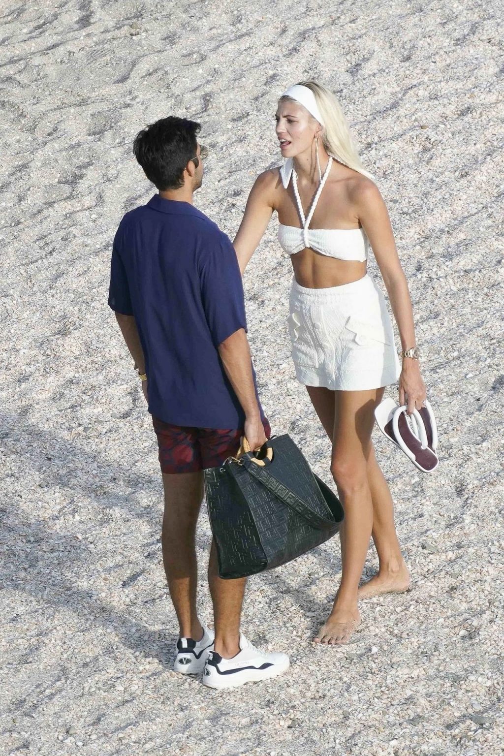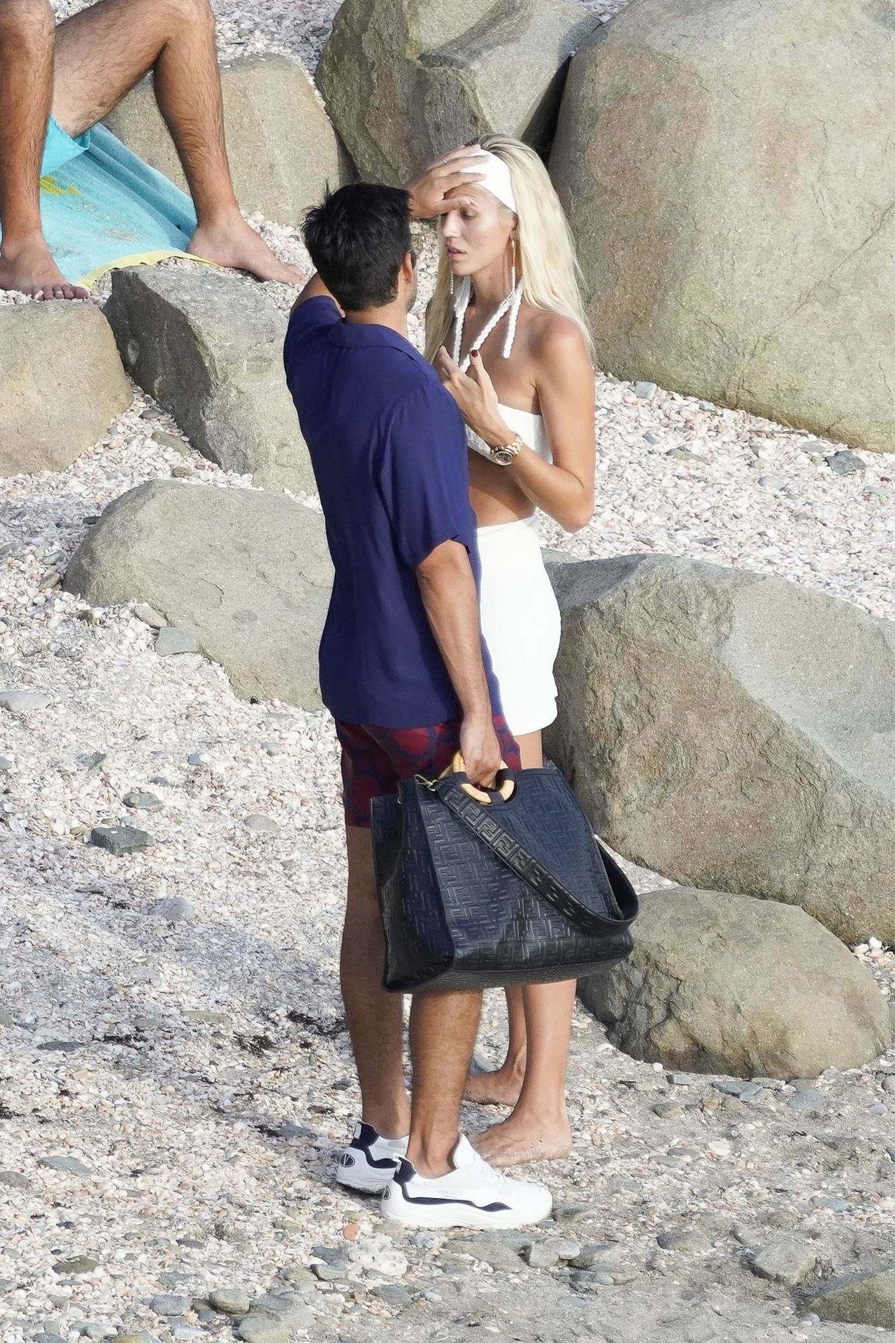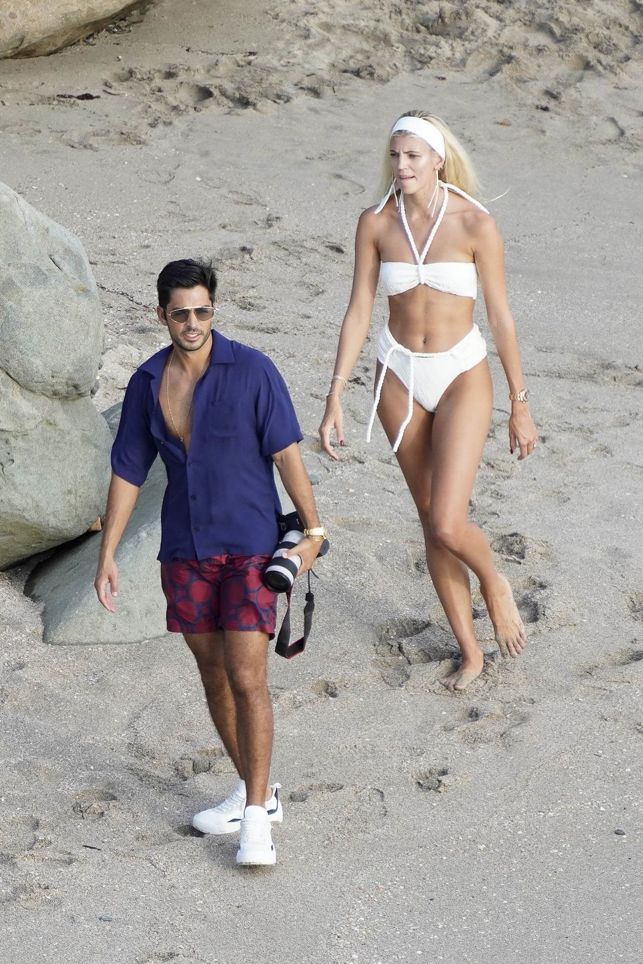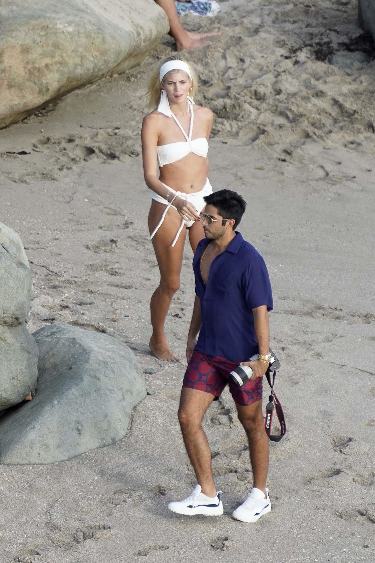 Le mannequin Devon Windsor met en valeur sa silhouette dans un bikini blanc alors qu’elle et son mari Johnny Barbara célèbrent leur premier anniversaire de mariage à St. Barts, 14/11/2020.
