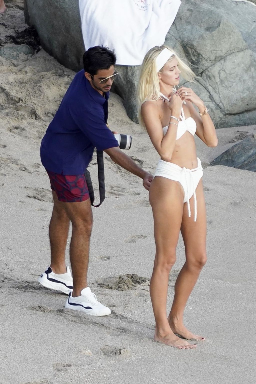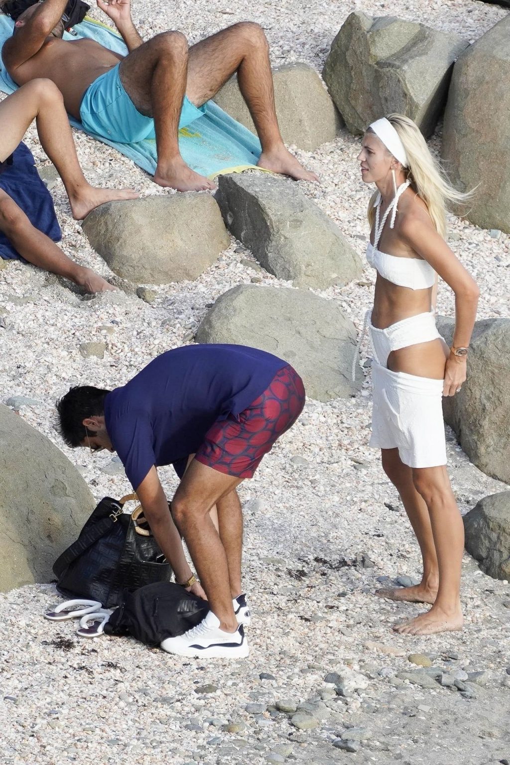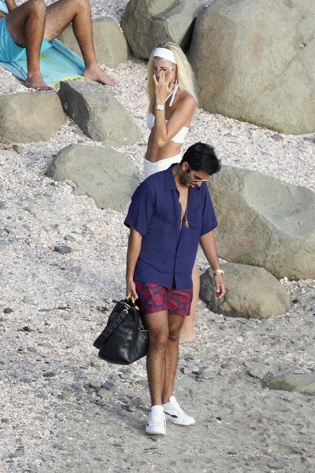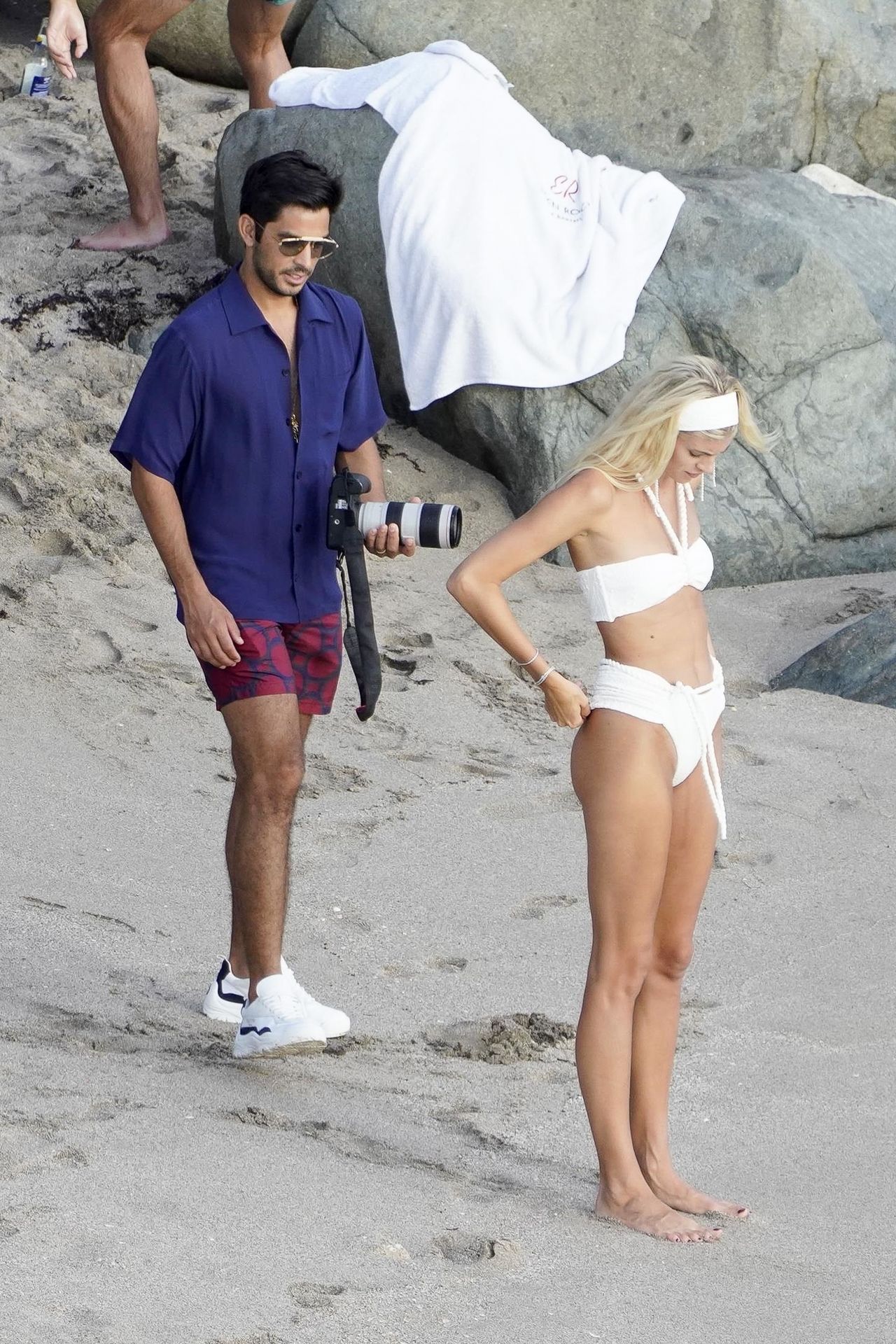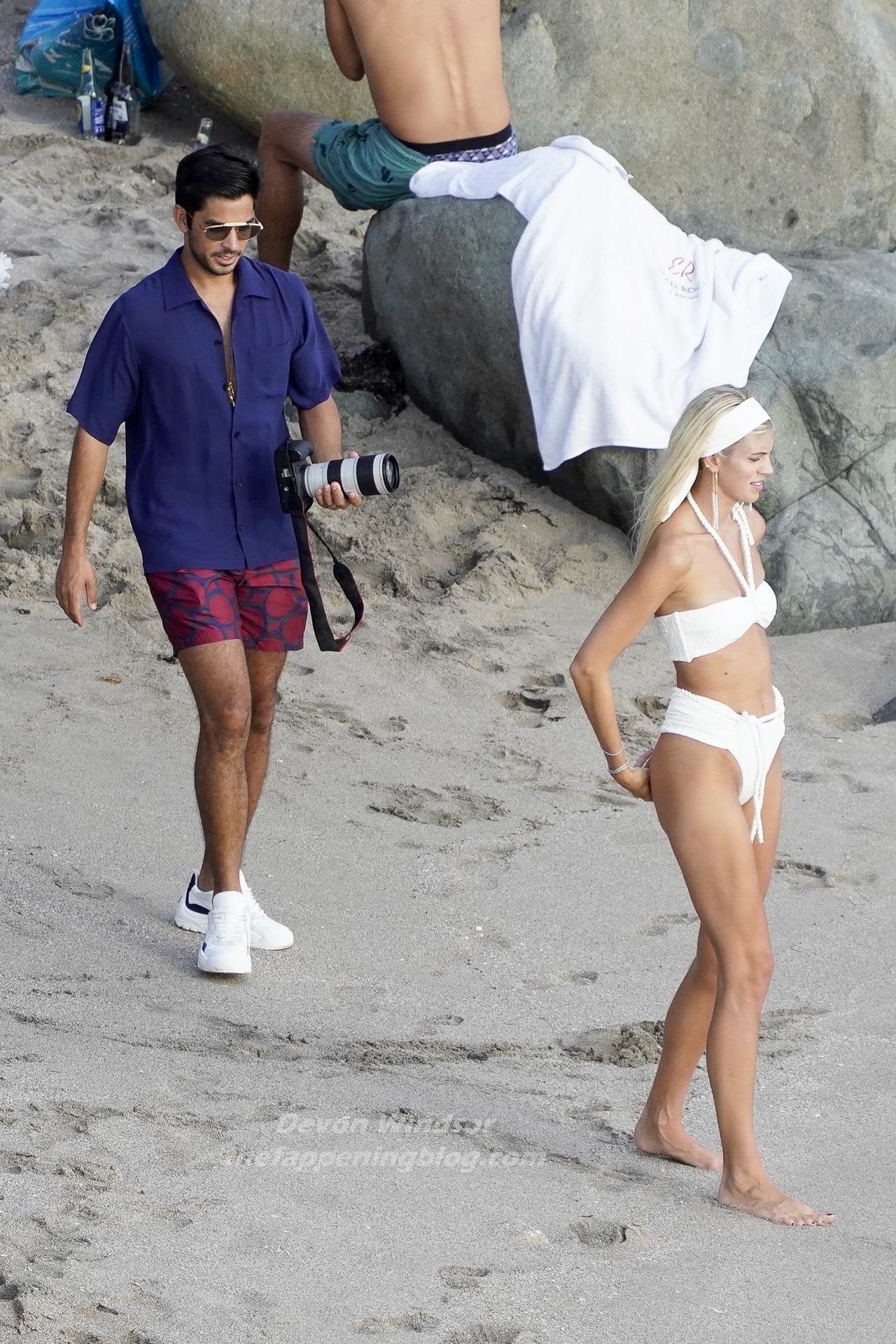 Le mannequin Devon Windsor met en valeur sa silhouette dans un bikini blanc alors qu’elle et son mari Johnny Barbara célèbrent leur premier anniversaire de mariage à St. Barts, 14/11/2020.