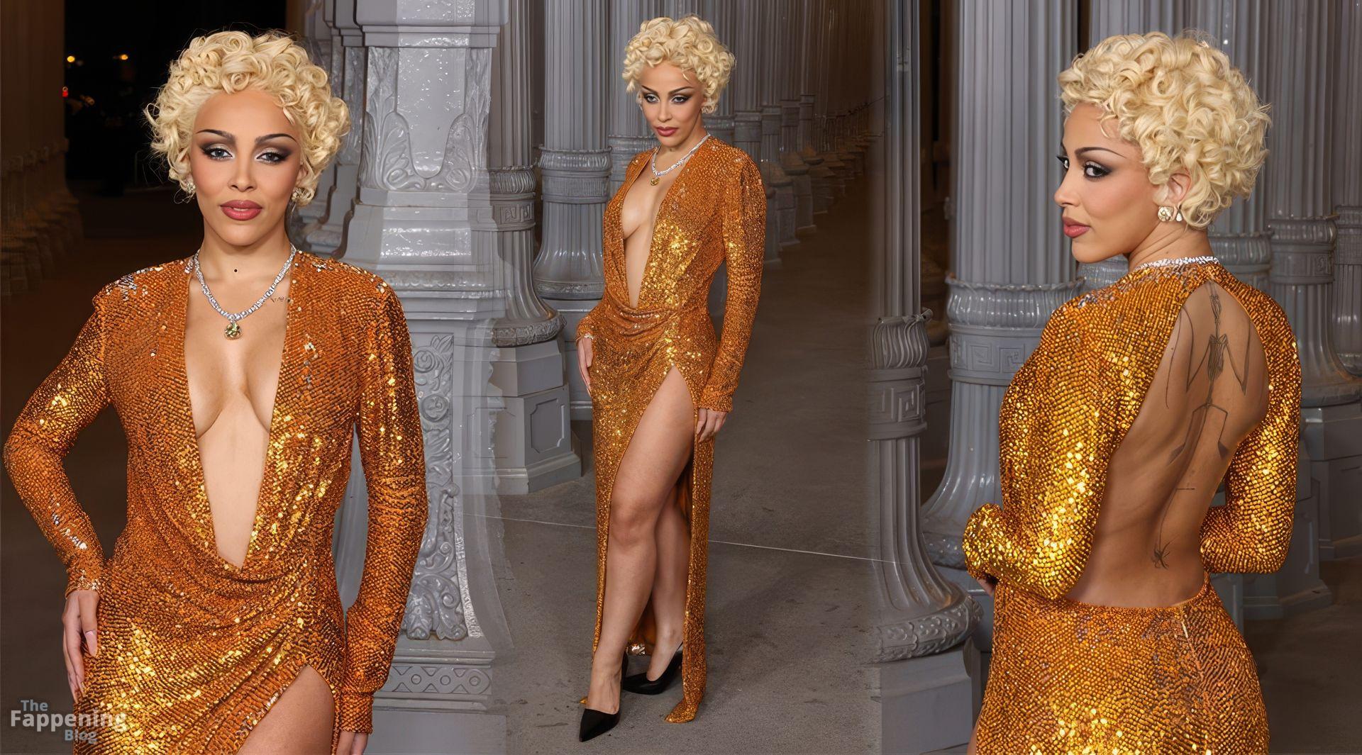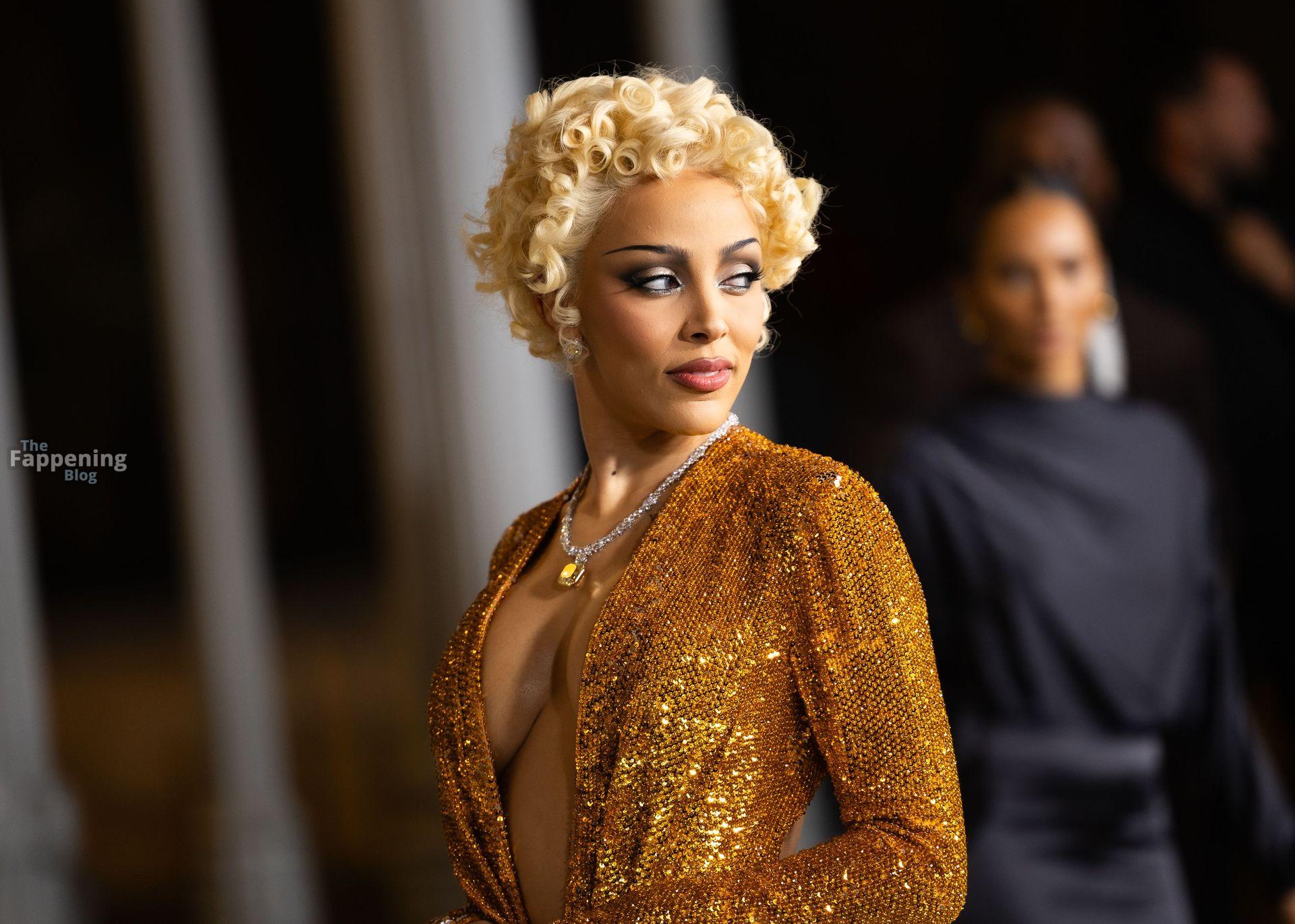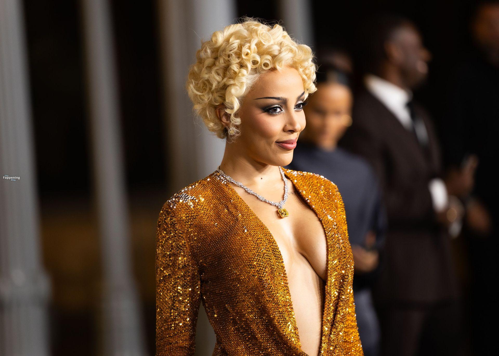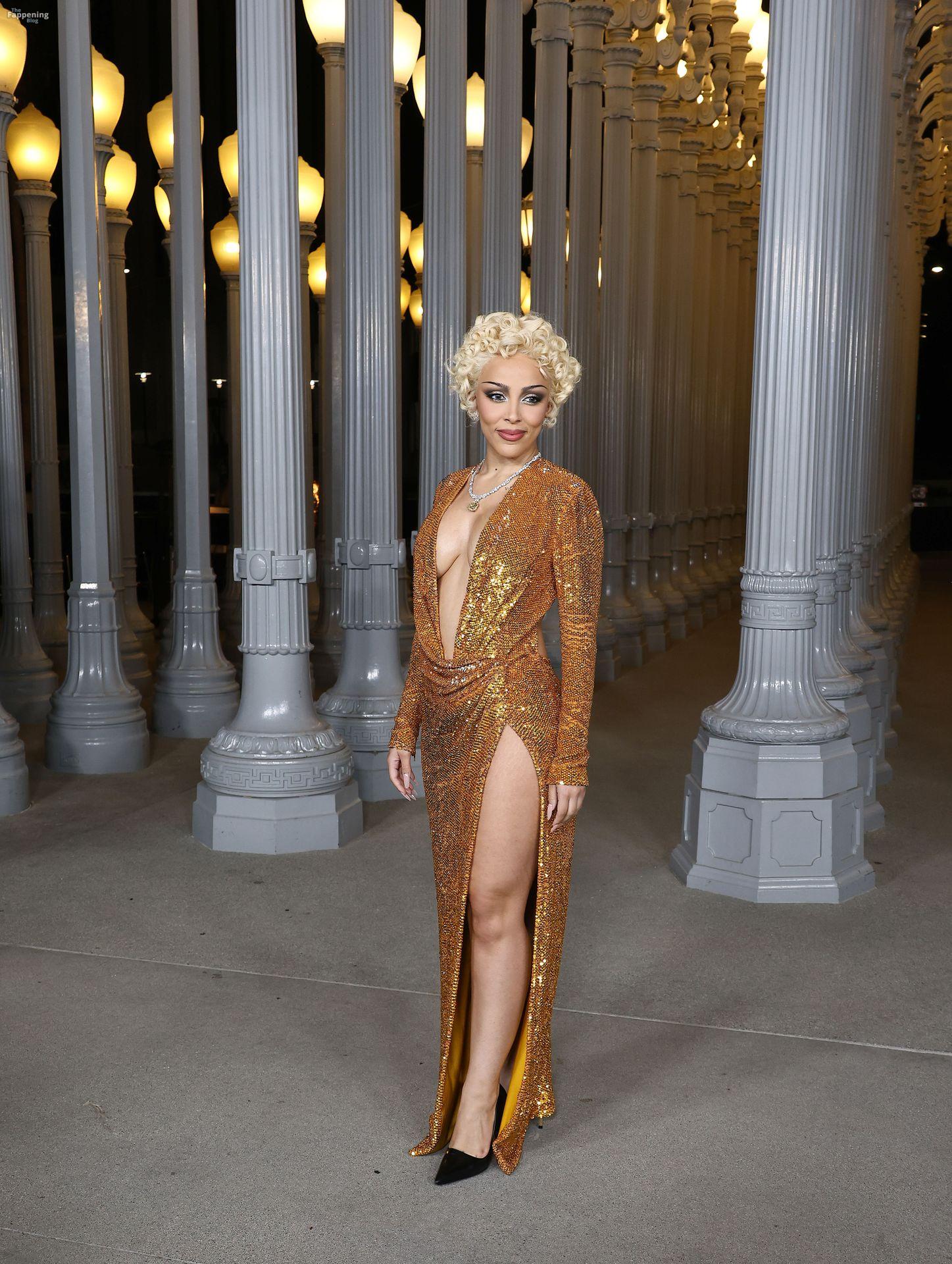 Doja Cat est apparue au gala Art+Film 2025 du LACMA à Los Angeles, en Californie, vêtue de Gucci. L’événement rendait hommage au réalisateur Ryan Coogler et à l’artiste Mary Corse. Doja portait une robe Gucci en or fondu avec un décolleté plongeant et une fente haute sur la cuisse, coiffée de boucles mêlant Marilyn à Madonna.
