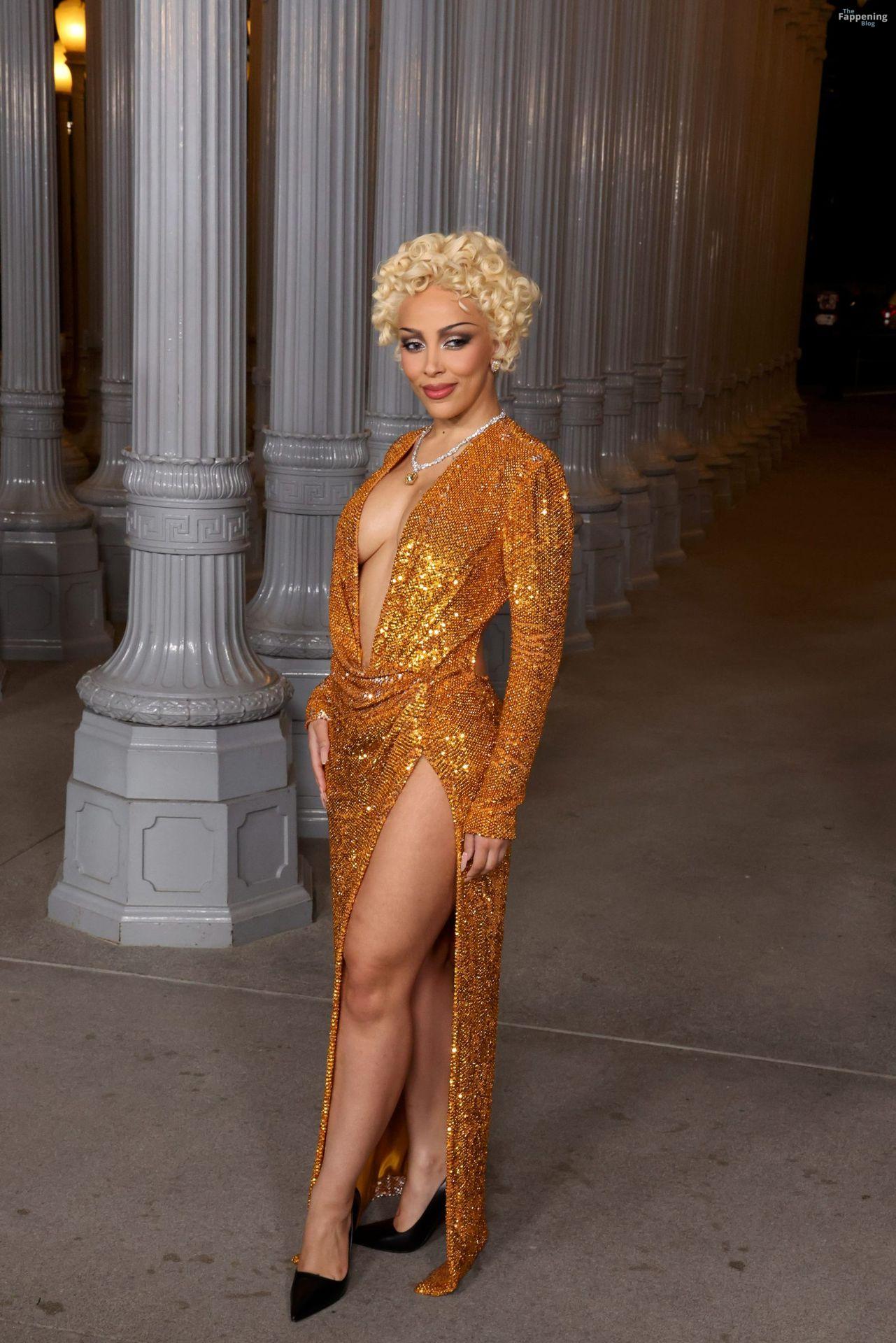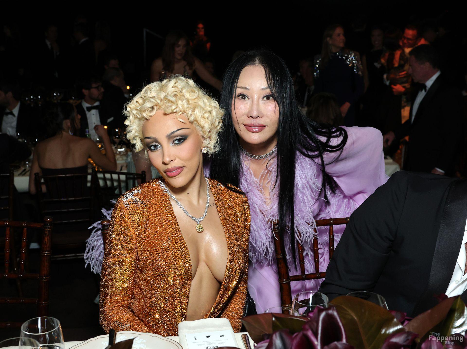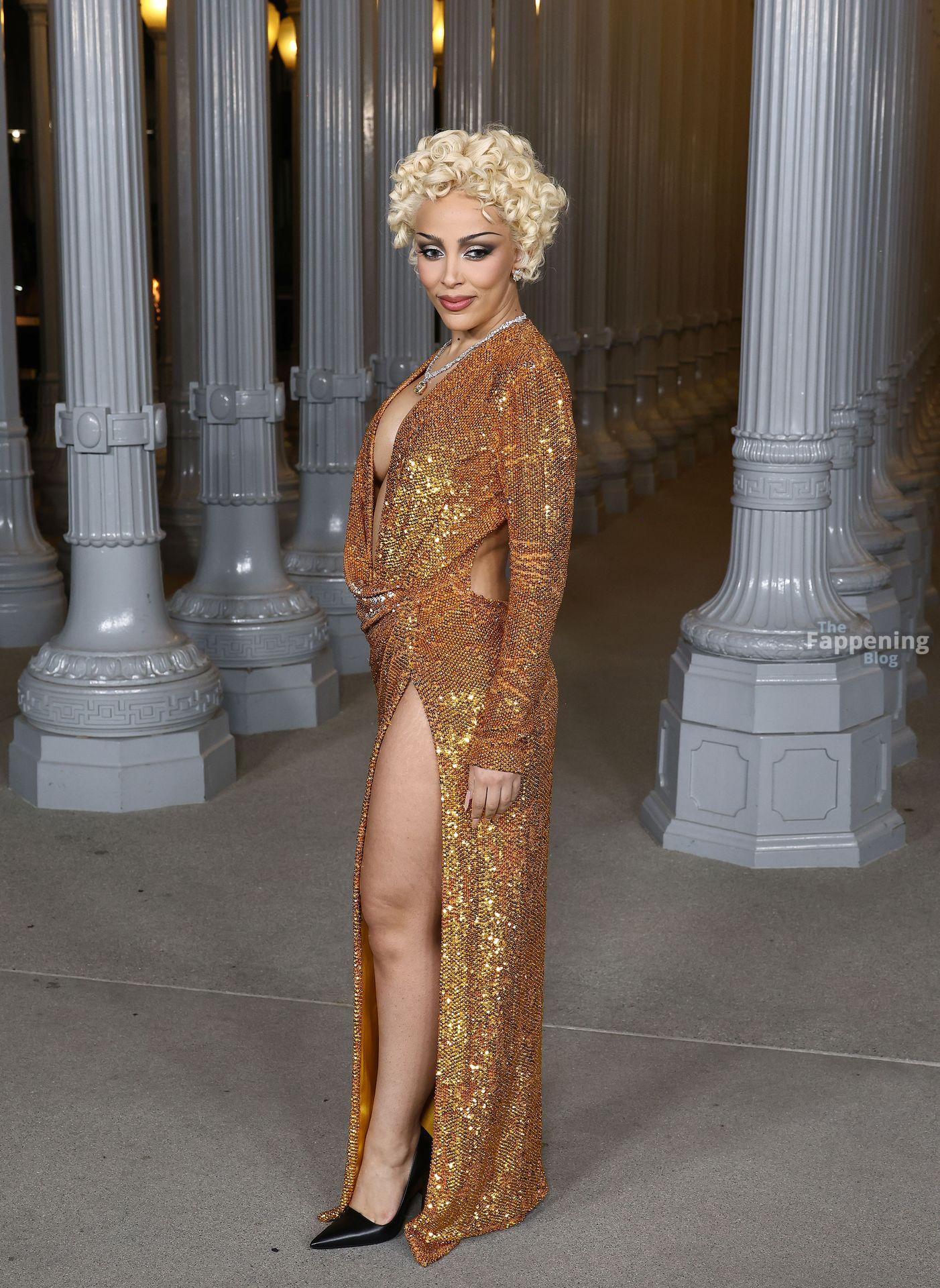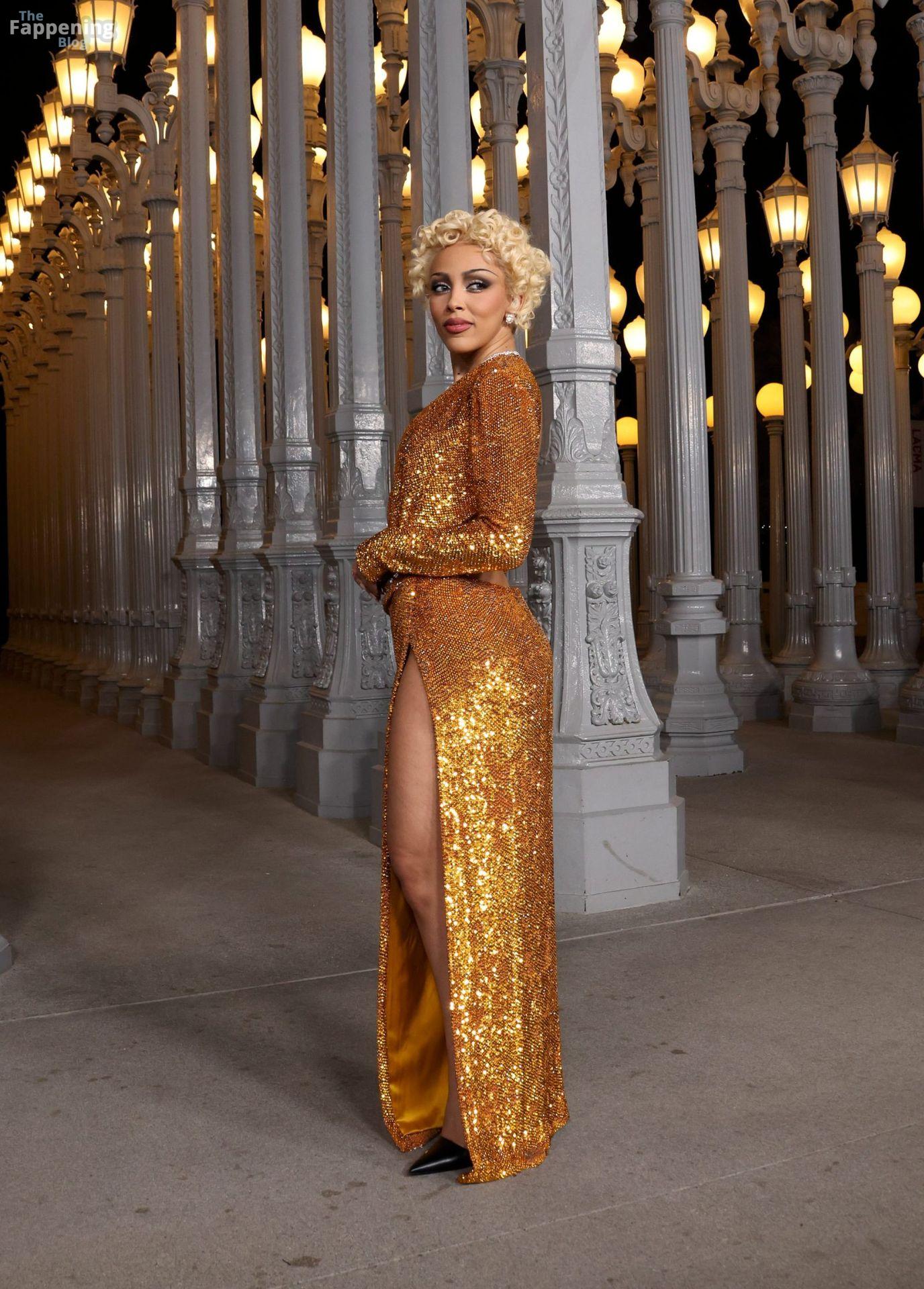 Doja Cat est apparue au gala Art+Film 2025 du LACMA à Los Angeles, en Californie, vêtue de Gucci. L’événement rendait hommage au réalisateur Ryan Coogler et à l’artiste Mary Corse. Doja portait une robe Gucci en or fondu avec un décolleté plongeant et une fente haute sur la cuisse, coiffée de boucles mêlant Marilyn à Madonna.