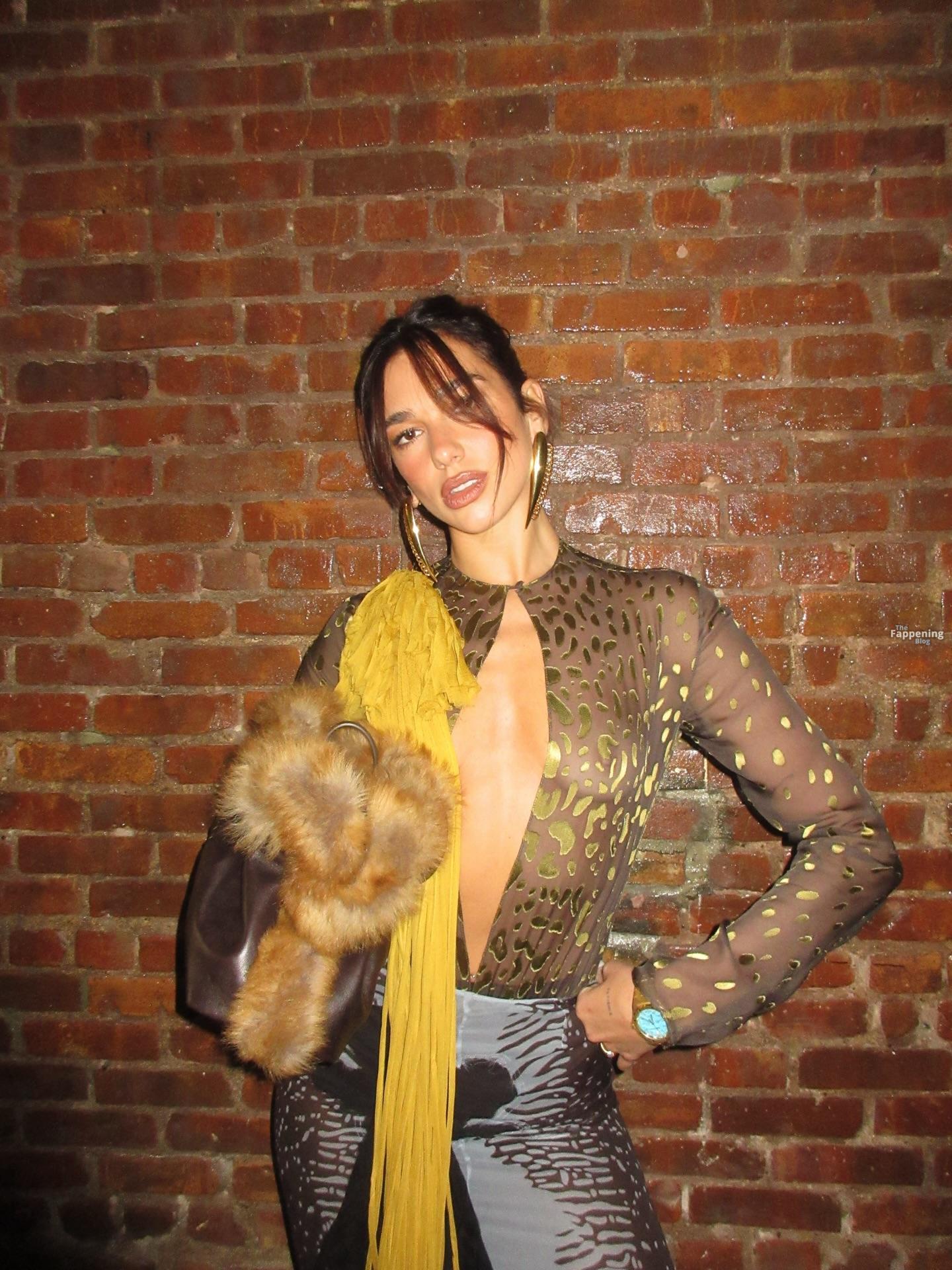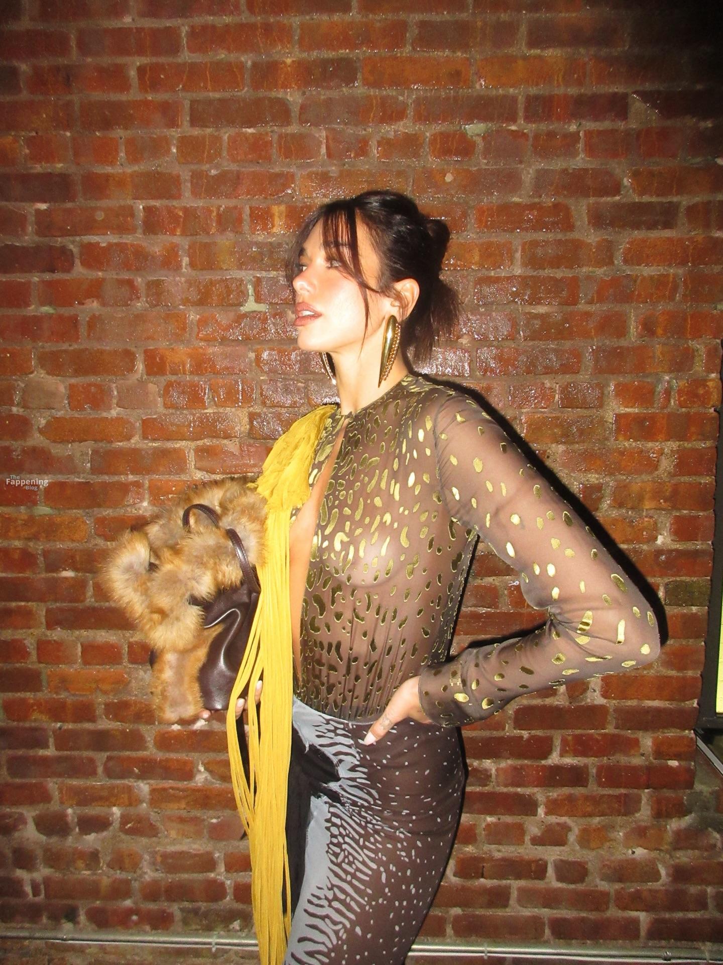 La chanteuse Dua Lipa est complètement sans soutien-gorge dans un haut transparent qui ne cache rien – seins dehors, tétons durs complètement visibles.