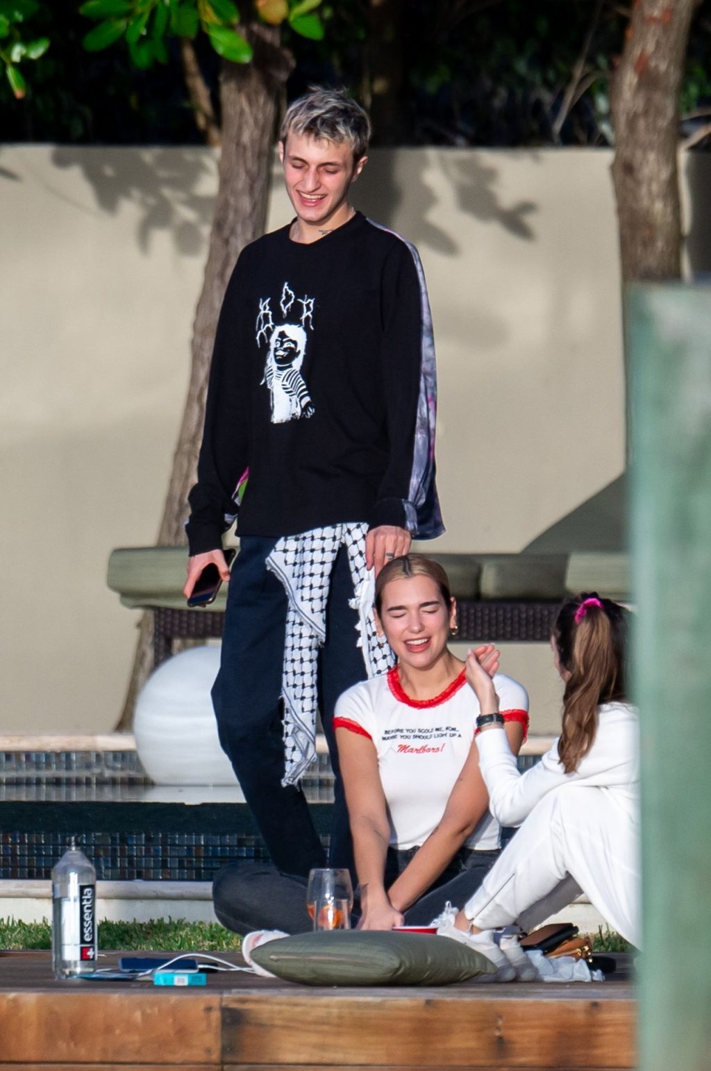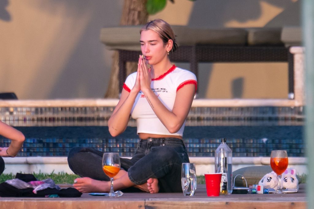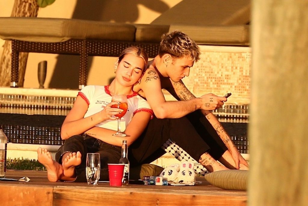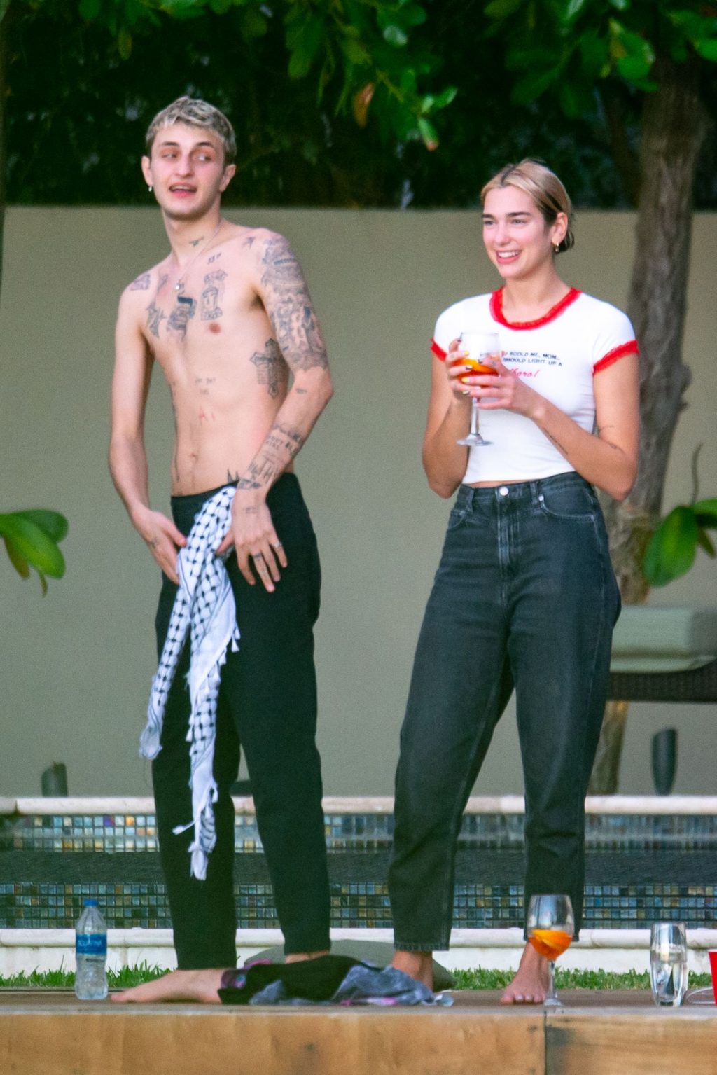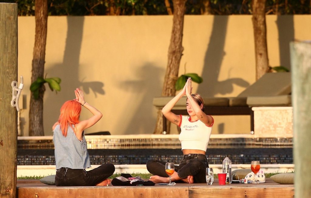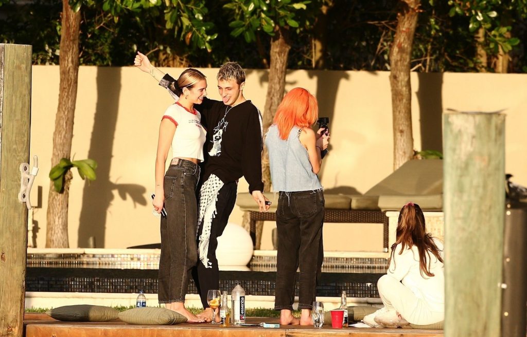 Anwar Hadid et Dua Lipa sont amoureux tout en profitant de la fin de l’année au bord de la piscine à Miami Beach, le 30/12/2019. La chanteuse savoure des boissons et fait du yoga au bord de la piscine avec des amis pendant la soirée apaisante.