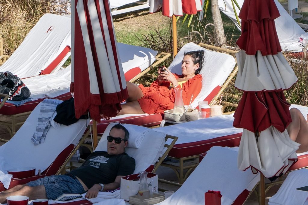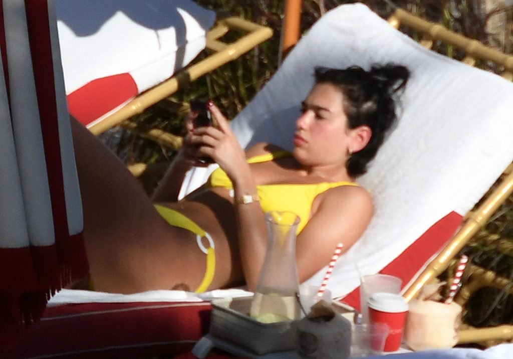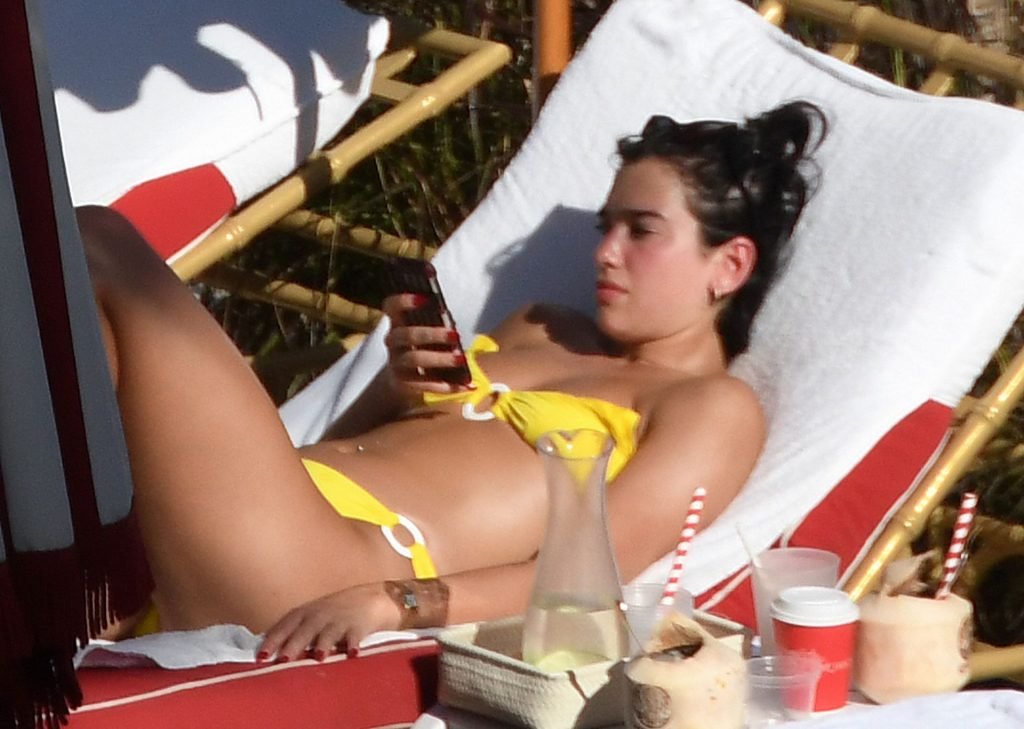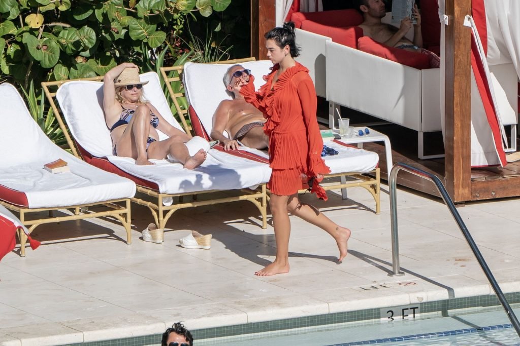 La chanteuse Dua Lipa a été vue en train de se détendre avec une amie au bord de la piscine de l’hôtel Faena à Miami Beach, le 31/12/2018.