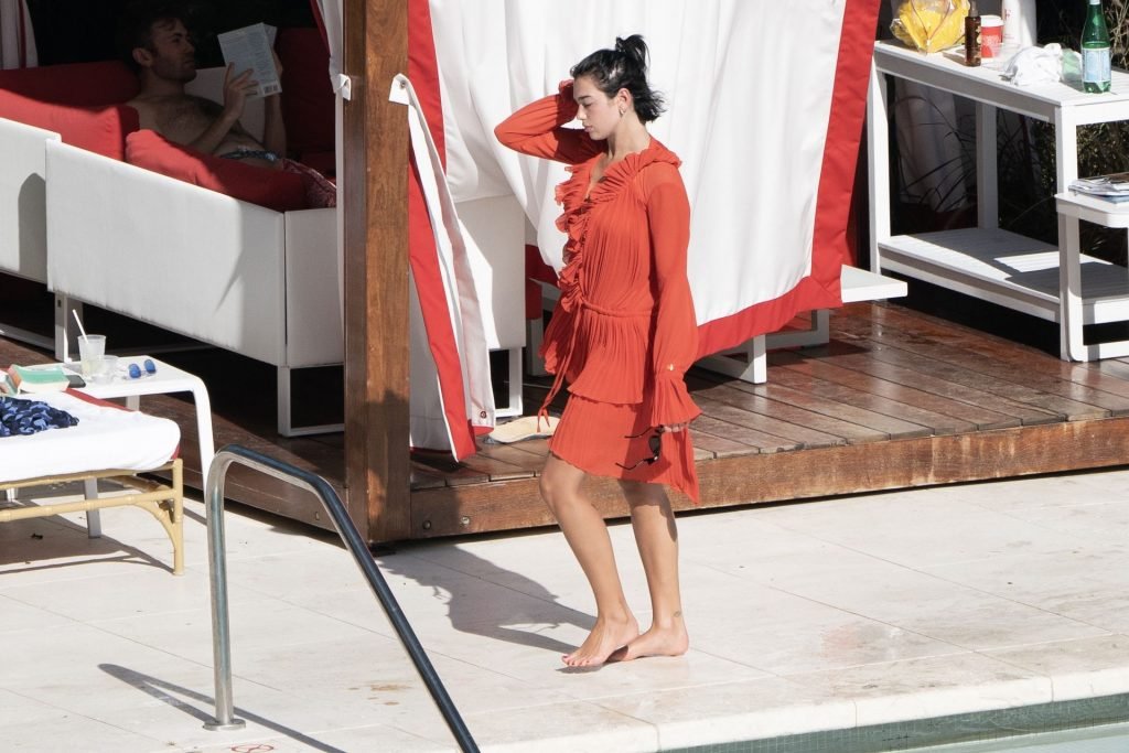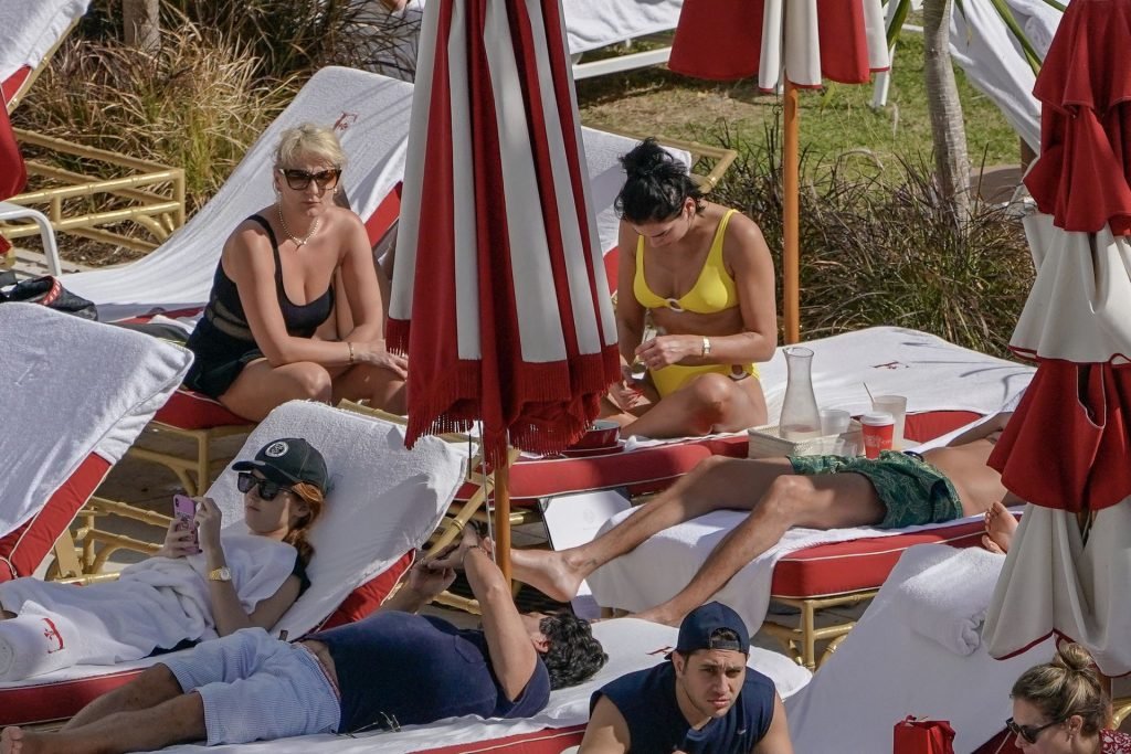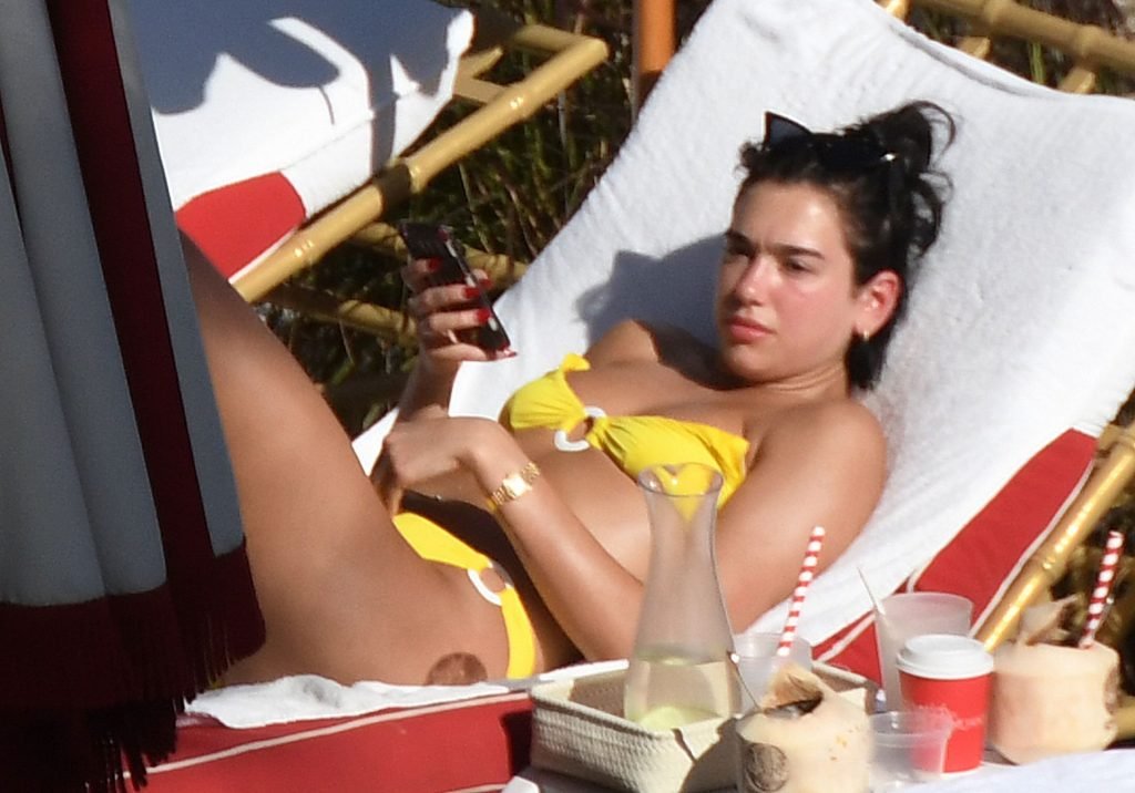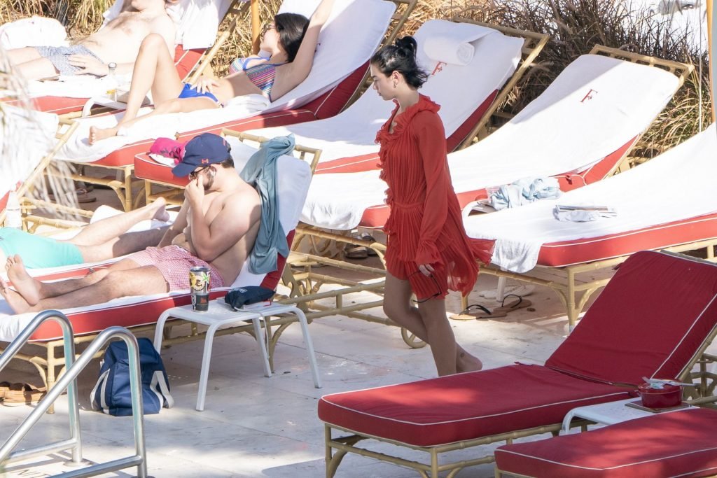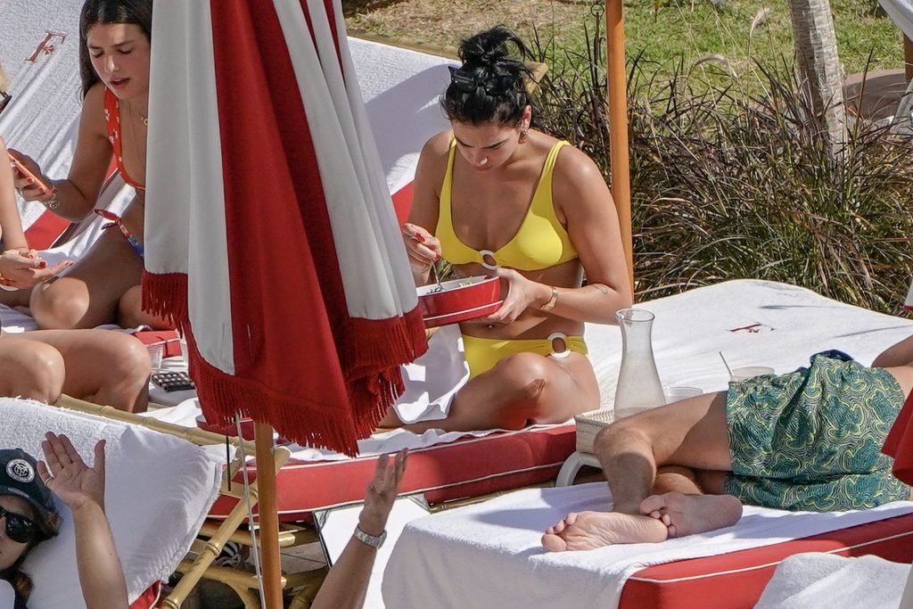 La chanteuse Dua Lipa a été vue en train de se détendre avec une amie au bord de la piscine de l’hôtel Faena à Miami Beach, le 31/12/2018.