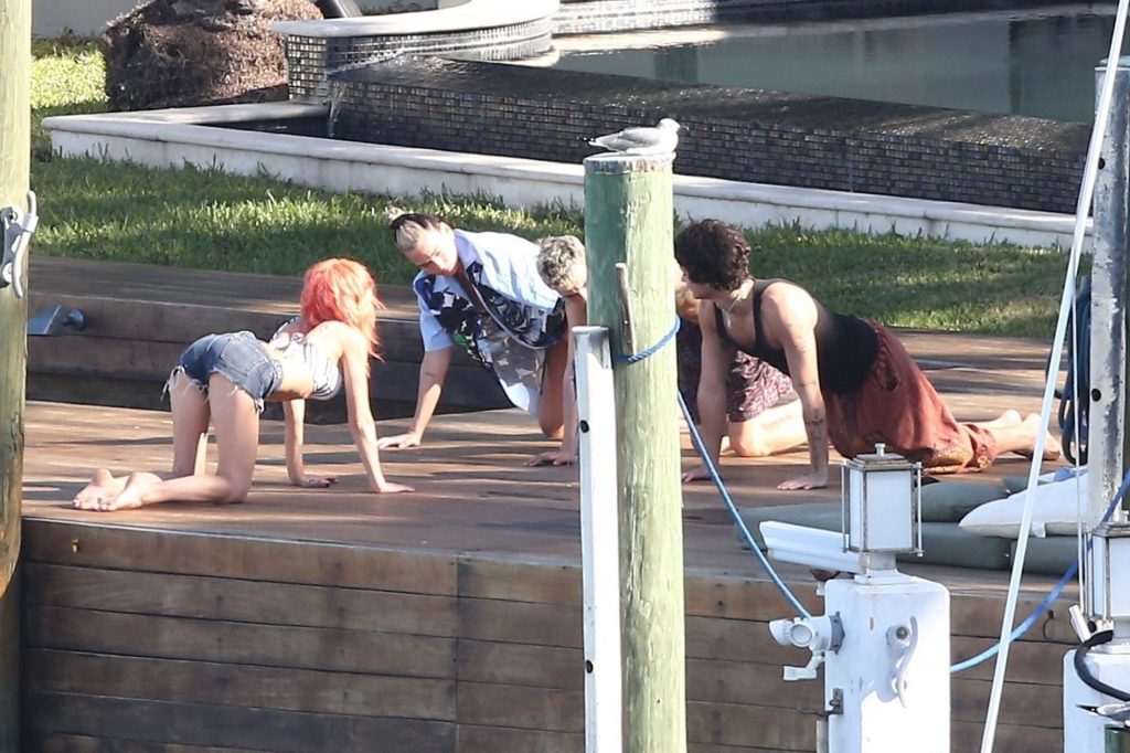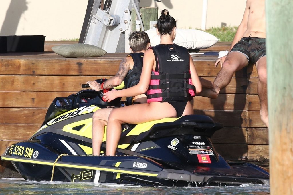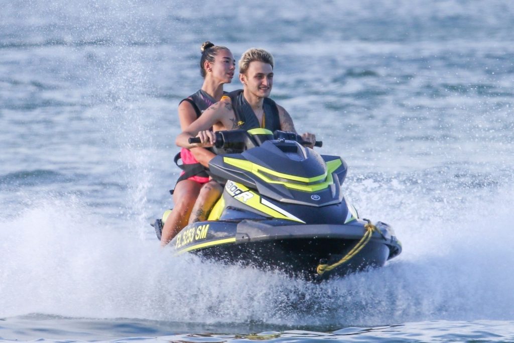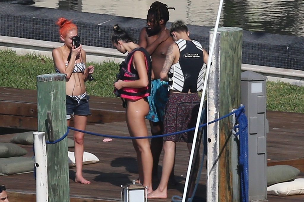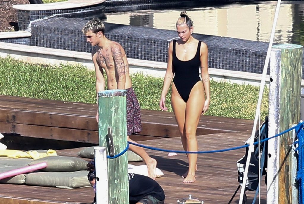 C’est vendredi… la chanteuse Dua Lipa et son petit ami Anwar Hadid prennent de l’avance pour le week-end avec du yoga et du jet-ski à Miami avec des amis, 01/03/2020.