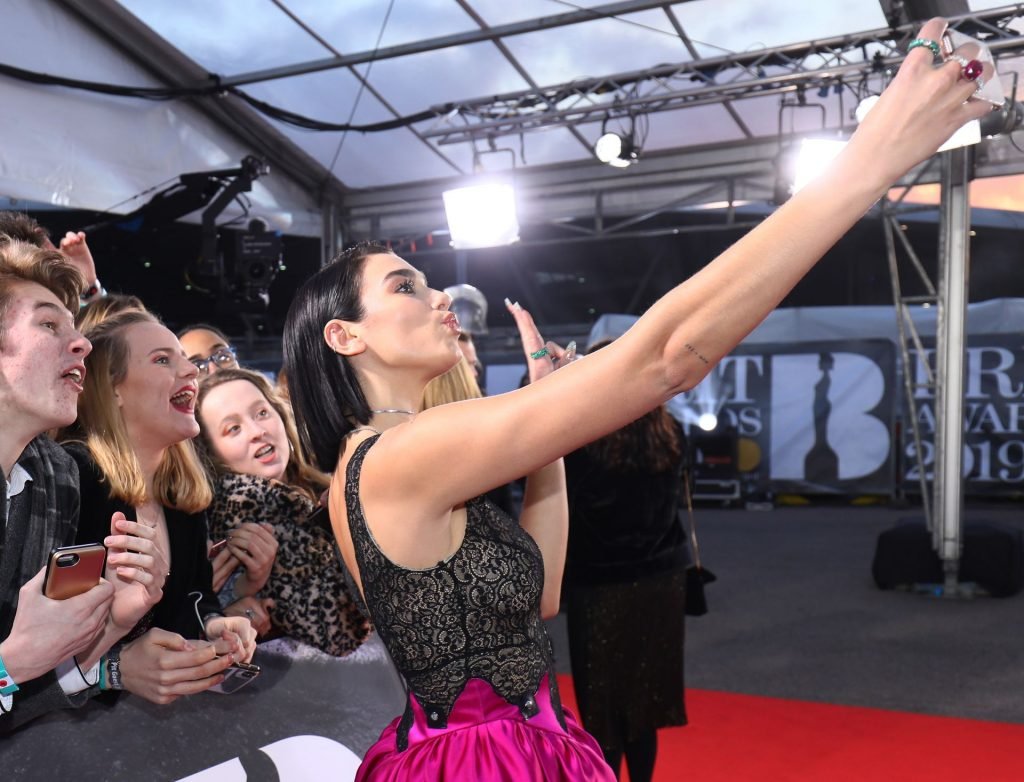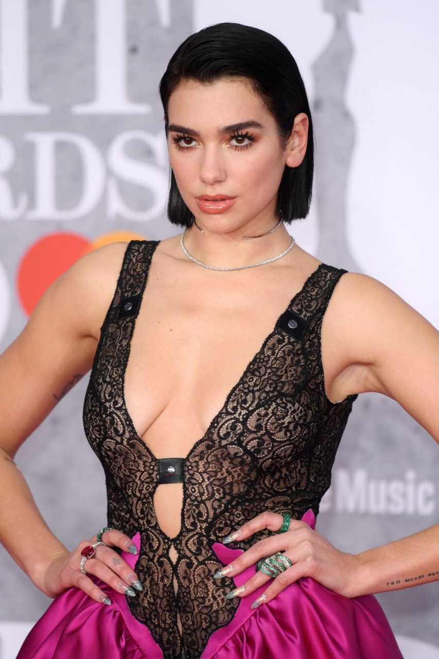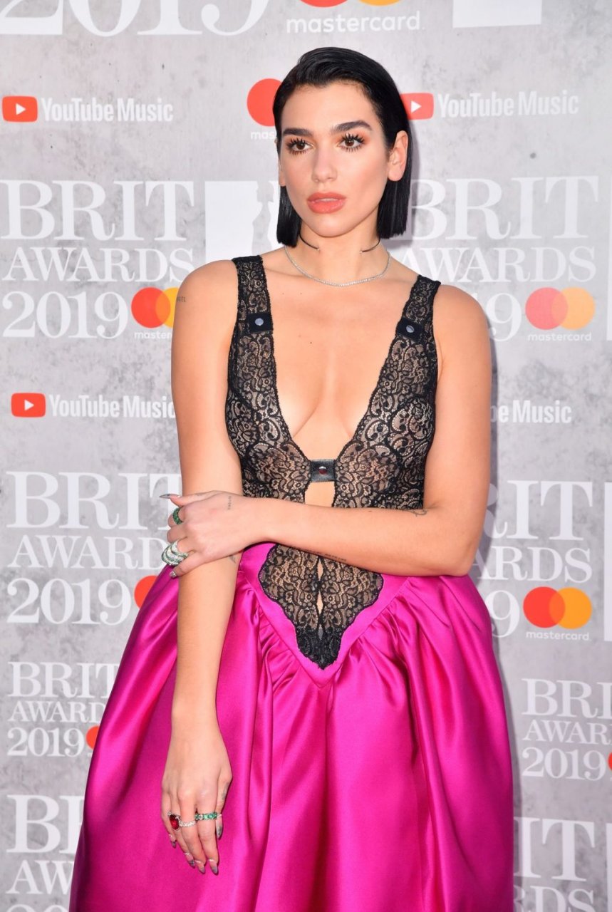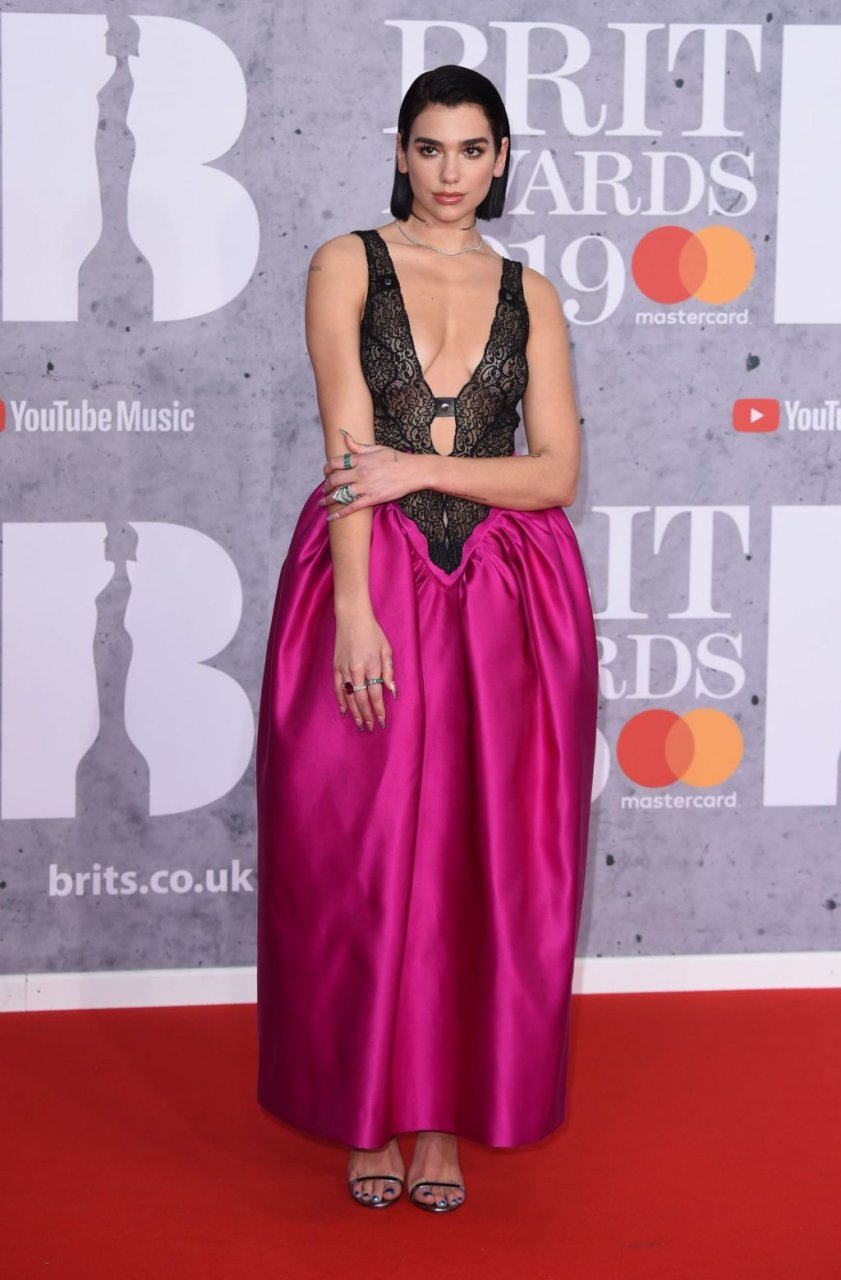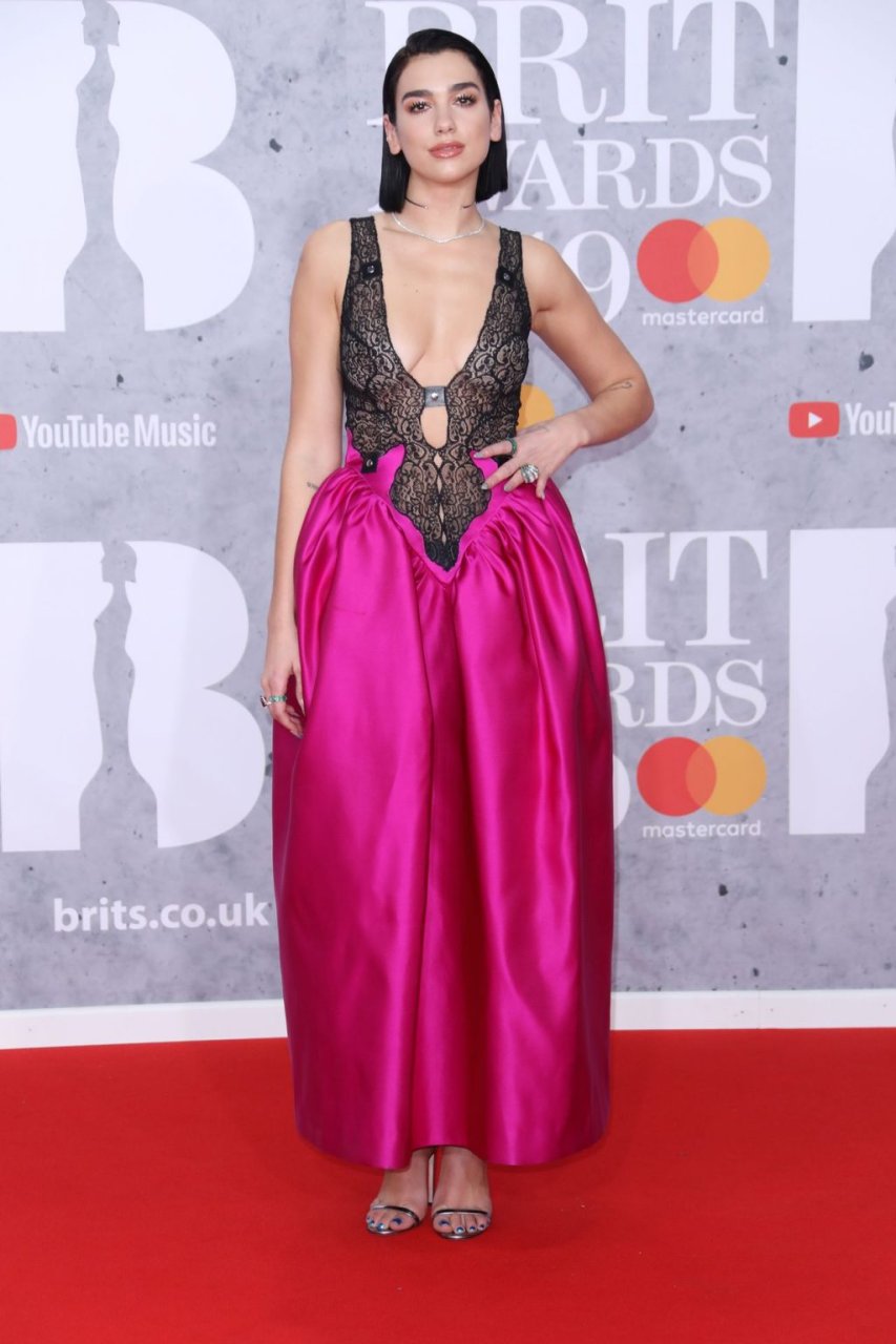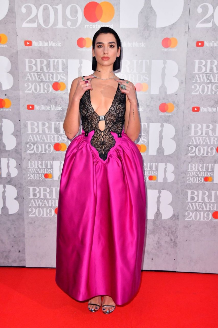 La chanteuse Dua Lipa a montré son décolleté en portant une robe rose et noire aux Brit Awards à l’O2 Arena de Londres, le 20/02/2019.