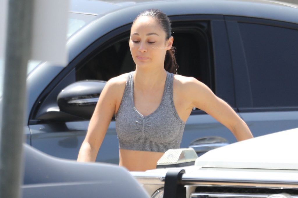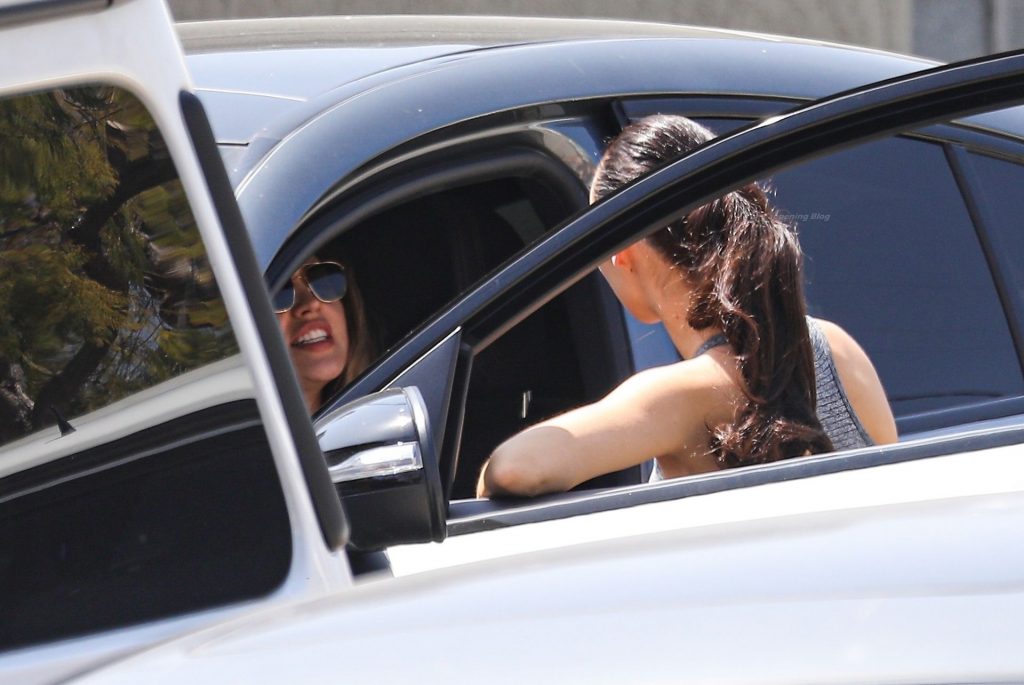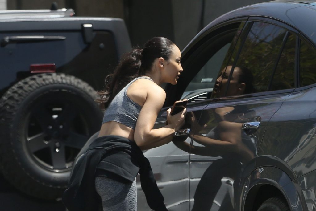 Les actrices Eiza Gonzalez et Cara Santana ont une petite conversation après une autre séance d’entraînement intense à Los Angeles, ce matin.