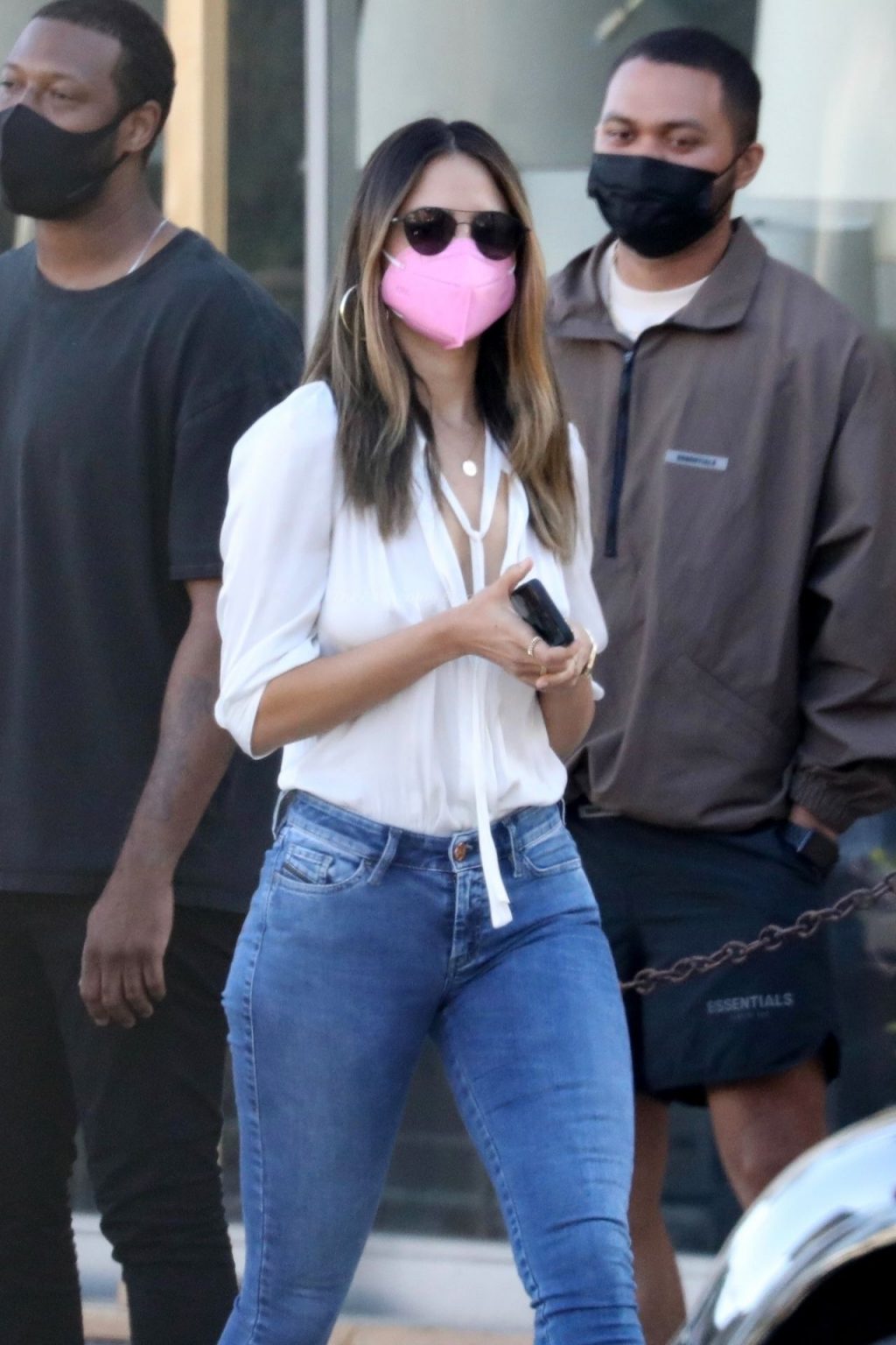 Actrice Eiza Gonzalez est vue quittant le 40 Love en début de soirée après avoir passé du temps avec des amis autour d’un dîner tôt au pub, 03/04/2021. Eiza portait un masque rose vif promouvant l’utilisation continue des masques.