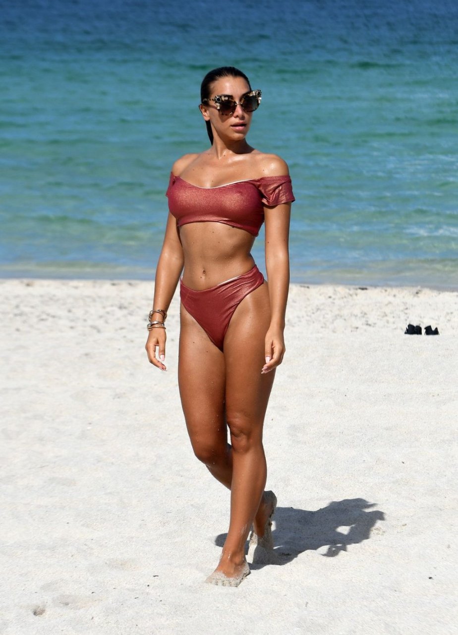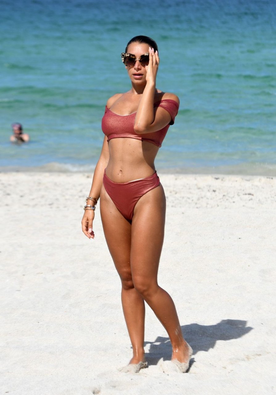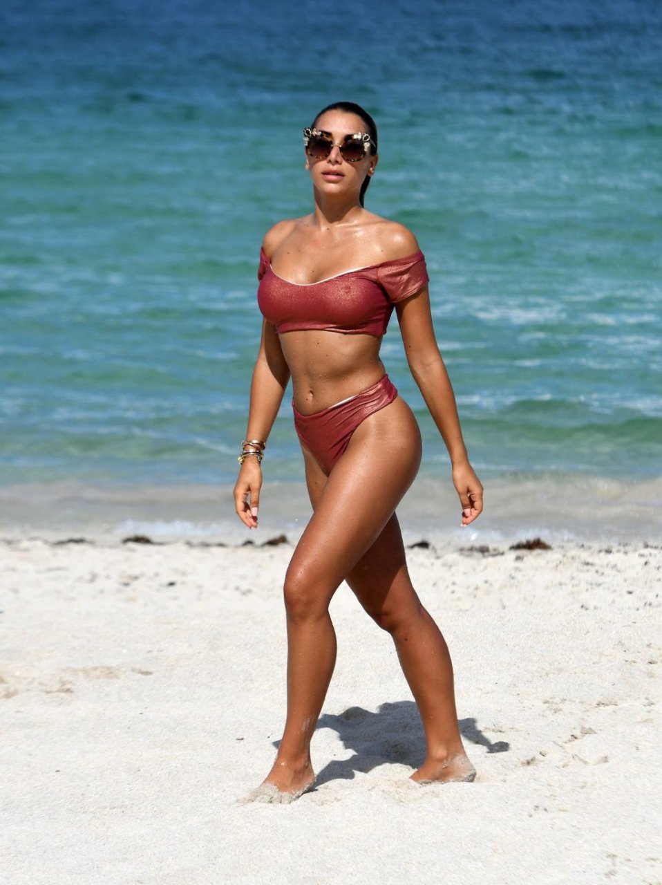 Le mannequin italienne pulpeuse Elisa De Panicis Agnelli exhibe ses courbes dans un bikini rose sur la plage de Miami, 11/07/2019.