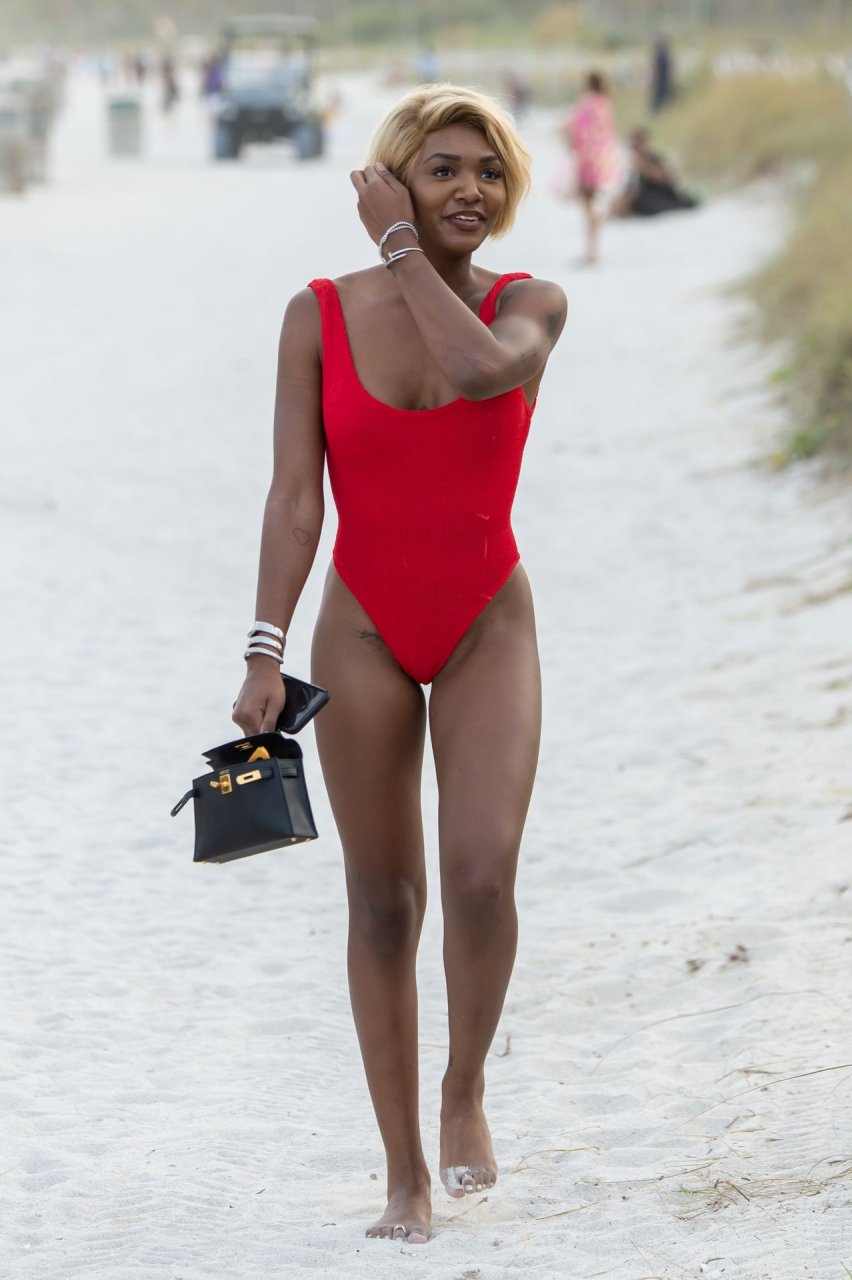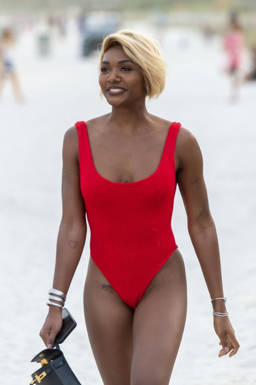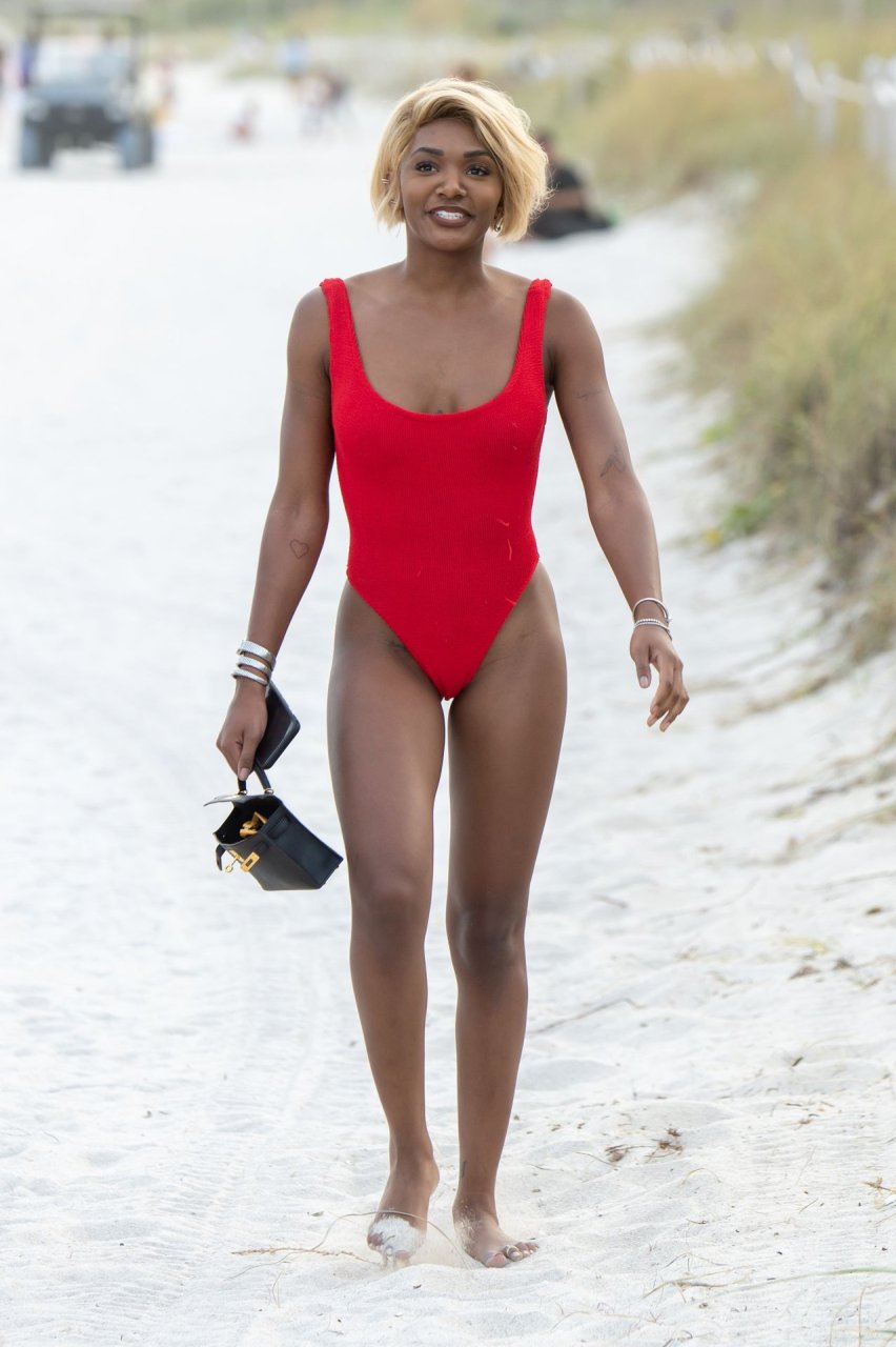 La fille de Magic Johnson, Elisa (24 ans), a été vue portant un maillot de bain rouge vif à Miami Beach, le 01/01/2019.