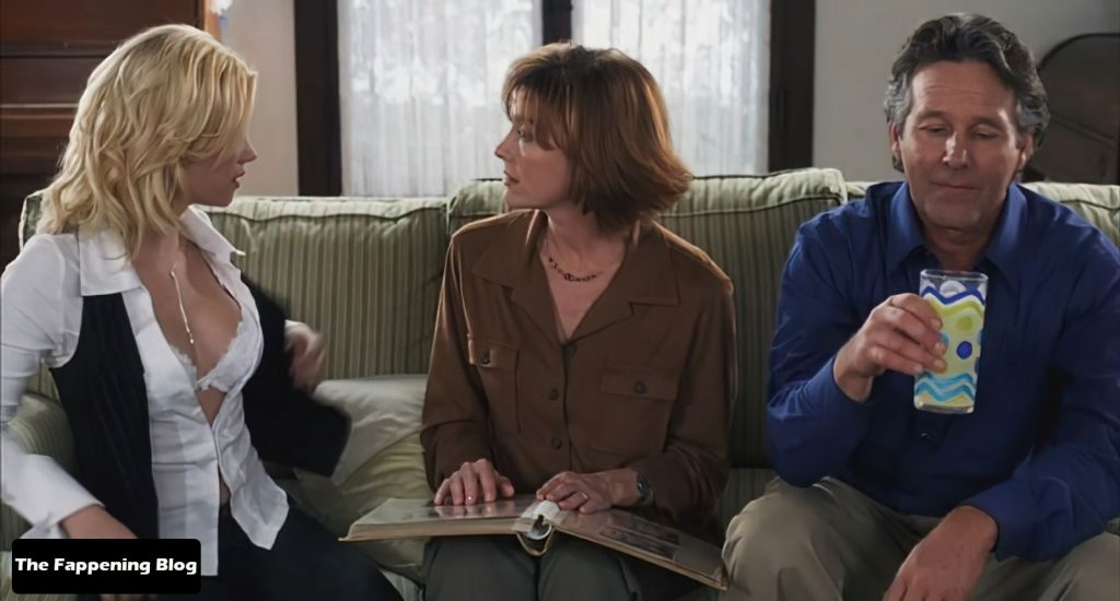 Elisha Cuthbert of “Old School” fame is doing an interview and posing in a white see-through top with a red bra underneath and then wearing a white tanktop with hard nipples during a clip from her TV show “24”.
