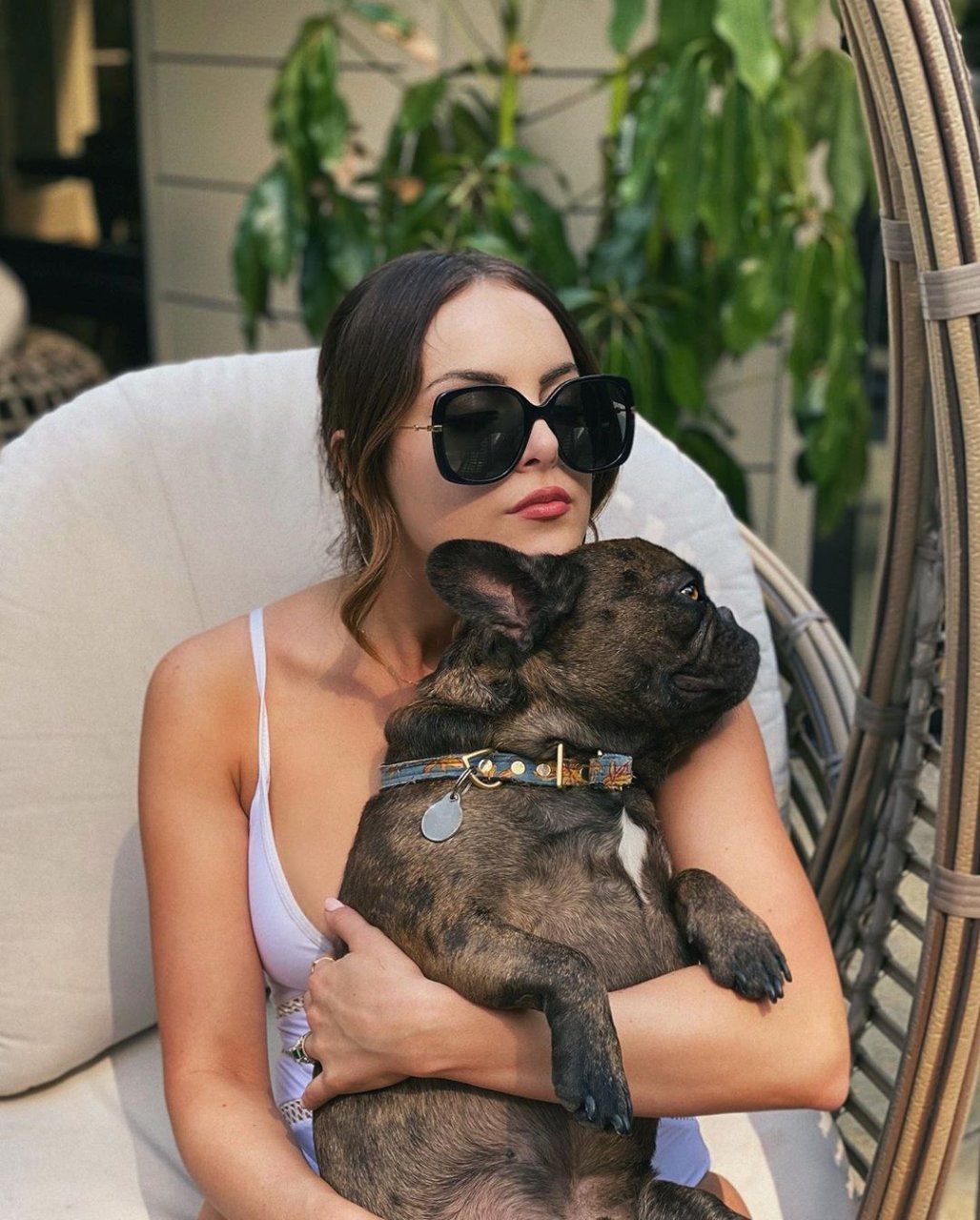 L’actrice/chanteuse américaine Elizabeth Gillies montre son profond décolleté et son chien Otis sur Instagram, 29/09/2019.