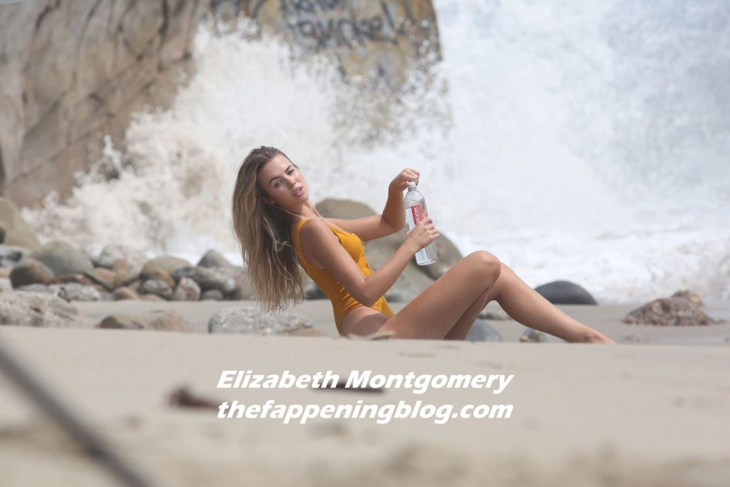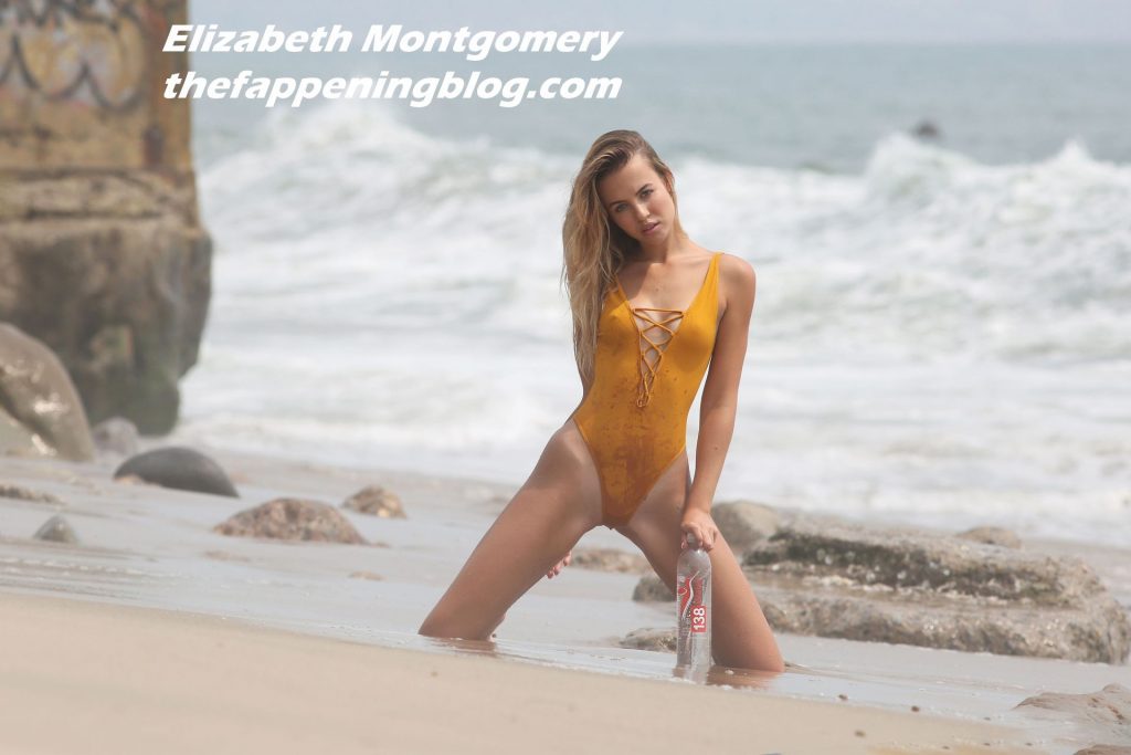 Le mannequin de mode Elizabeth Montgomery porte une veste en cuir associée à un maillot de bain une pièce et un fedora sur le plateau de la dernière séance photo 138 Water à Malibu, le 26/08/2020.