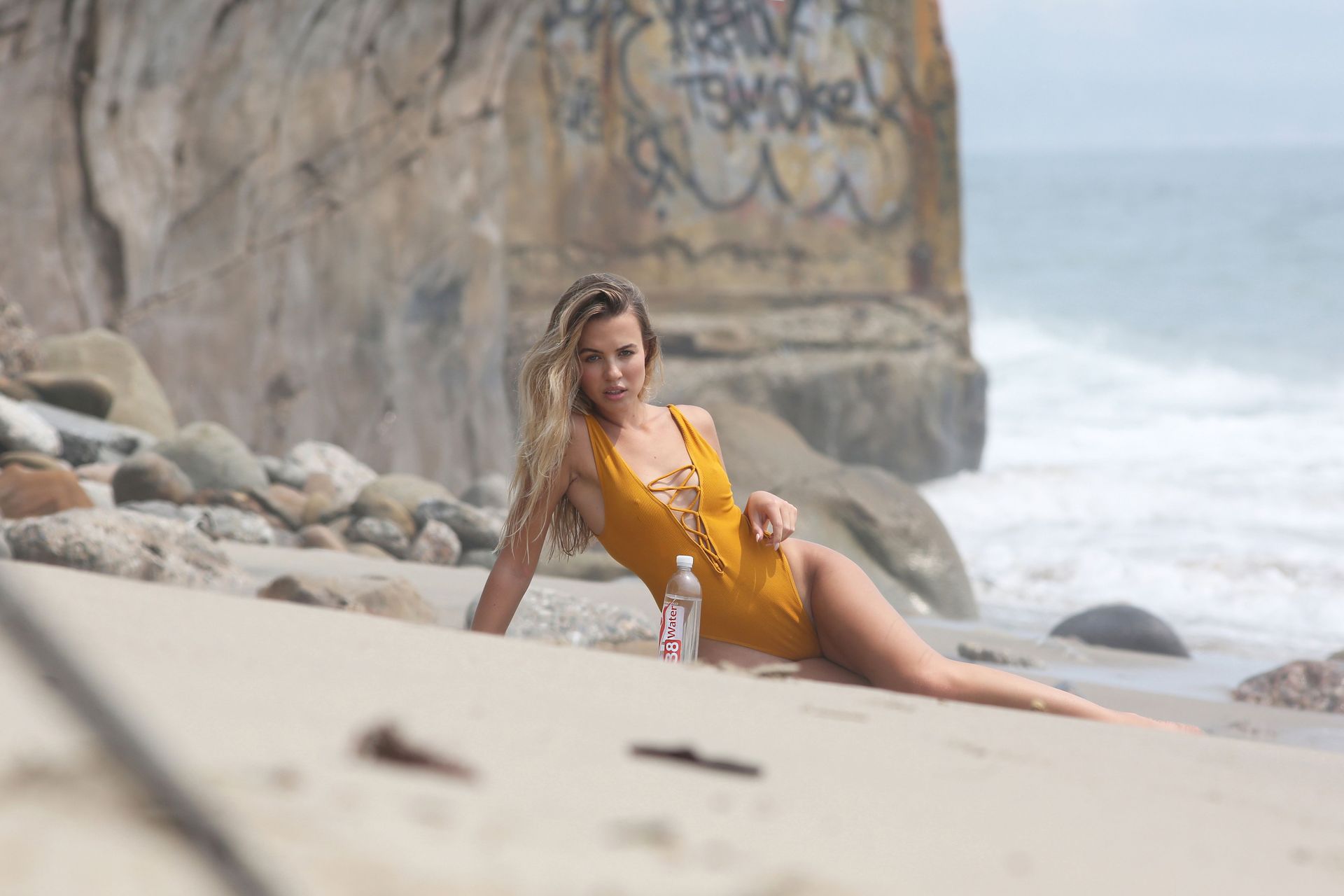 Le mannequin de mode Elizabeth Montgomery porte une veste en cuir associée à un maillot de bain une pièce et un fedora sur le plateau de la dernière séance photo 138 Water à Malibu, le 26/08/2020.