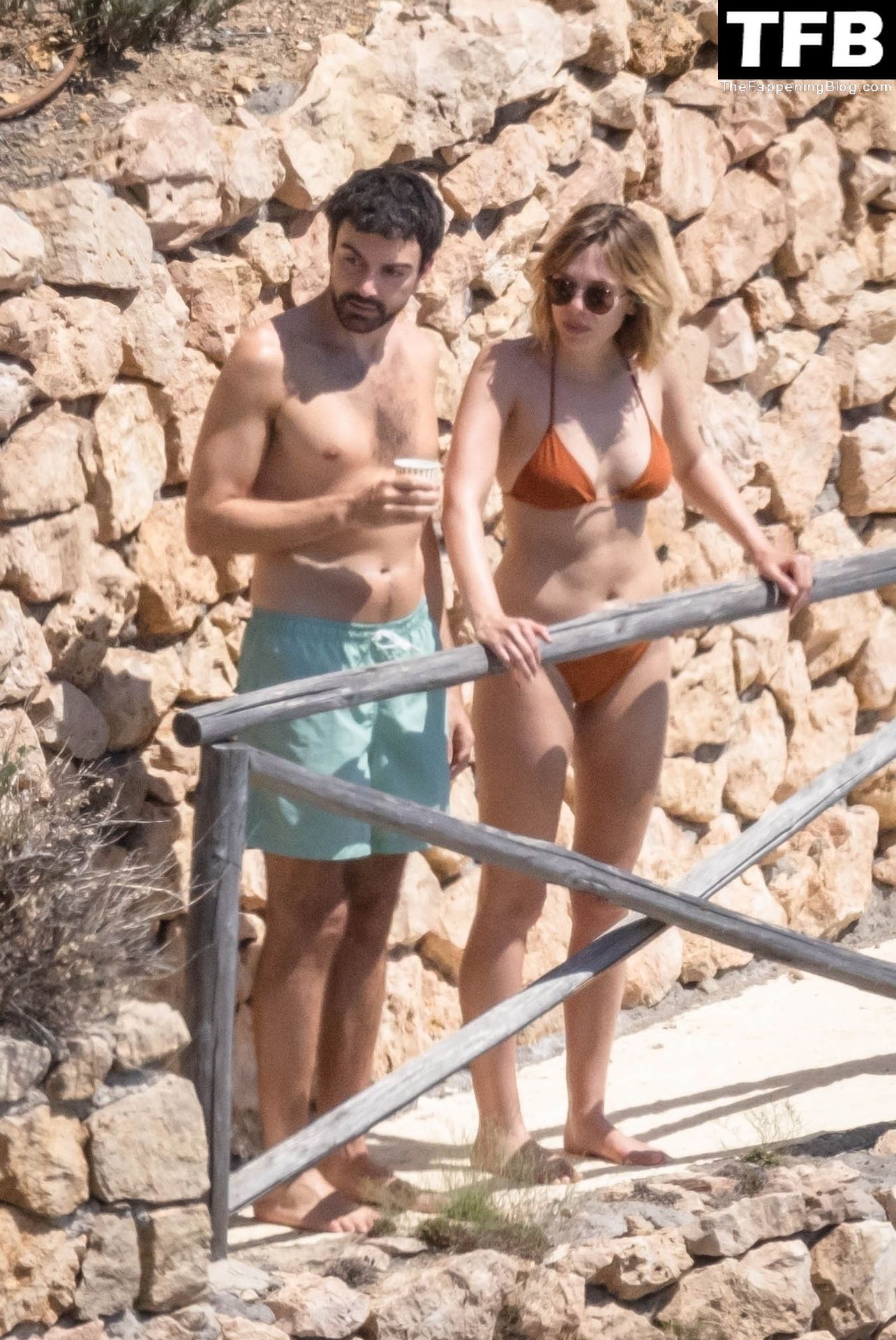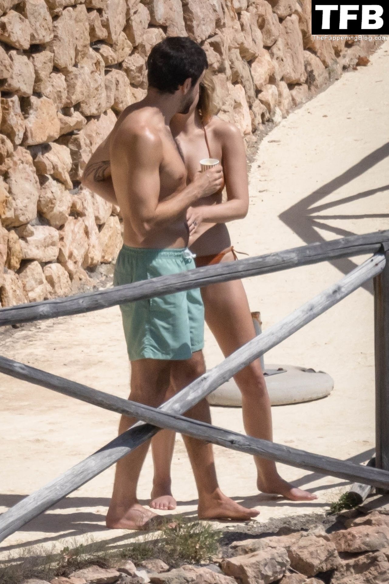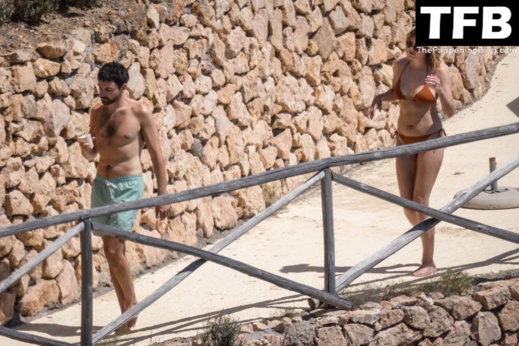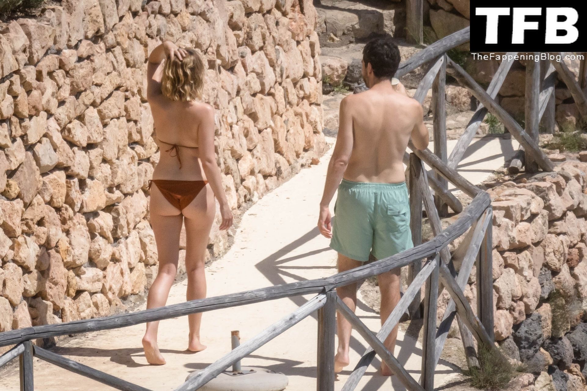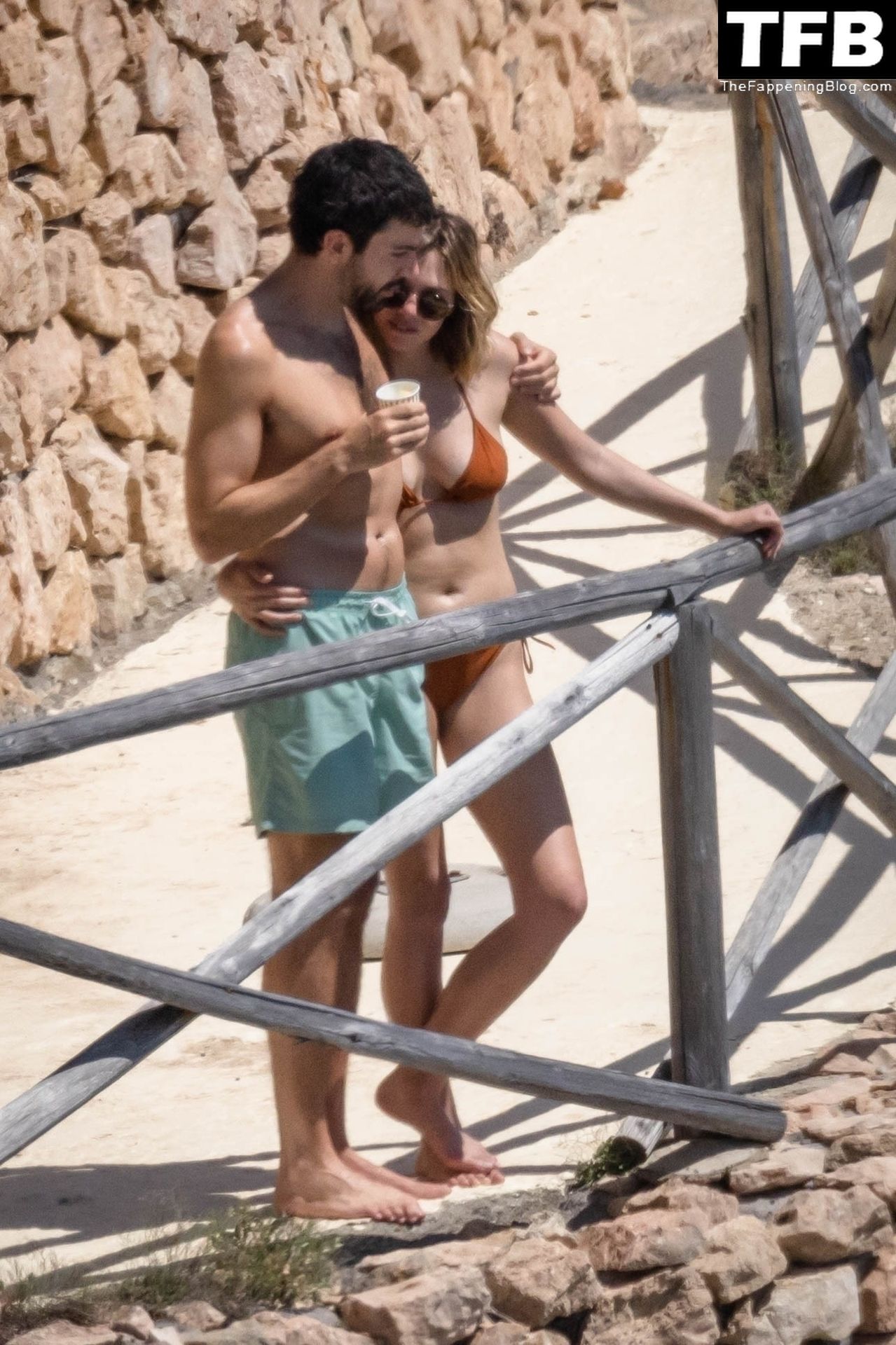 Elizabeth est magnifique dans un bikini marron deux pièces à cordons tandis que le couple se câline et admire le magnifique paysage.