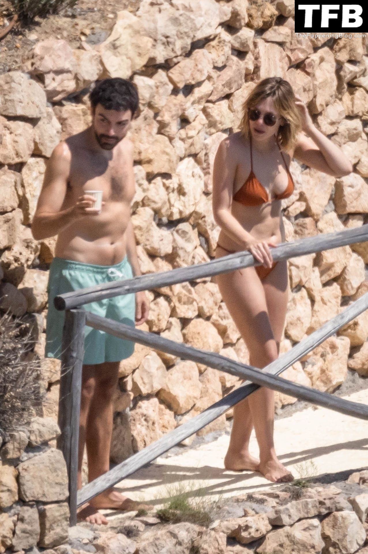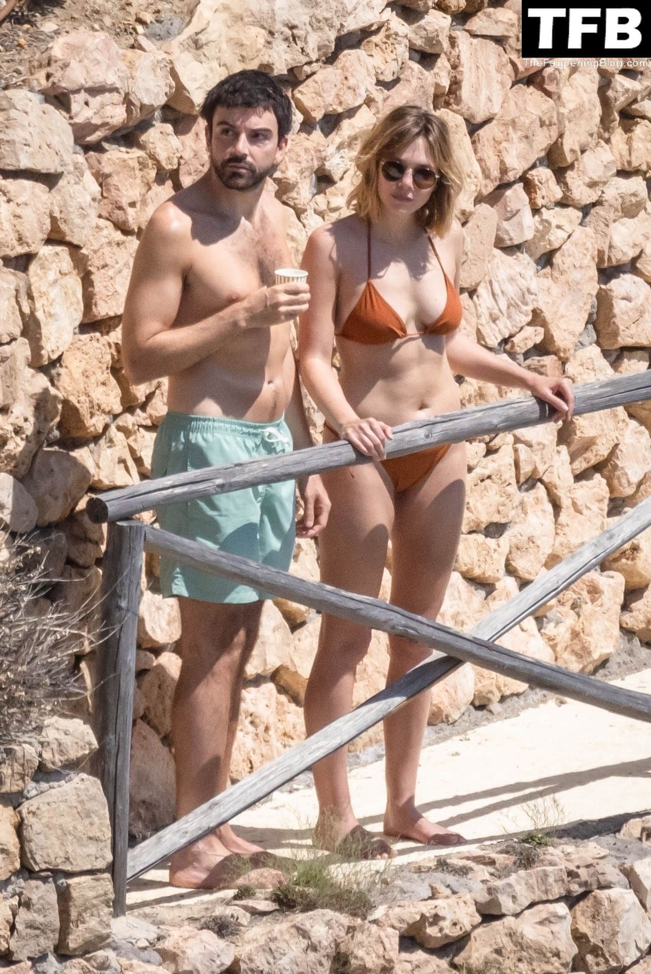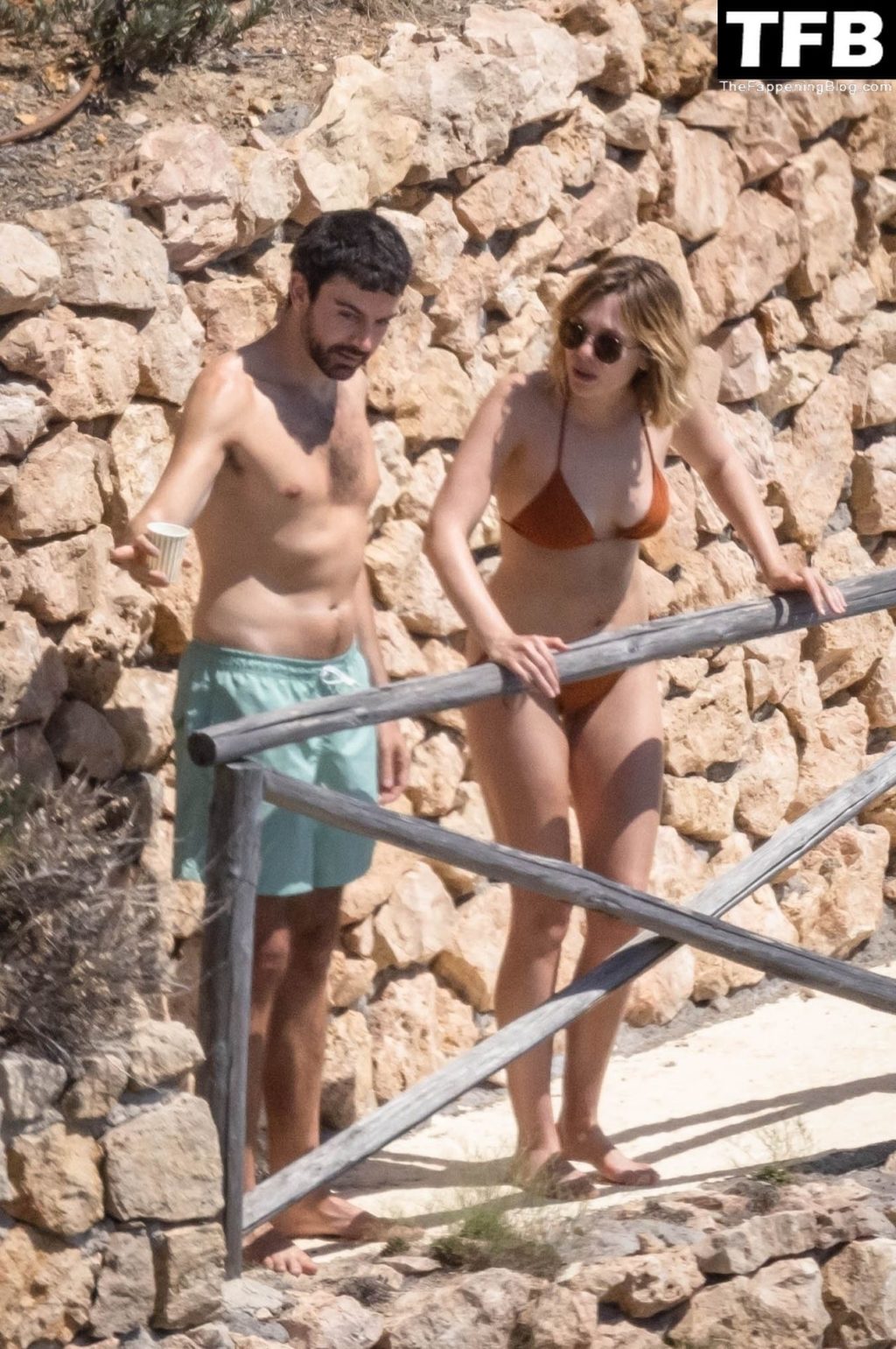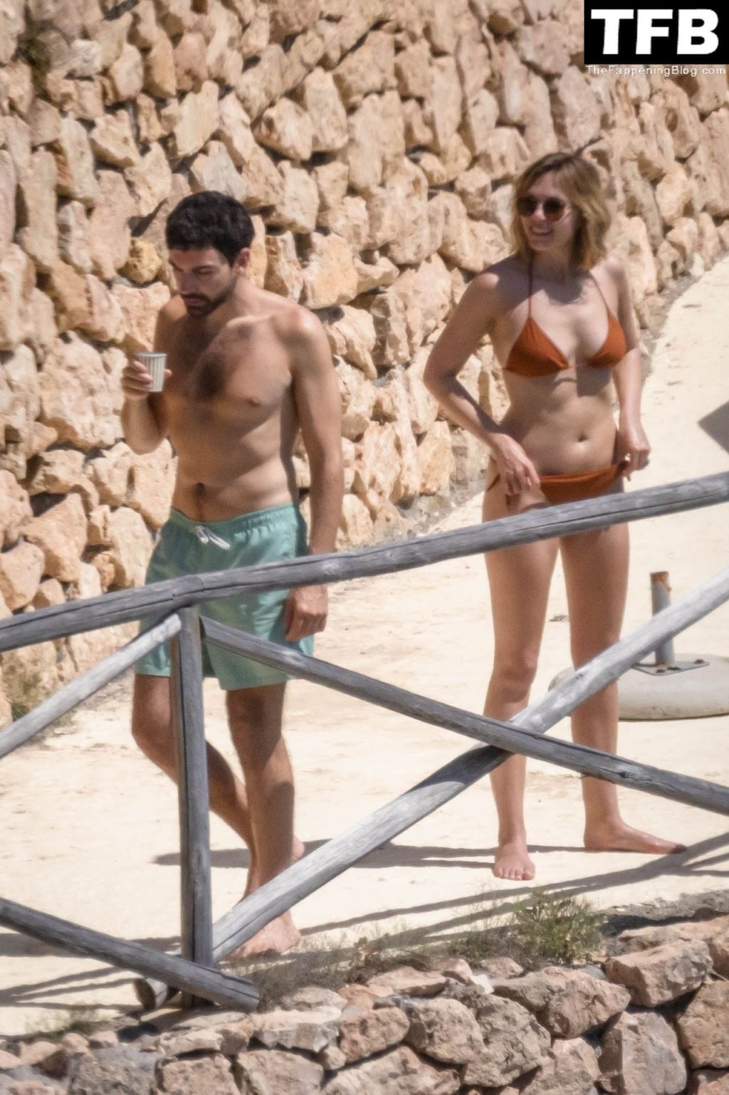 Elizabeth est magnifique dans un bikini marron deux pièces à cordons tandis que le couple se câline et admire le magnifique paysage.
