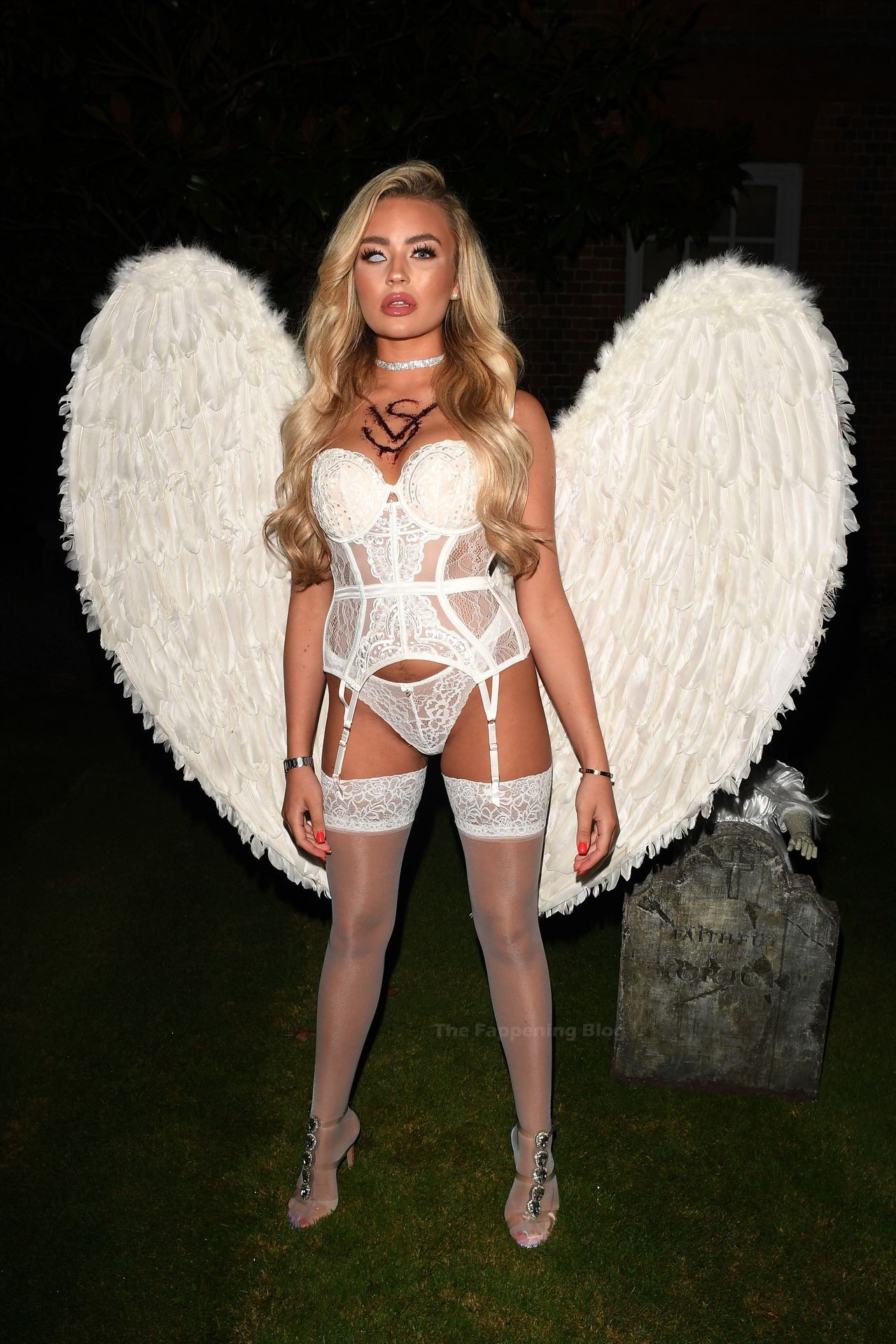 La star de la télé-réalité Ella Rae Wise porte son sexy costume d’Ange Mort lors du tournage de l’émission télévisée « The Only Way is Essex » à Halloween dans l’Essex, le 25/10/2020.