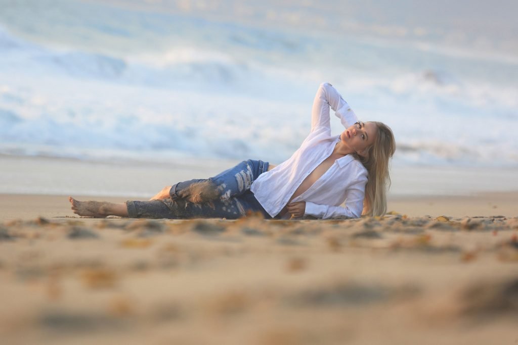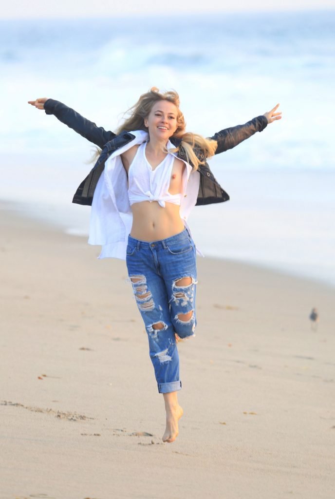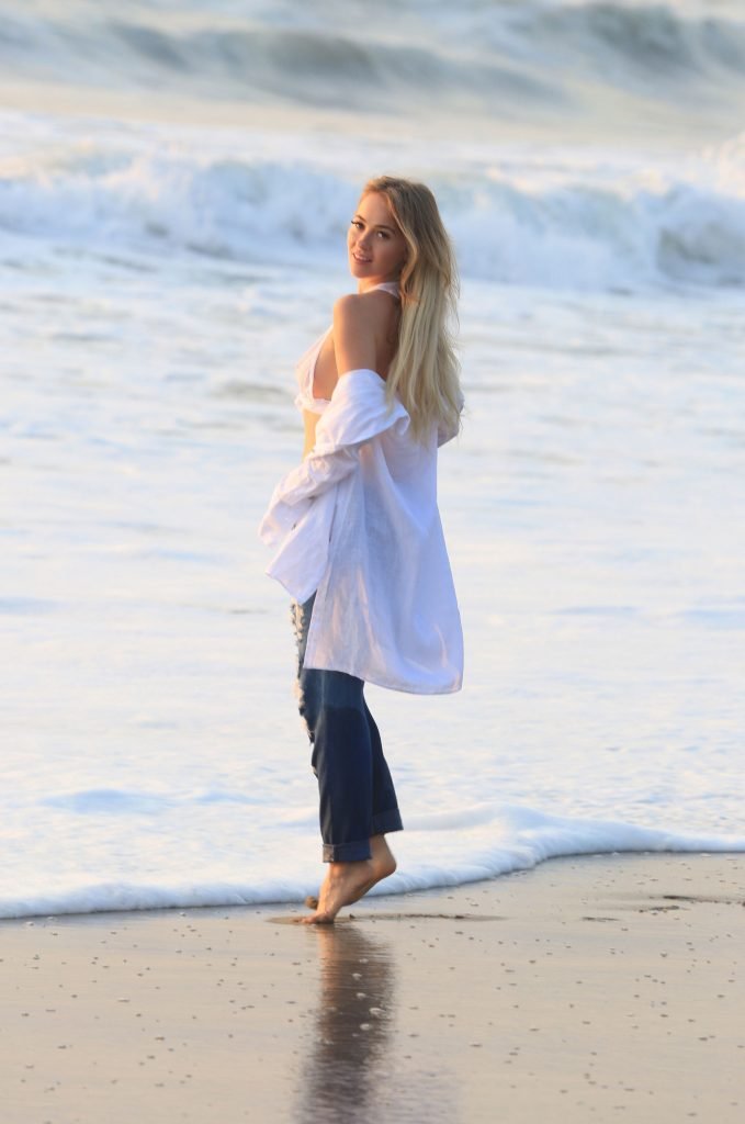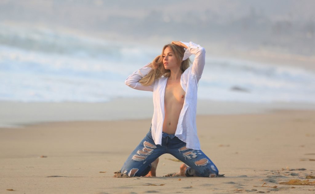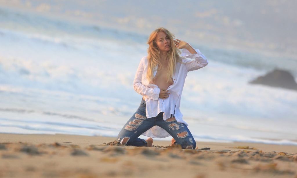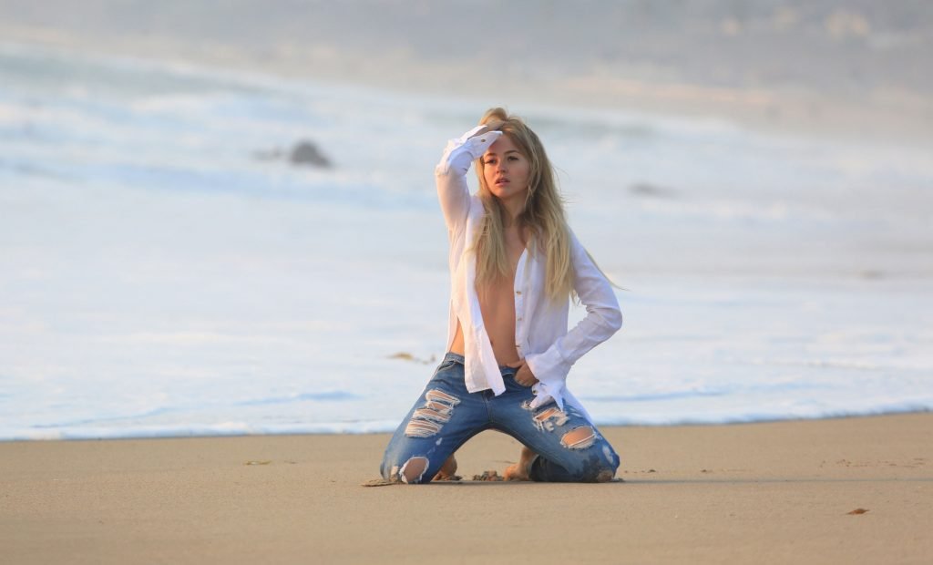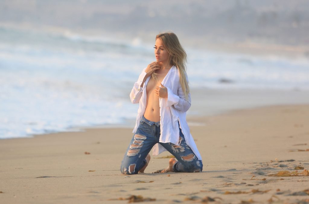Ellen Alexander pose topless lors d’une nouvelle séance photo éditoriale pour GQ Russie, portant une veste en jean et un jean rétro sur la plage de Malibu, 01/03/2018. Ellen Alexander (alias Elena Bugaeva) est un modèle, actrice, productrice originaire de Russie et réside actuellement à Los Angeles.