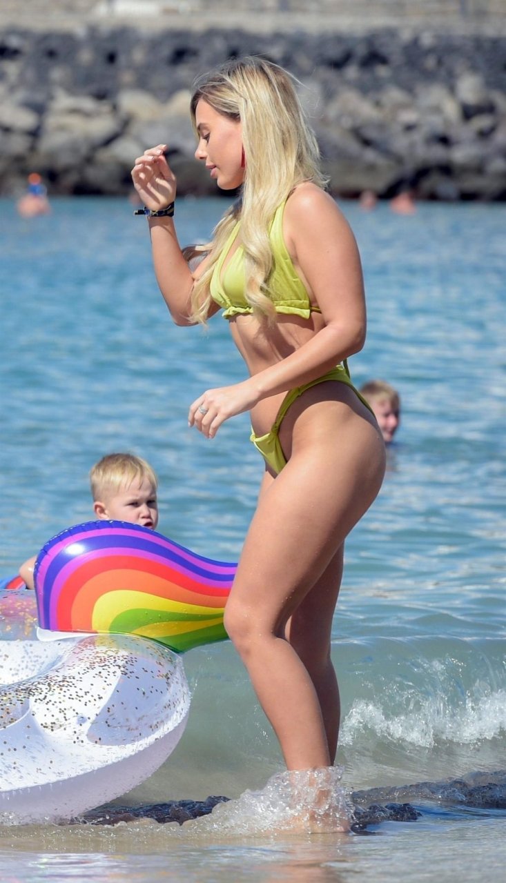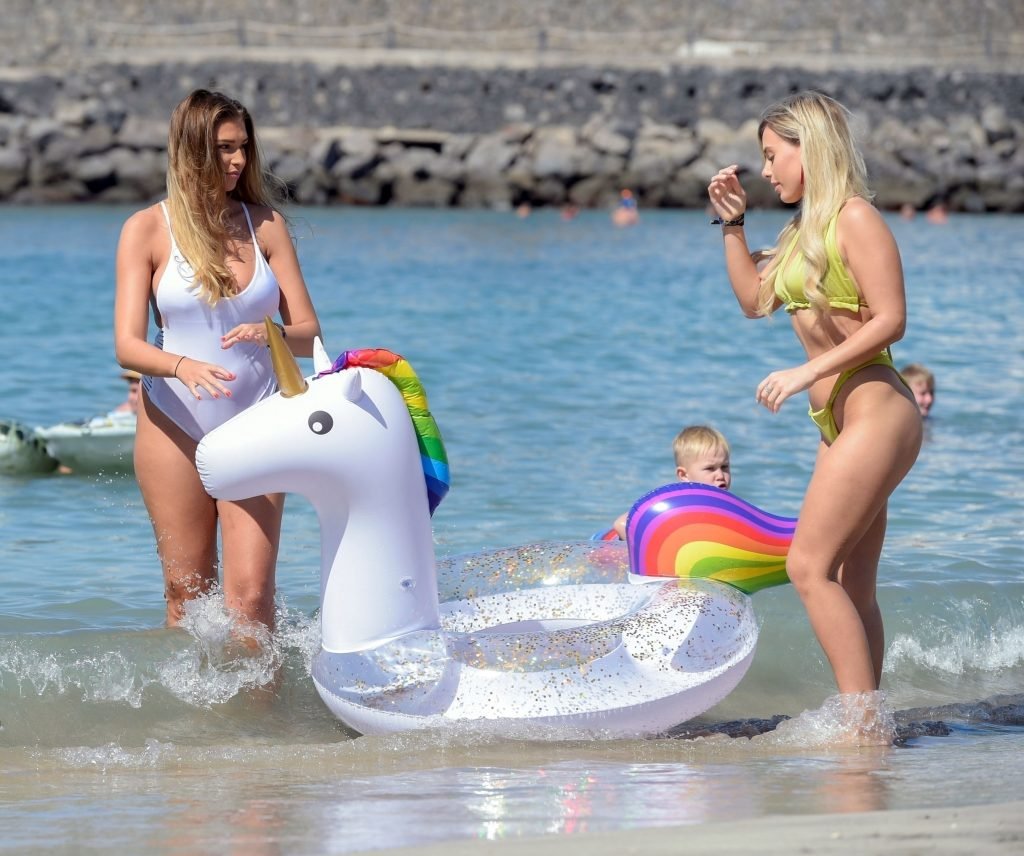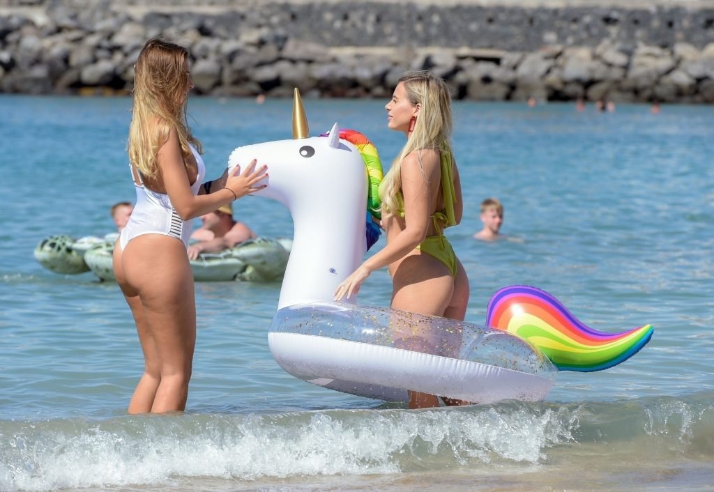 2018 Love Island Babe Ellie Brown montre son bikini string en jouant dans la mer avec sa meilleure amie Zara McDermott et une énorme licorne gonflable. Le duo de Love Island 2018 prenait également plaisir à exhiber quelques melons sur la plage à Ibiza.