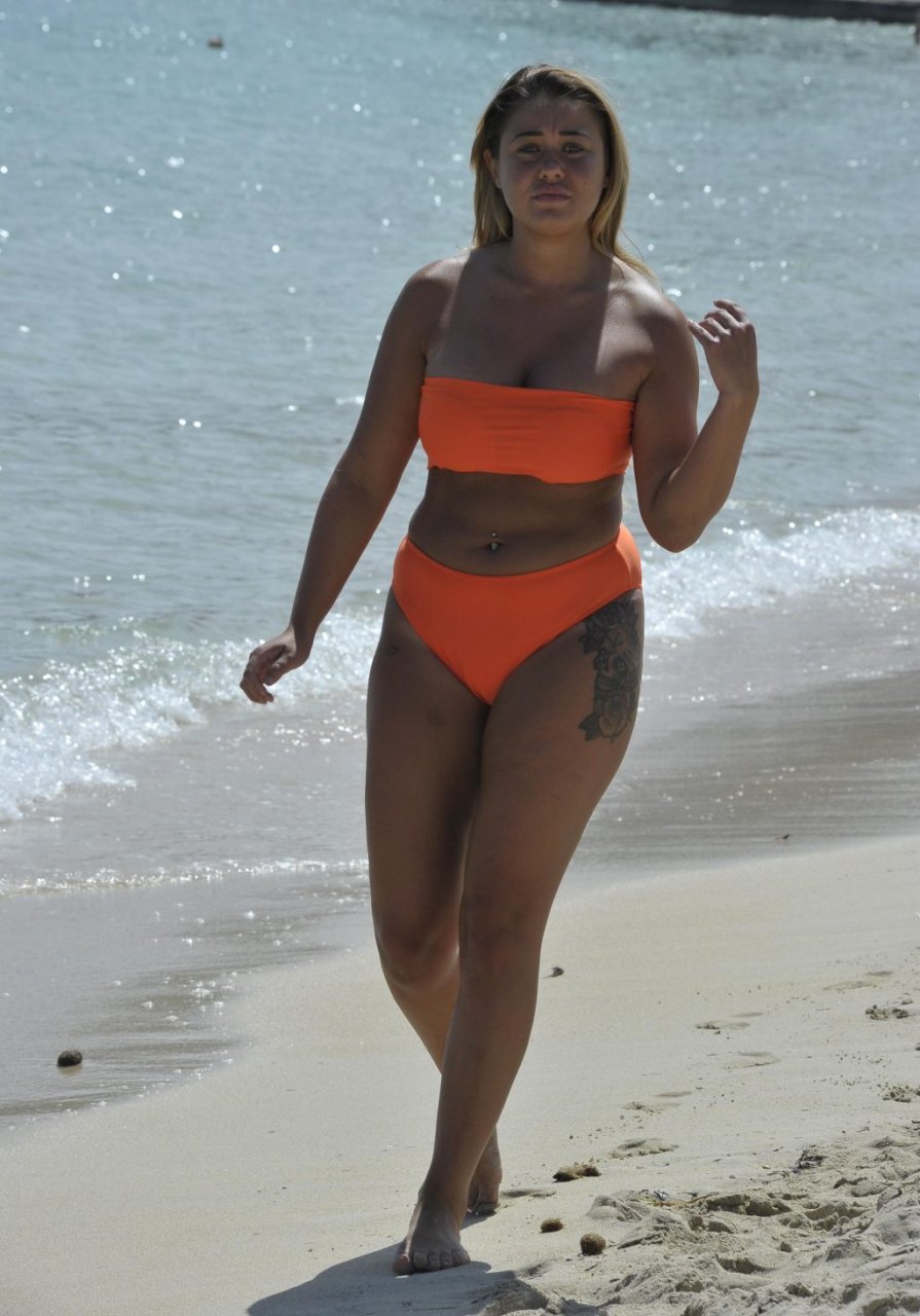 Ibiza Weekender et Big Brother Ellie Young affiche une silhouette voluptueuse en montrant son décolleté dans un bikini orange vif, tandis qu’elle s’amuse sur la plage avec son co-vedette de la télévision David Potts (David Weekender) – Magaluf, Espagne (octobre 2018).