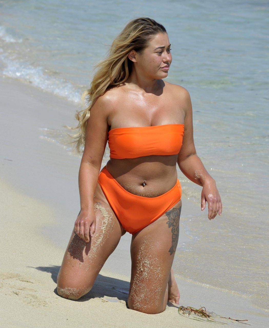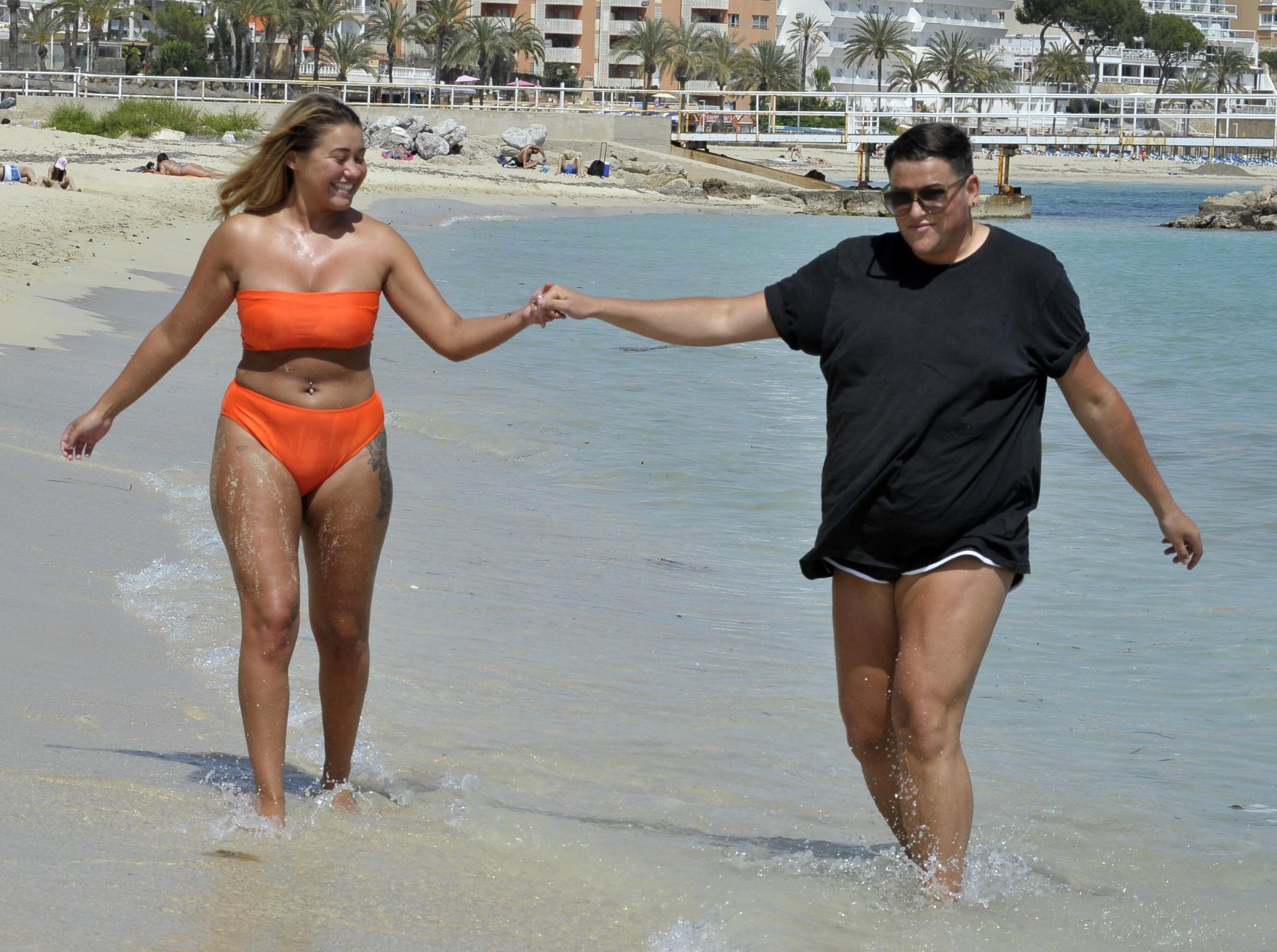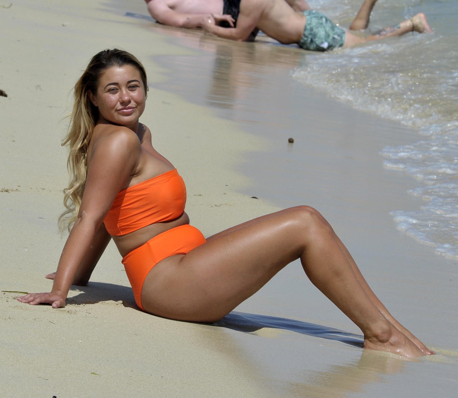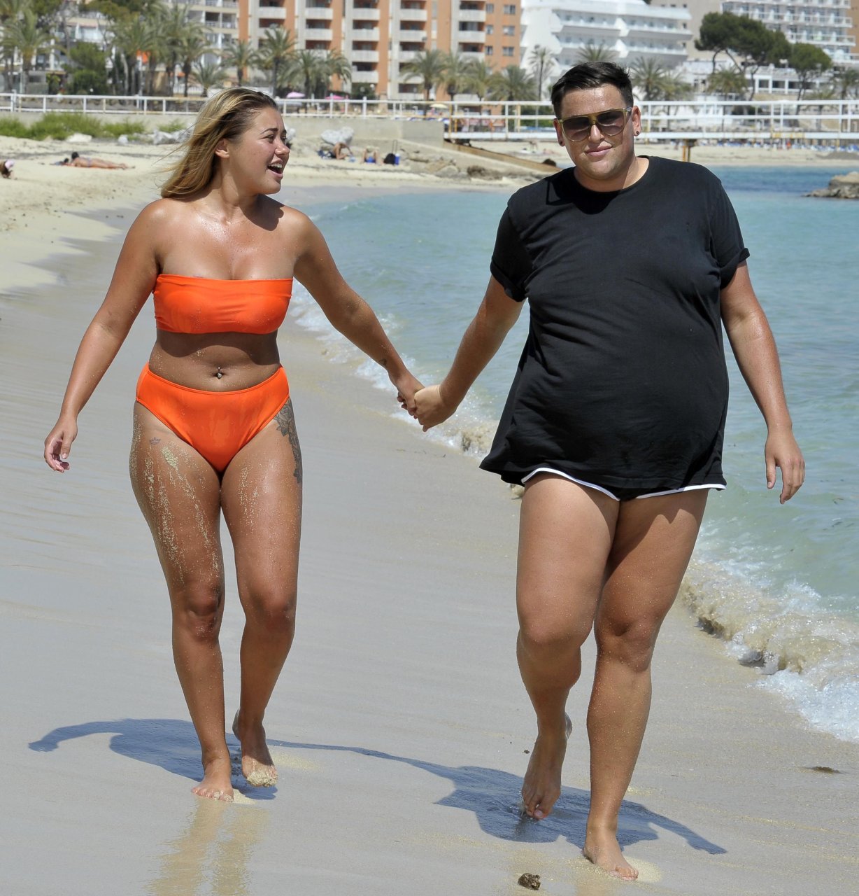 Ibiza Weekender et Big Brother Ellie Young affiche une silhouette voluptueuse en montrant son décolleté dans un bikini orange vif, tandis qu’elle s’amuse sur la plage avec son co-vedette de la télévision David Potts (David Weekender) – Magaluf, Espagne (octobre 2018).