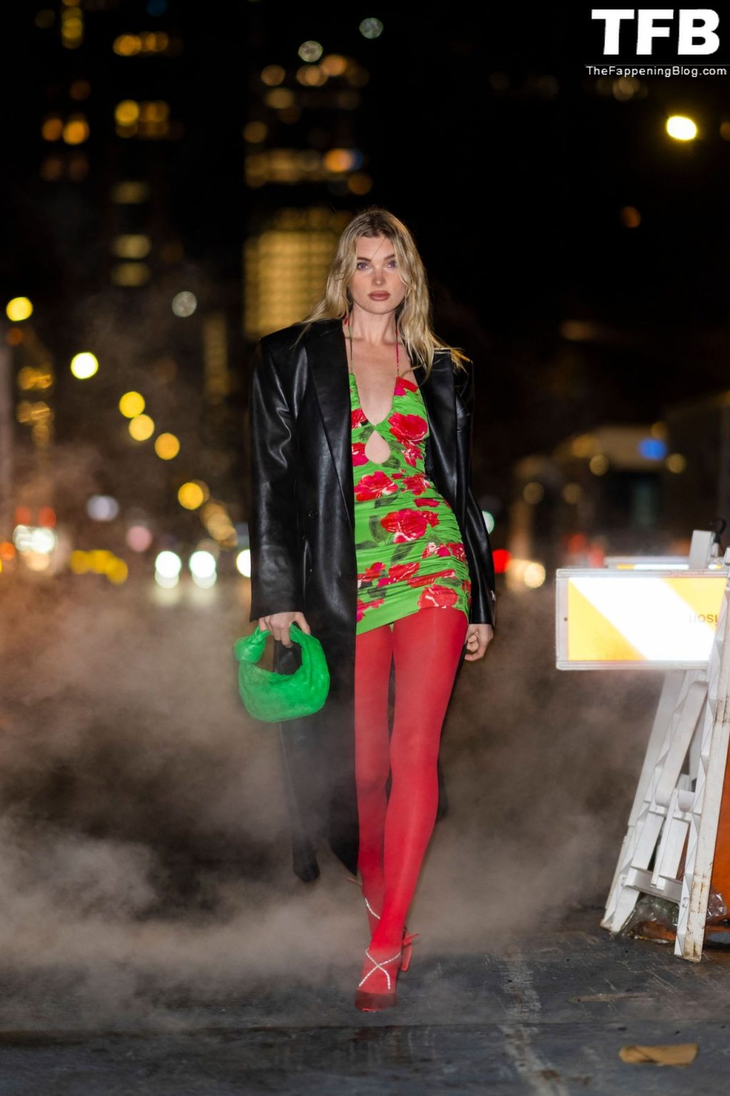 Supermodel Elsa Hosk exhibe ses jambes sexy dans une paire de collants opaques rouges et une robe dos nu verte vibrante alors qu’elle donne une touche de fête à une tenue de soirée à NYC, 20/11/2021.