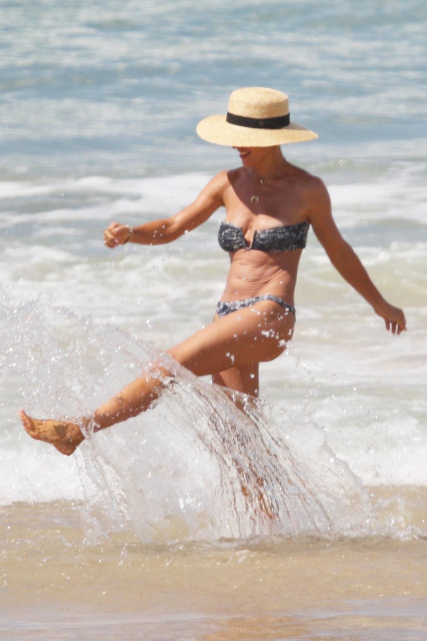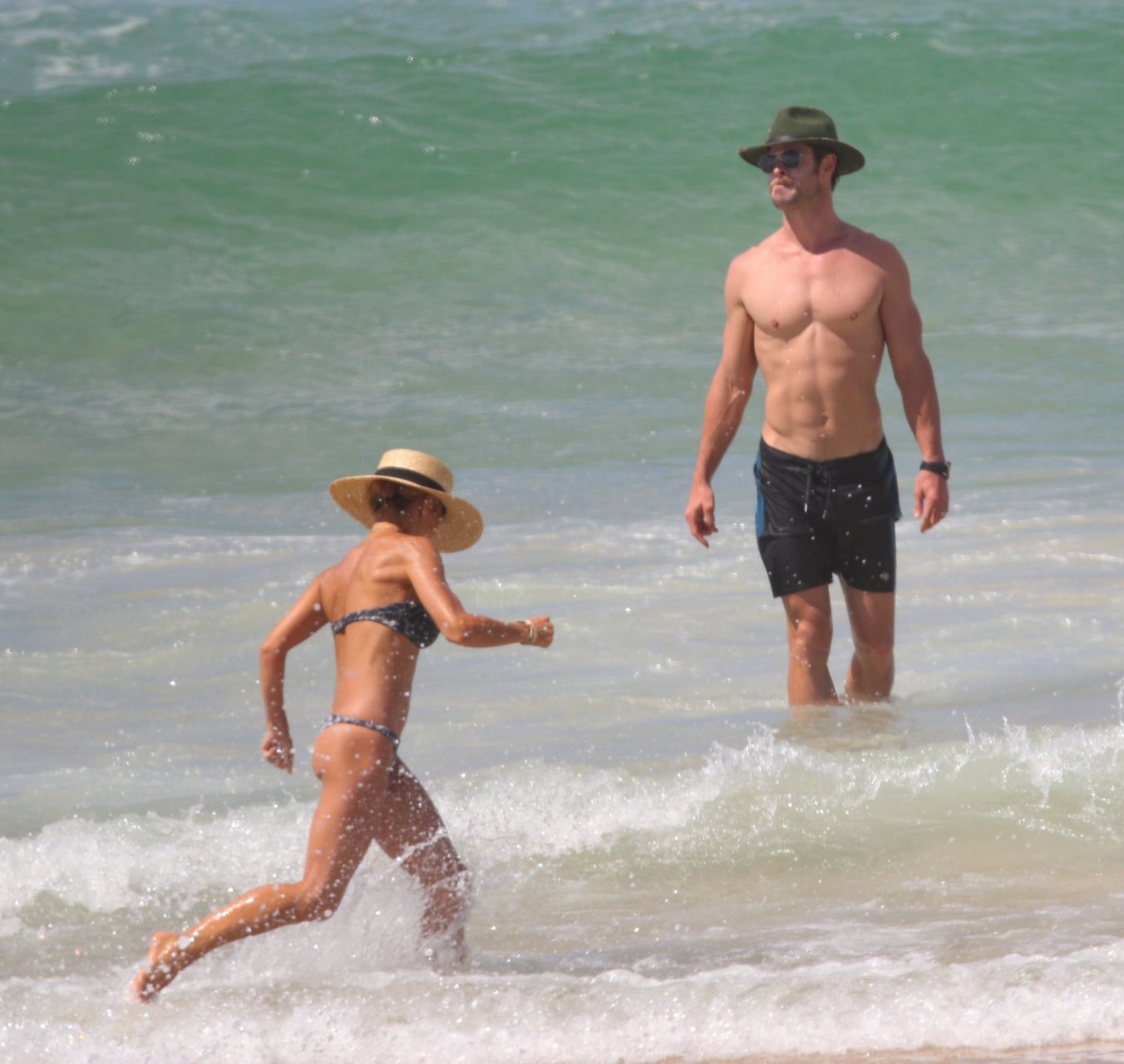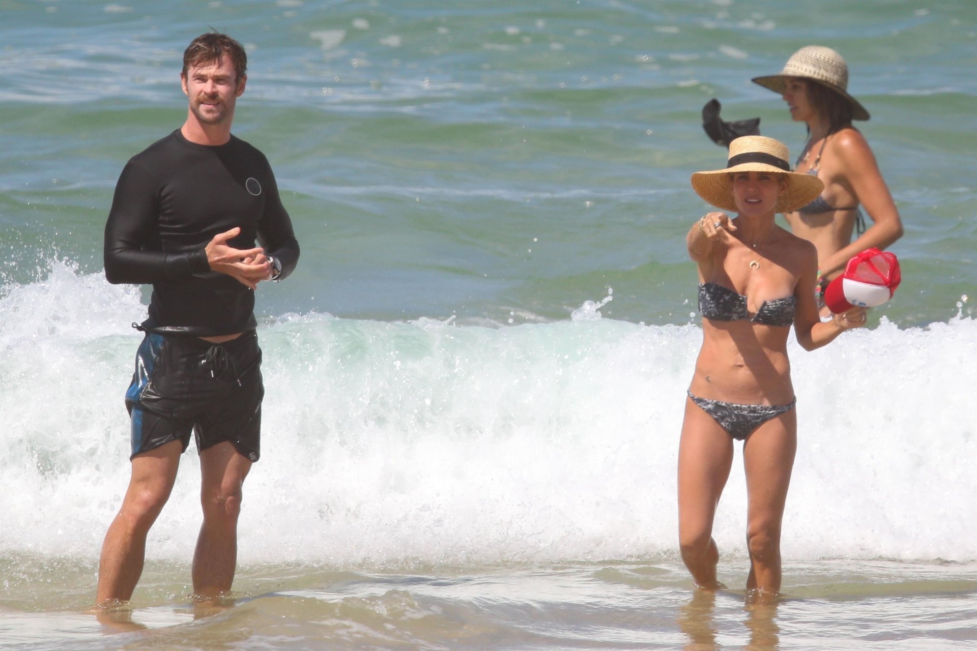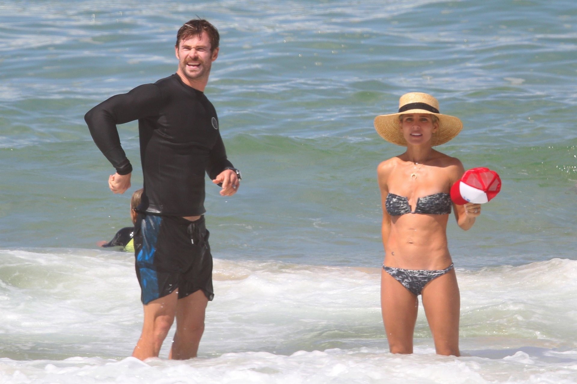 Chris Hemsworth et sa femme Elsa Pataky photographiés à la plage de Byron Bay, en Australie. Elsa Pataky est actrice (Fast & Furious 8), mannequin et productrice. Âge – 41 ans.