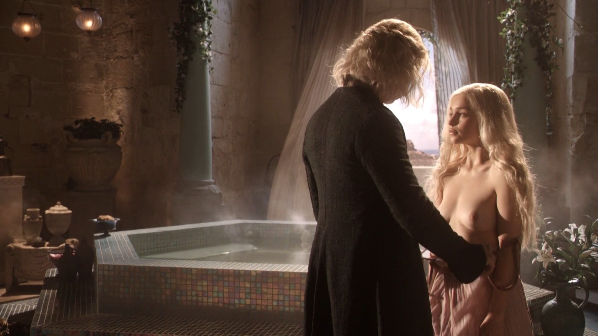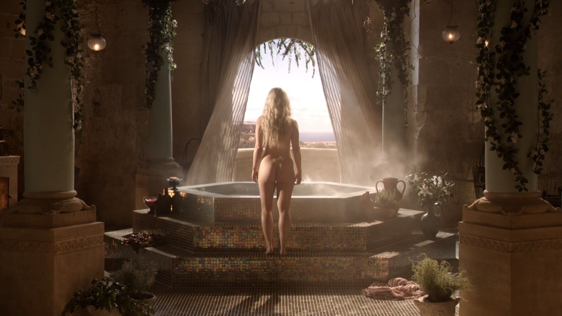 Le frère de Daenerys la déshabille et évalue son « corps de femme ». Découvrez les seins, le pubis, et un spectaculaire plan de fesses lorsqu’elle glisse dans la baignoire.