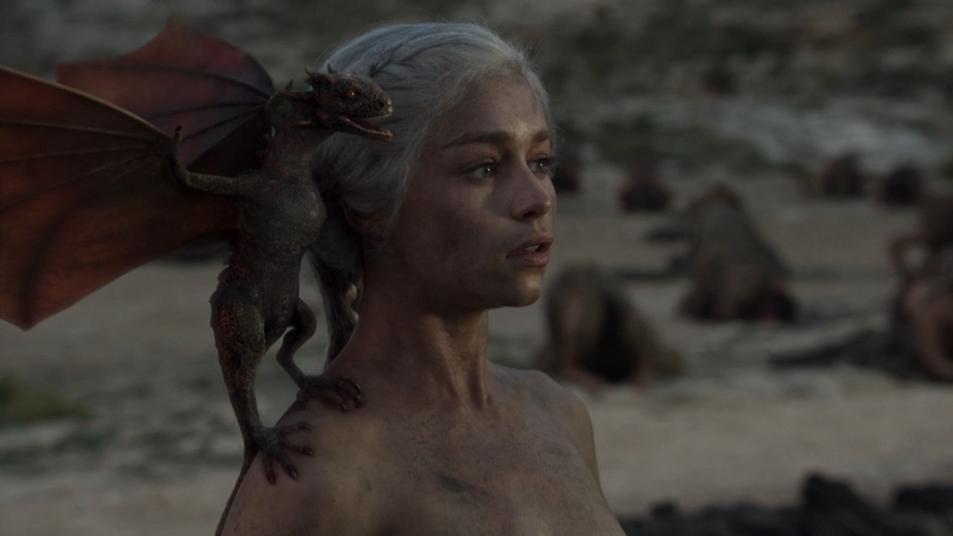 We see Daenerys’s dirty rack, literally, as she emerges from a distinguished fire, naked and baring baby dragons.