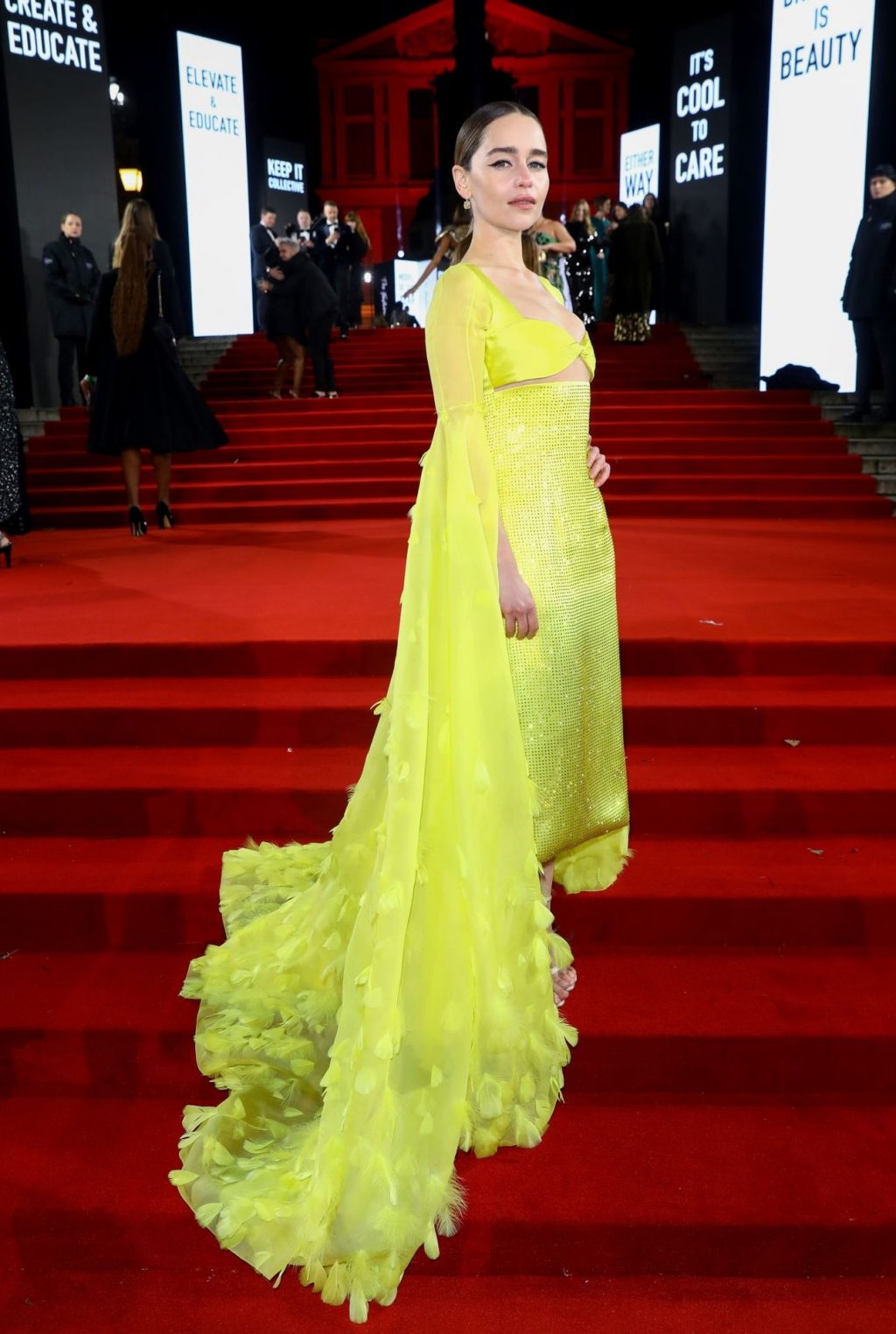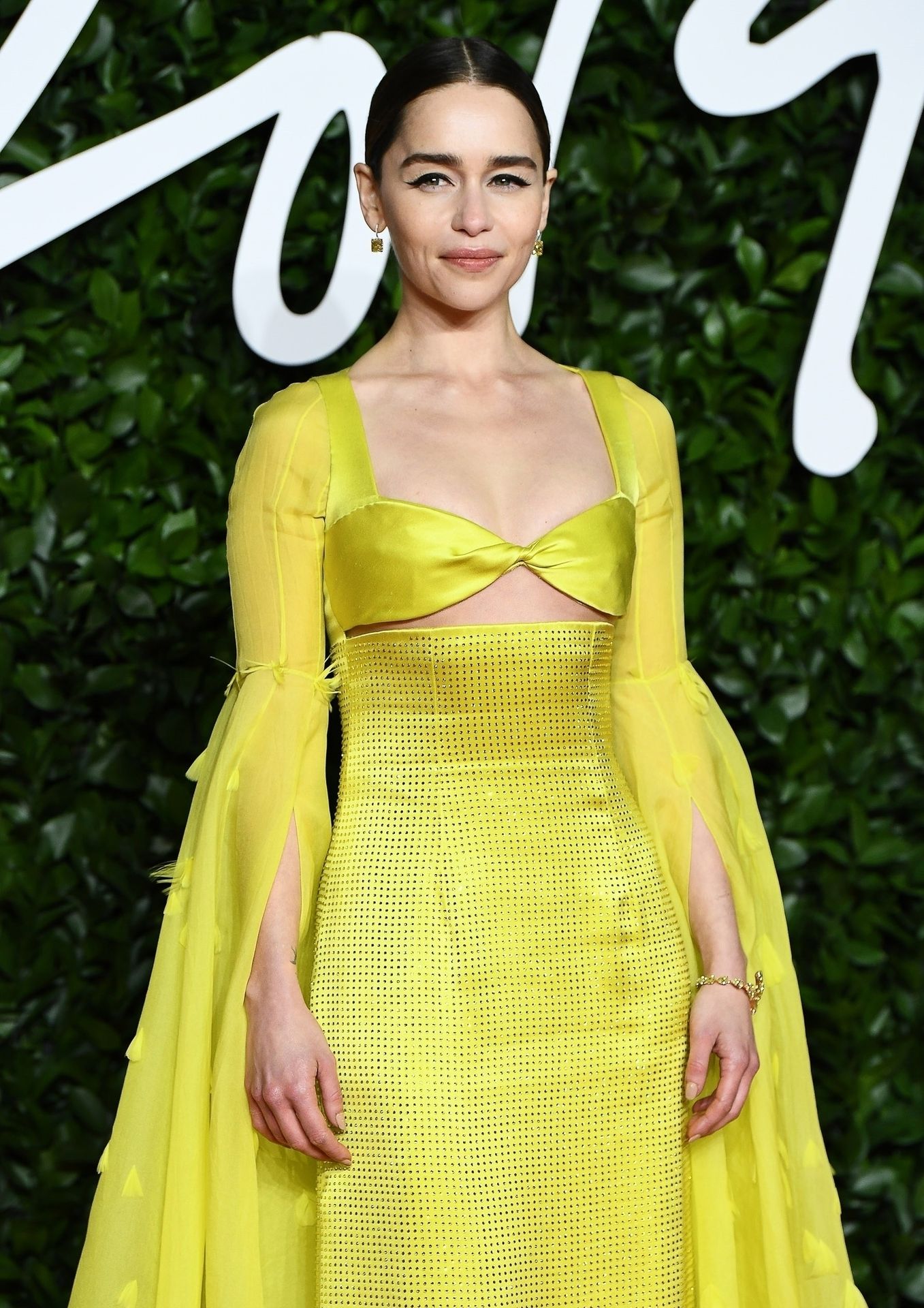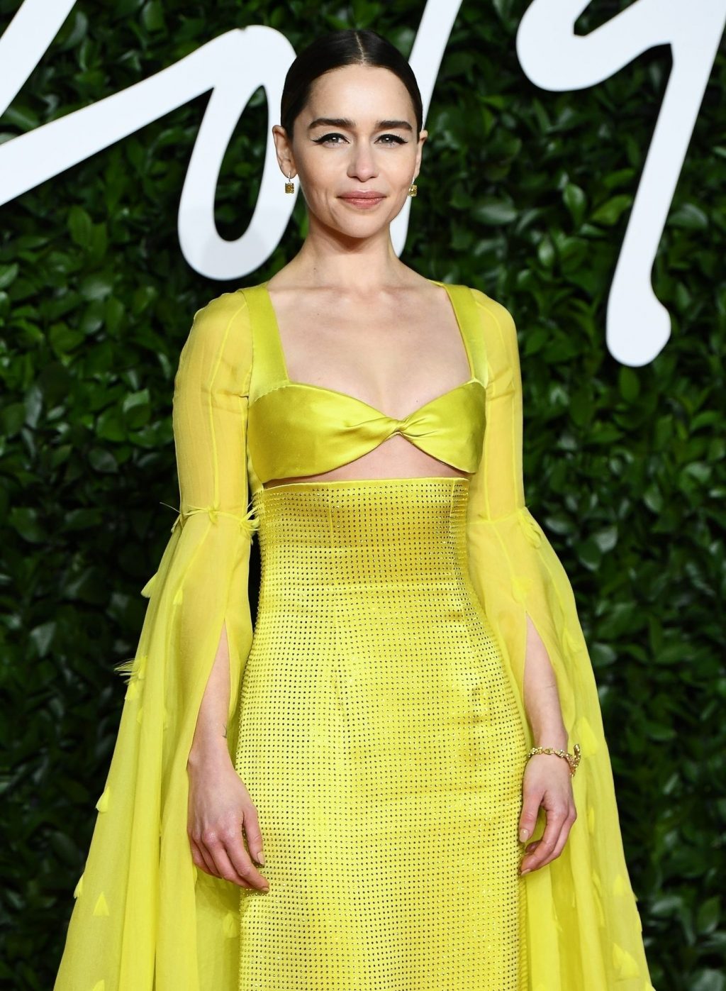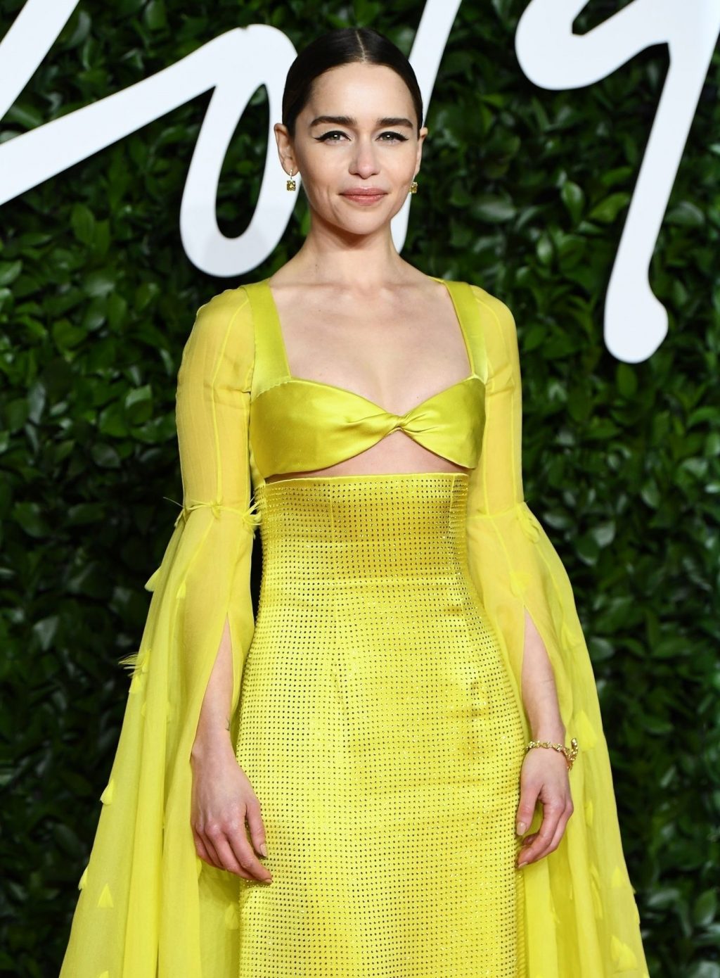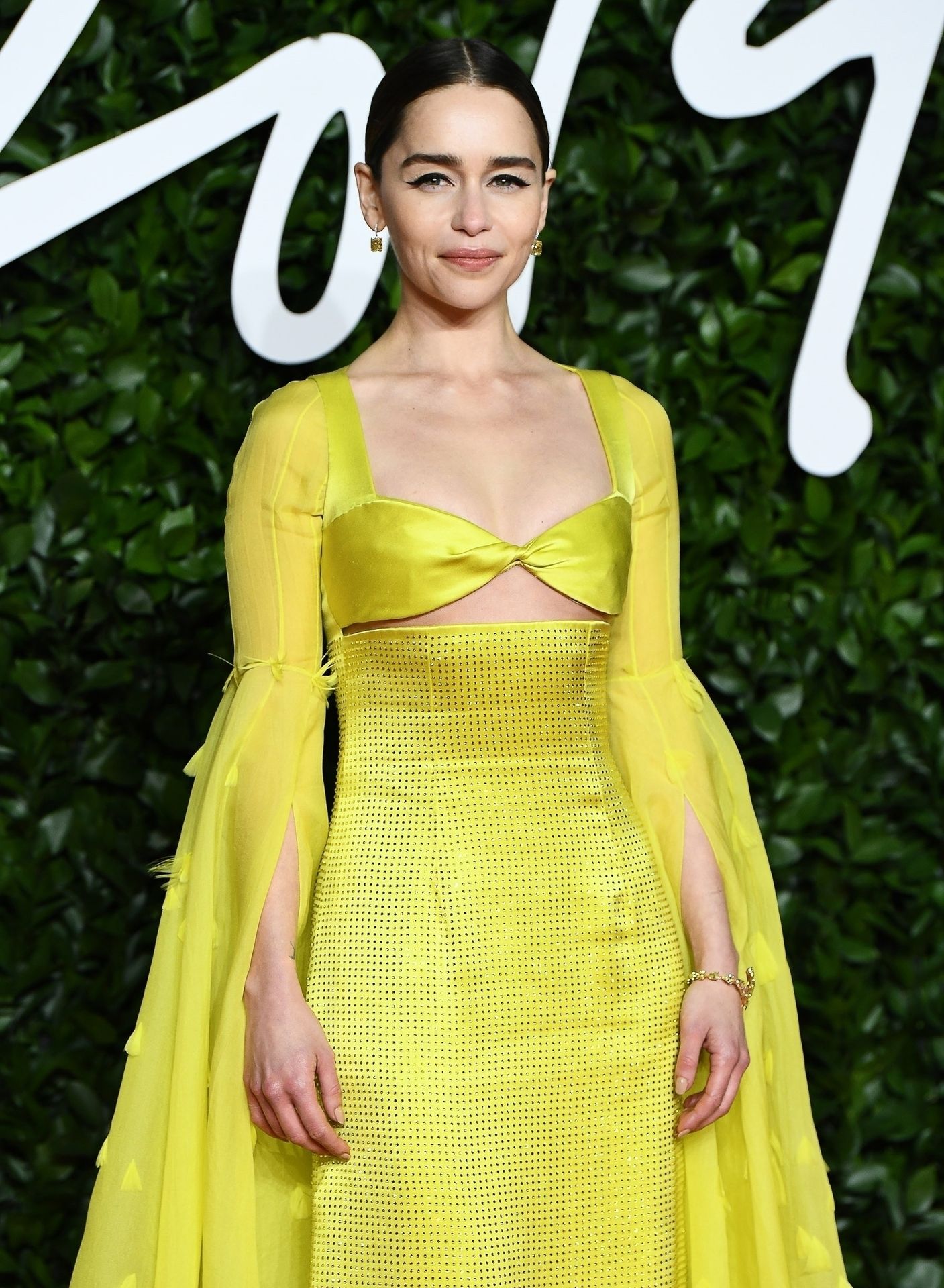 L’actrice anglaise Emilia Clarke pose dans une robe jaune sur le tapis rouge à son arrivée aux Fashion Awards 2019 à Londres, le 12/02/2019.