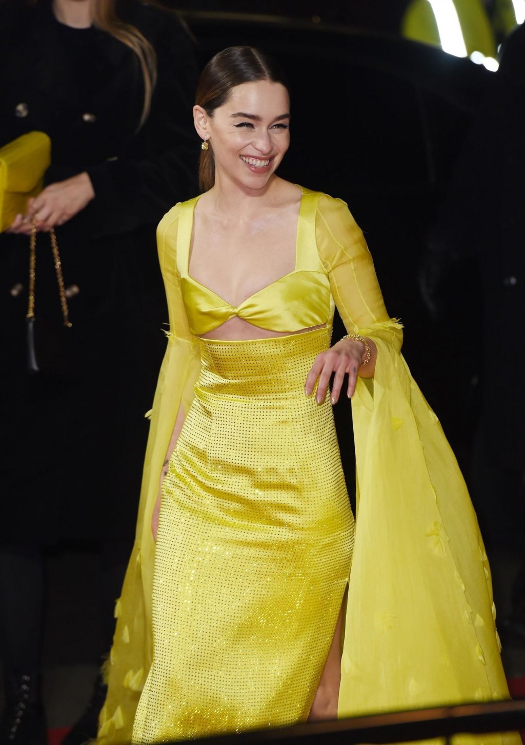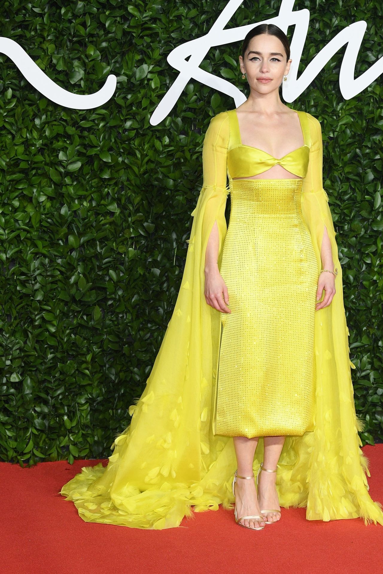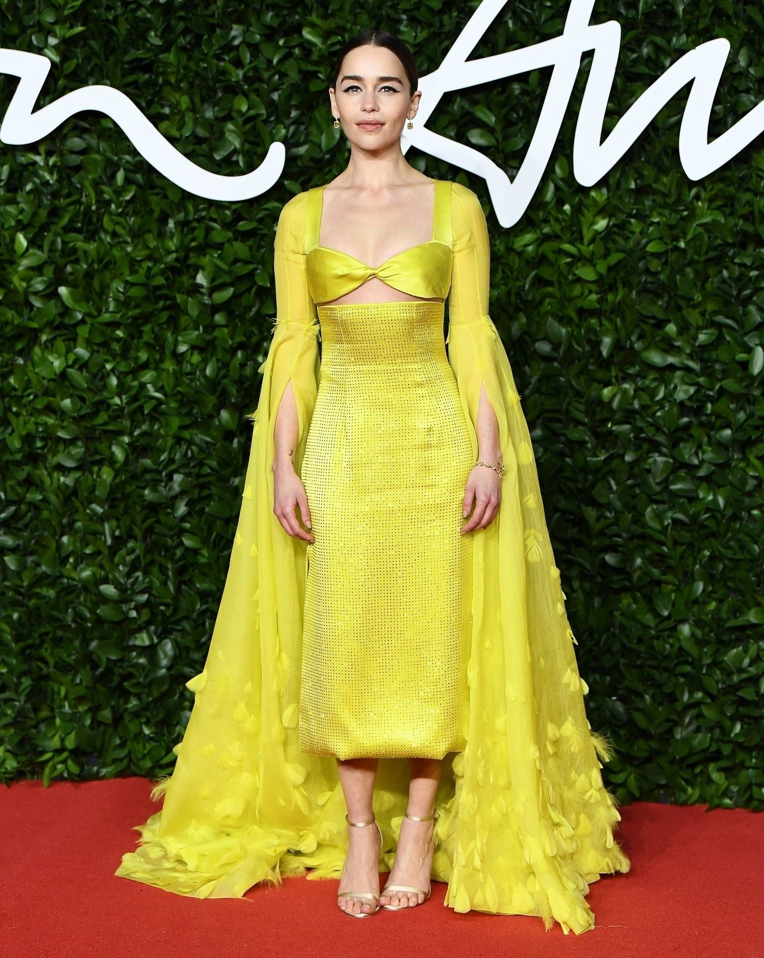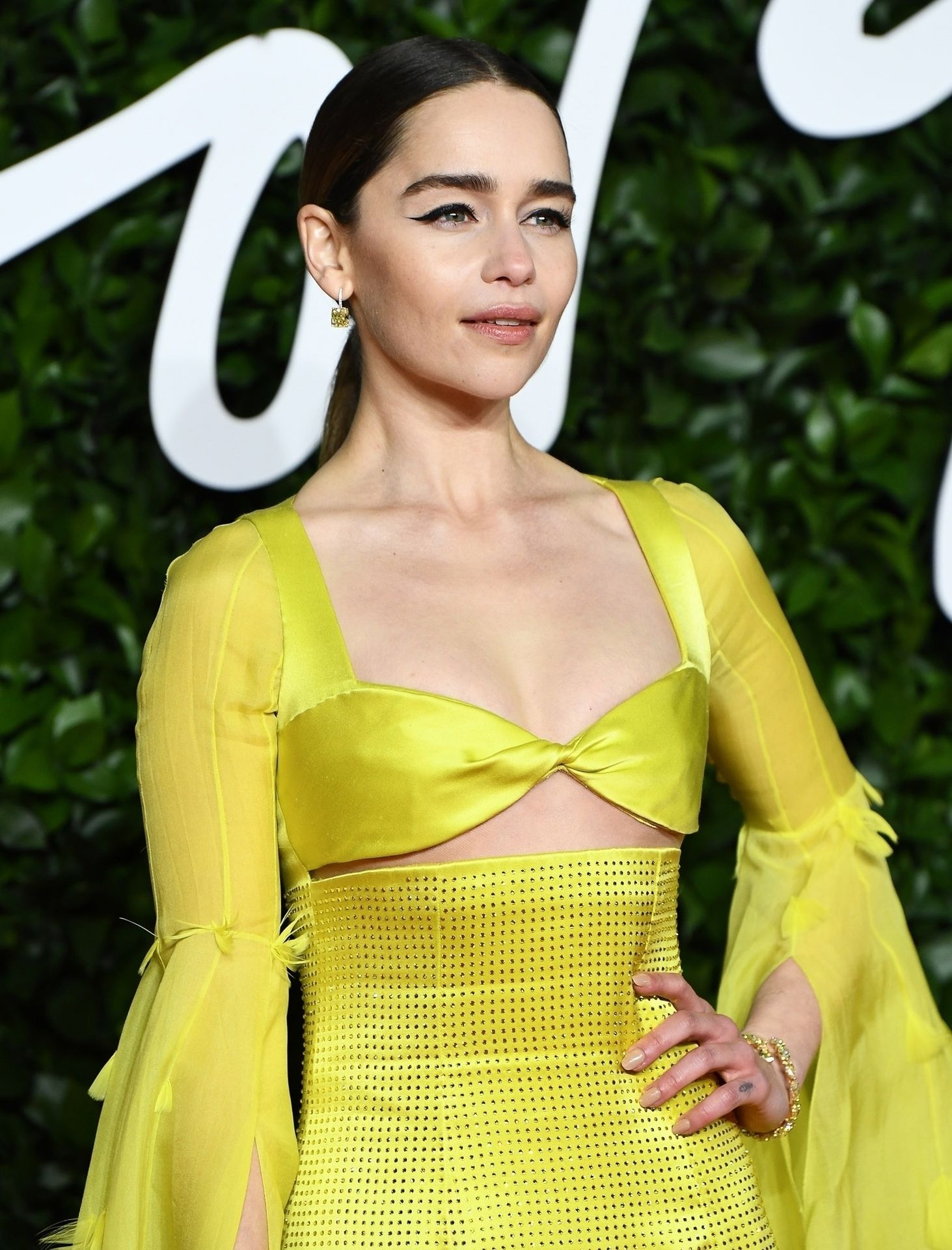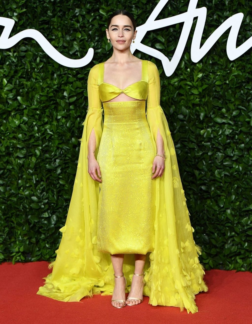 L’actrice anglaise Emilia Clarke pose dans une robe jaune sur le tapis rouge à son arrivée aux Fashion Awards 2019 à Londres, le 12/02/2019.