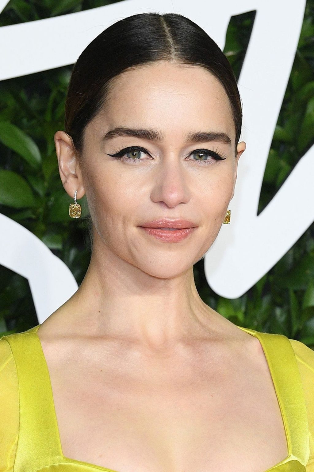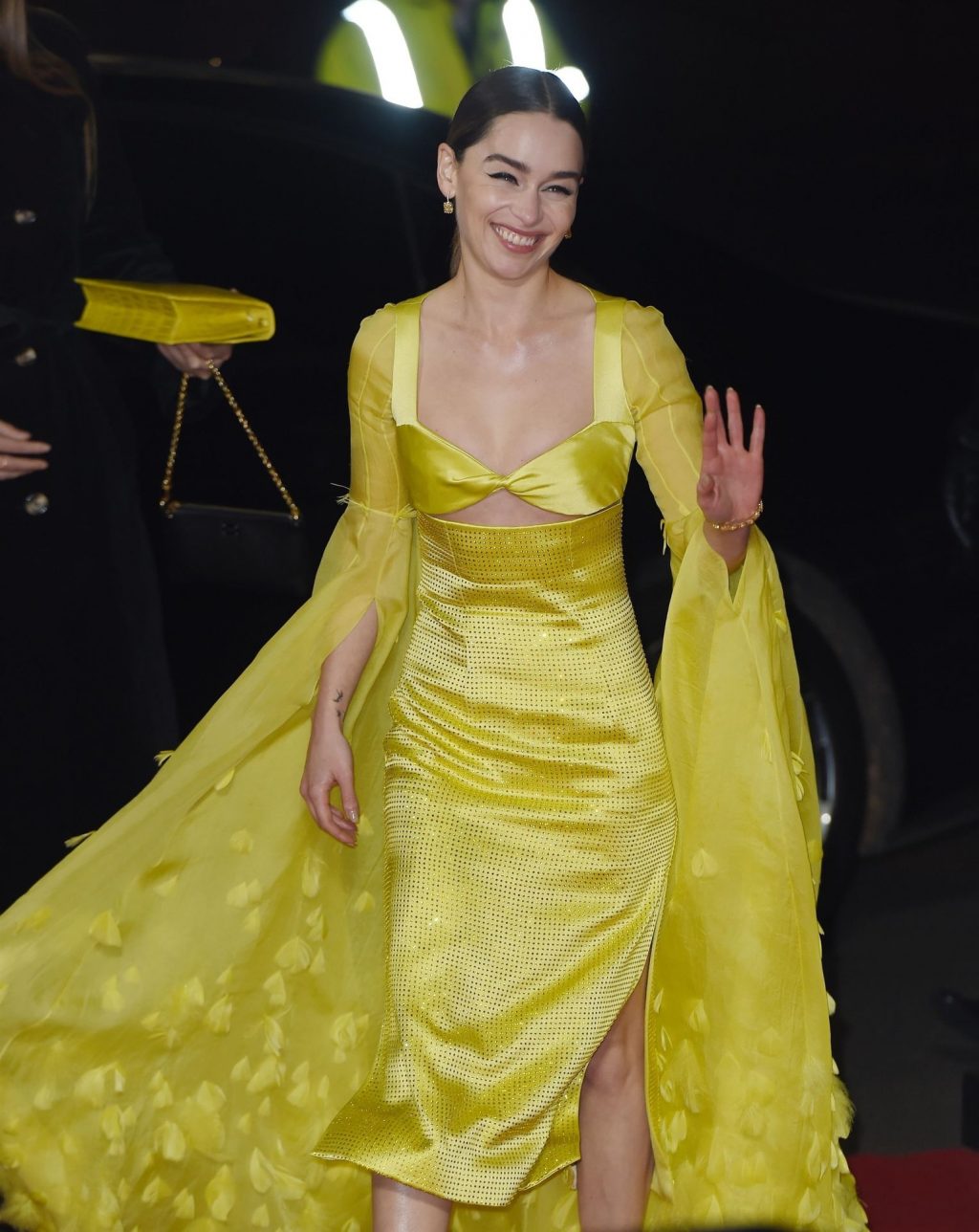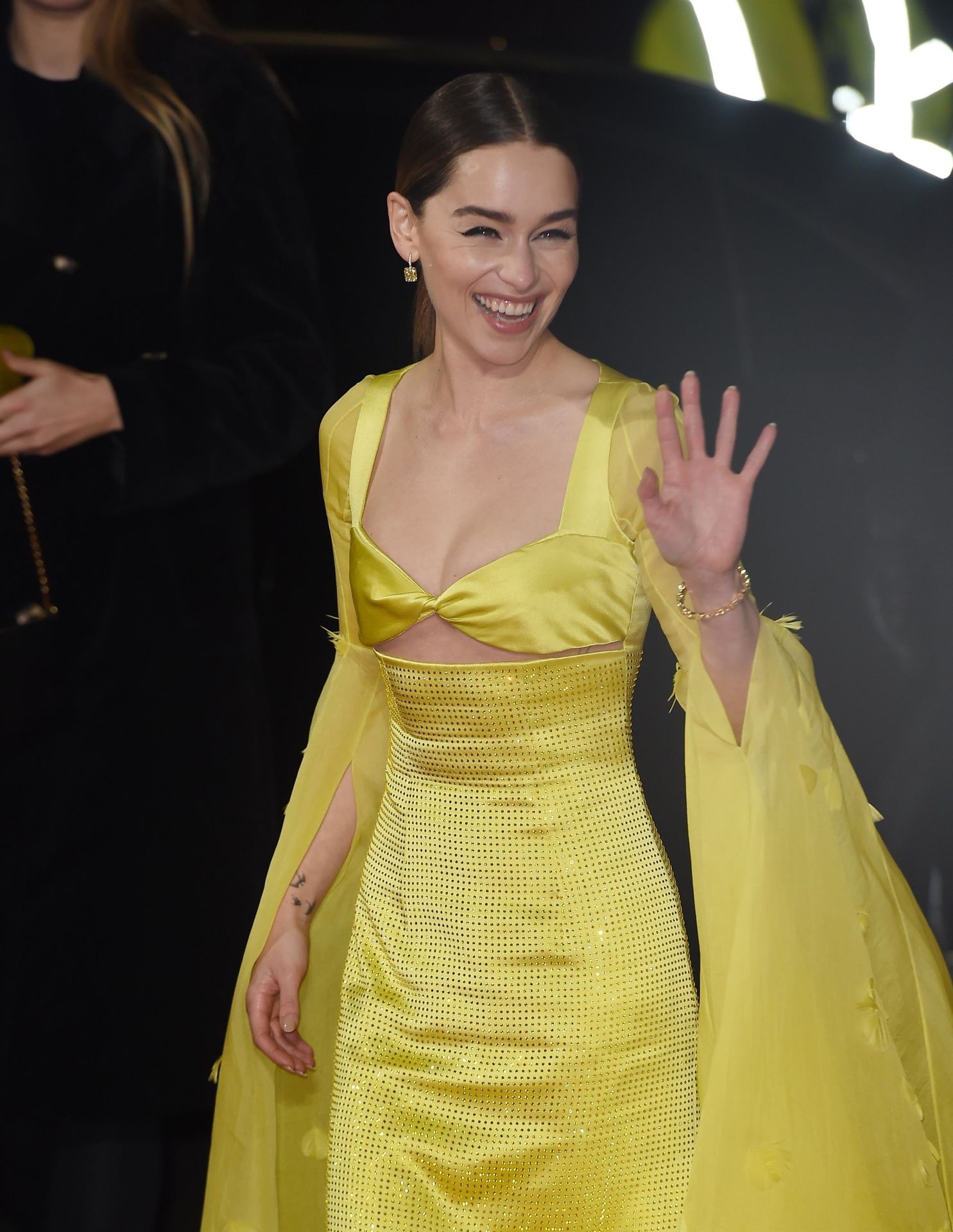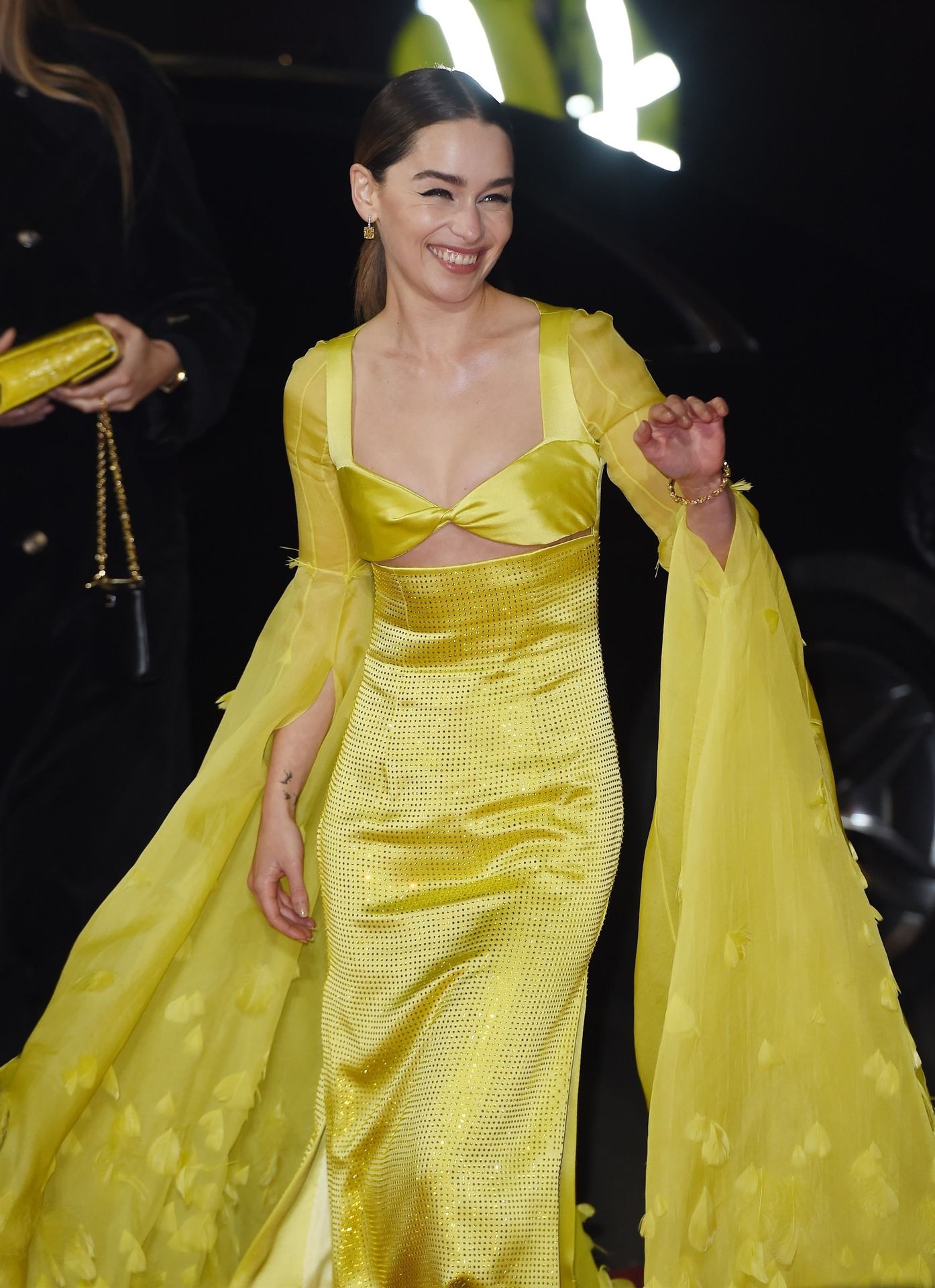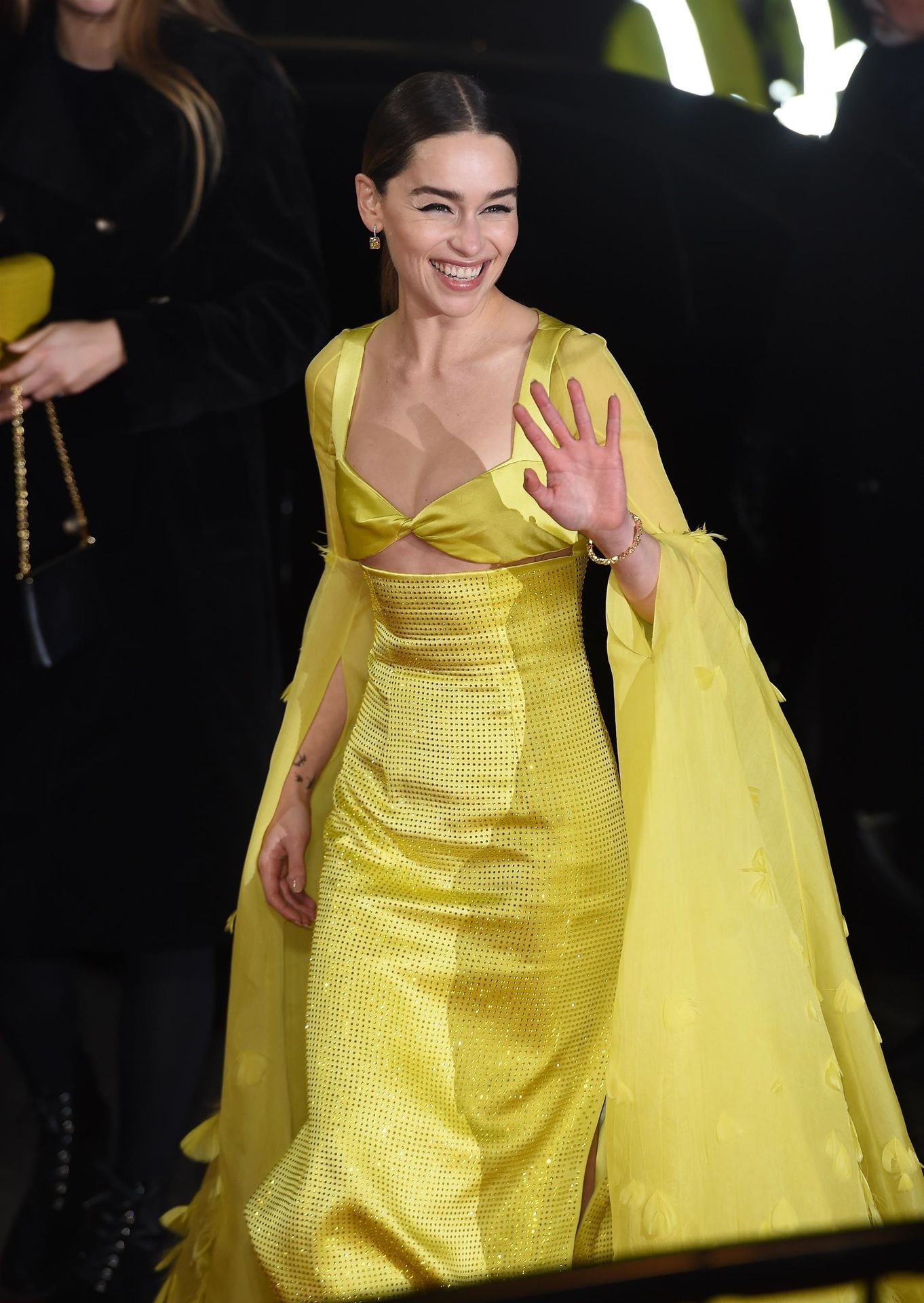 L’actrice anglaise Emilia Clarke pose dans une robe jaune sur le tapis rouge à son arrivée aux Fashion Awards 2019 à Londres, le 12/02/2019.