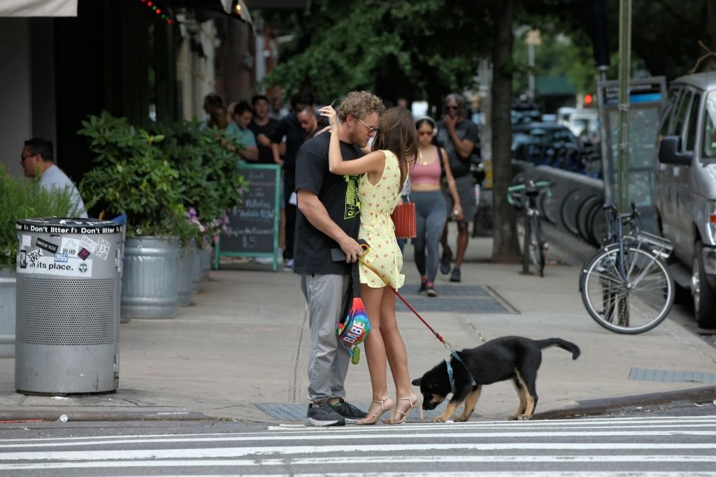 Mannequin/actrice, star de The Fappening Emily Ratajkowski, portant une robe jaune de printemps, des talons hauts et un sac rouge à pointes, s’embrasse avec son mari Sebastian Bear-McClard et leur chien Colombo en route pour le déjeuner à New York, 22/06/2019.