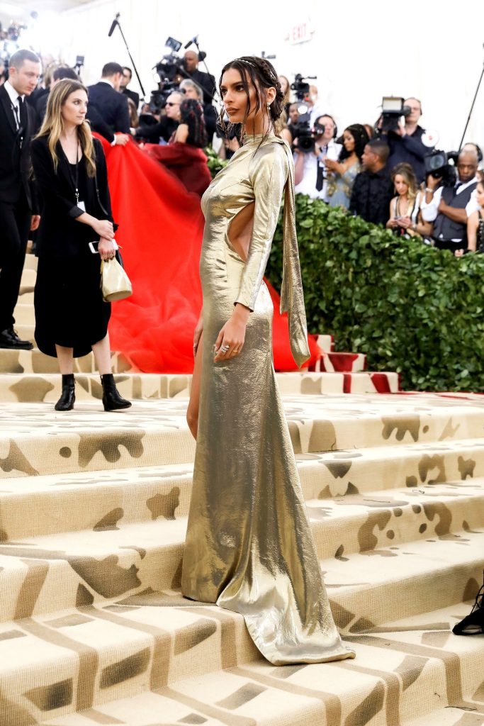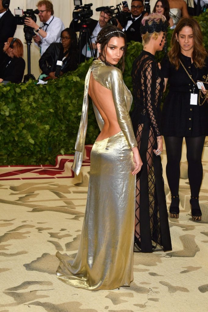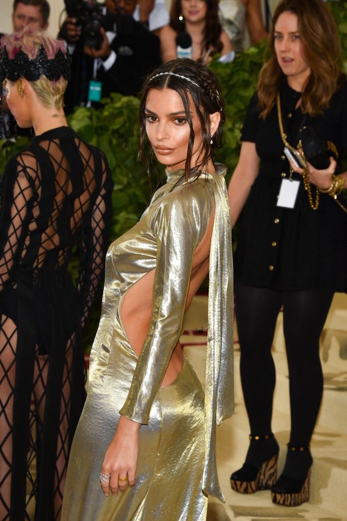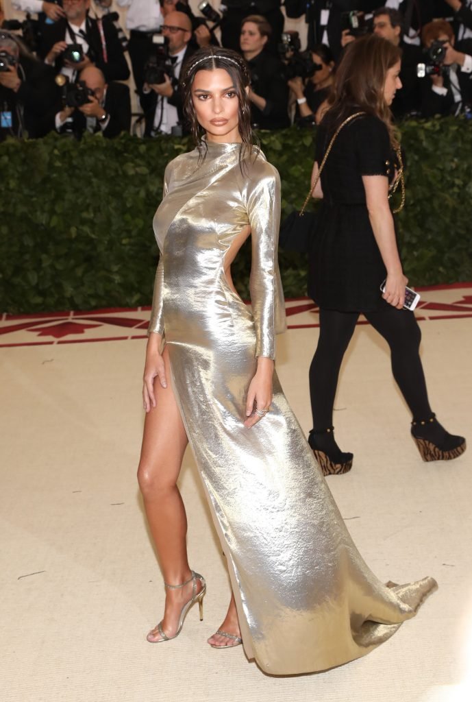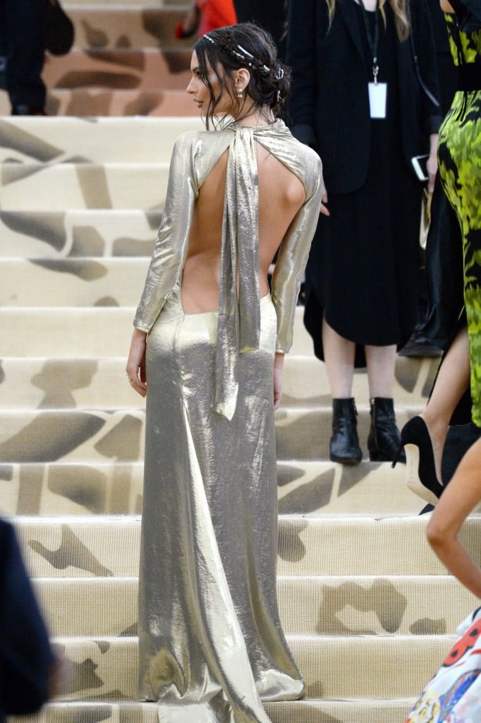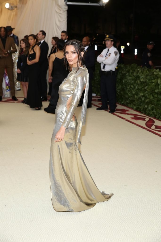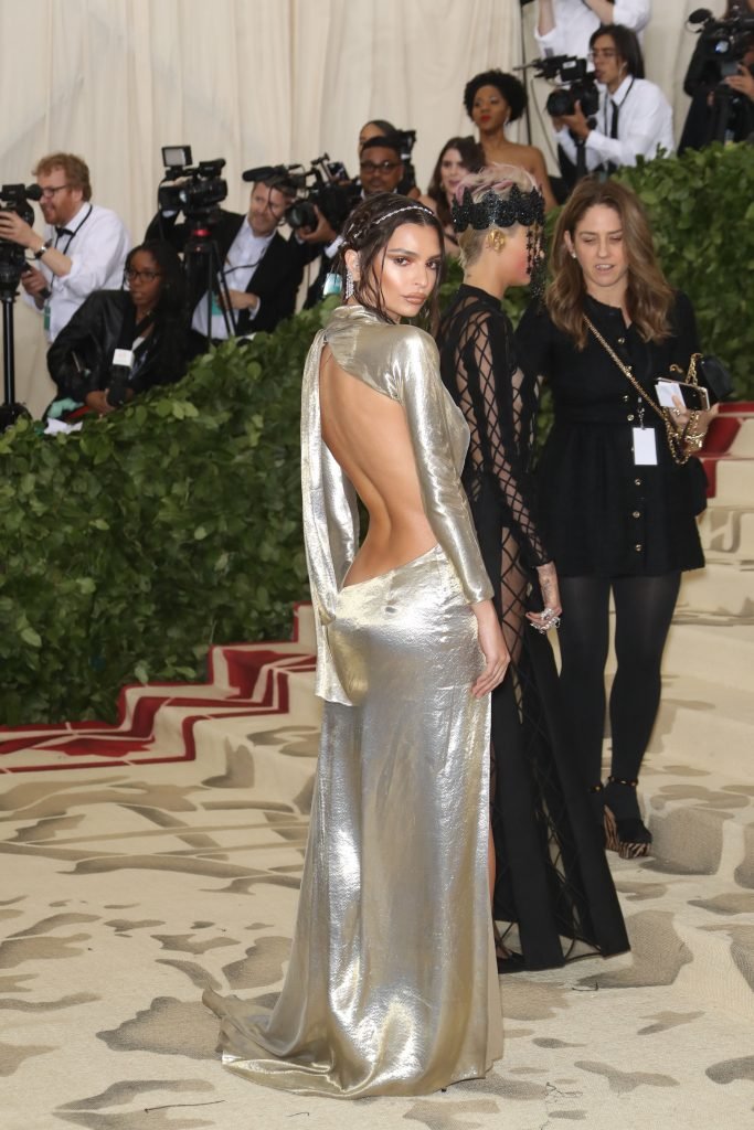 Le mannequin et actrice Emily Ratajkowski (26 ans) exhibe sa silhouette élancée, ses jambes et dévoile sa culotte lors du Gala de l’Institut du Costume 2018 à New York. La superbe brune portait une robe argentée dos nu.