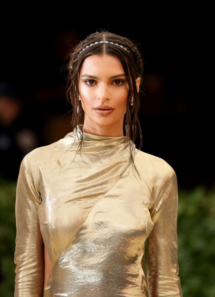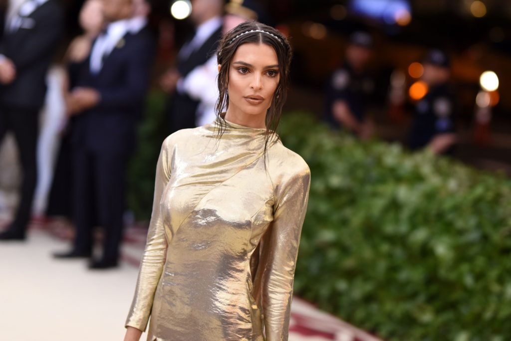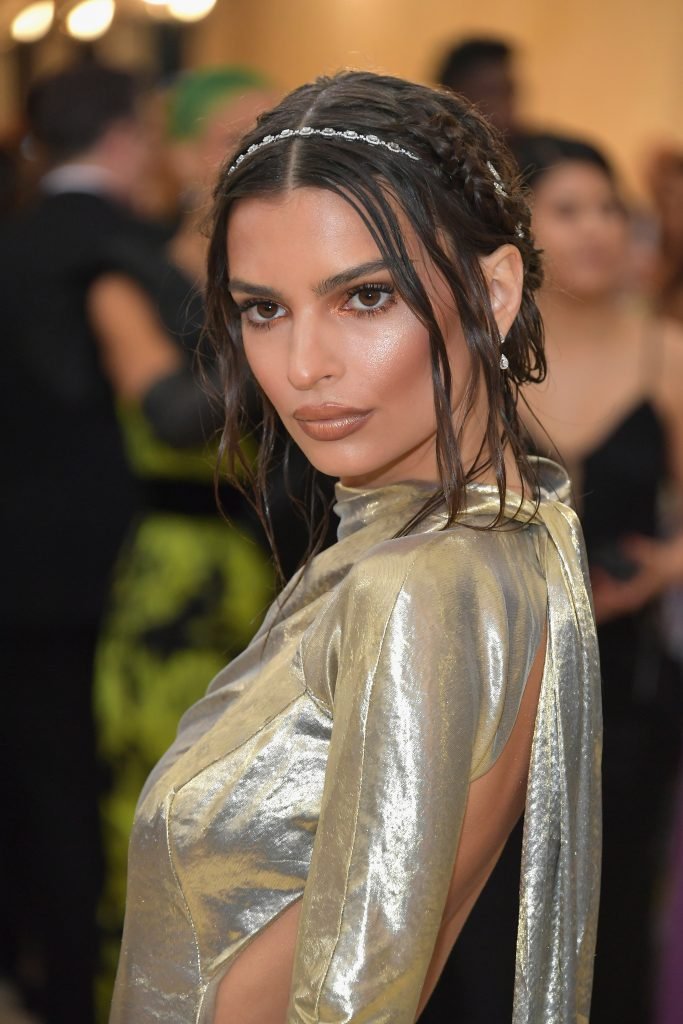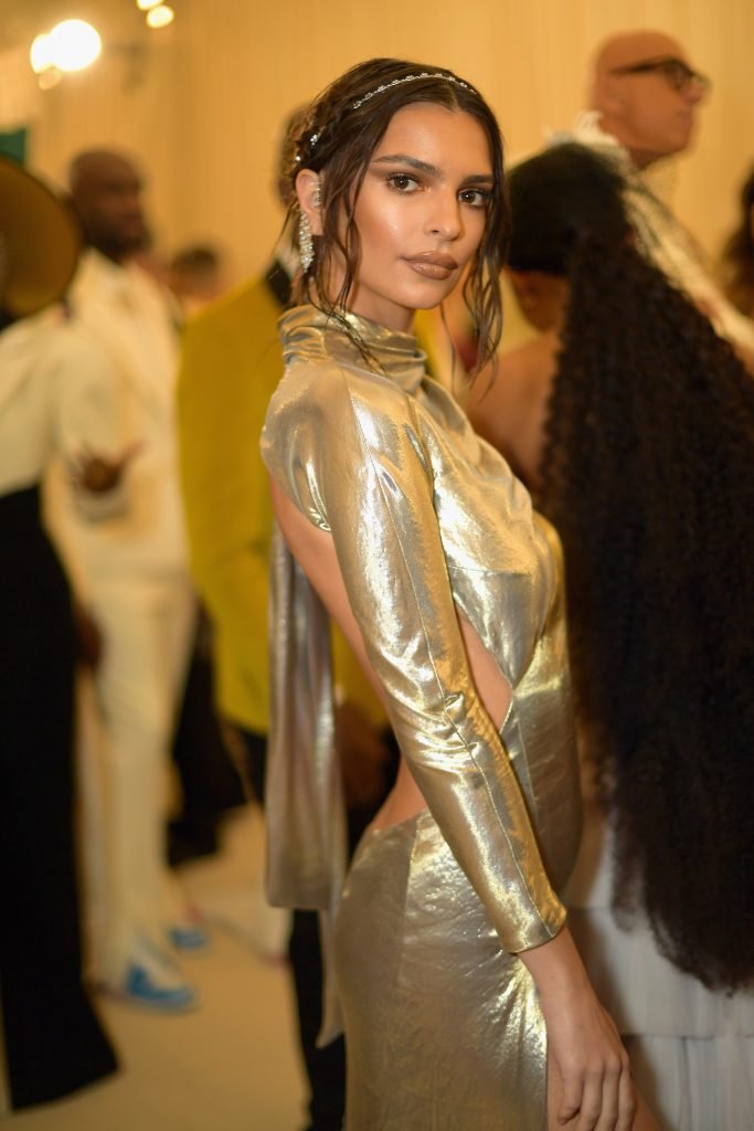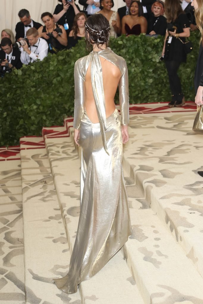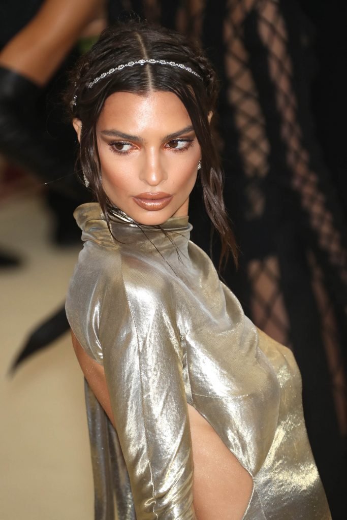 Le mannequin et actrice Emily Ratajkowski (26 ans) exhibe sa silhouette élancée, ses jambes et dévoile sa culotte lors du Gala de l’Institut du Costume 2018 à New York. La superbe brune portait une robe argentée dos nu.