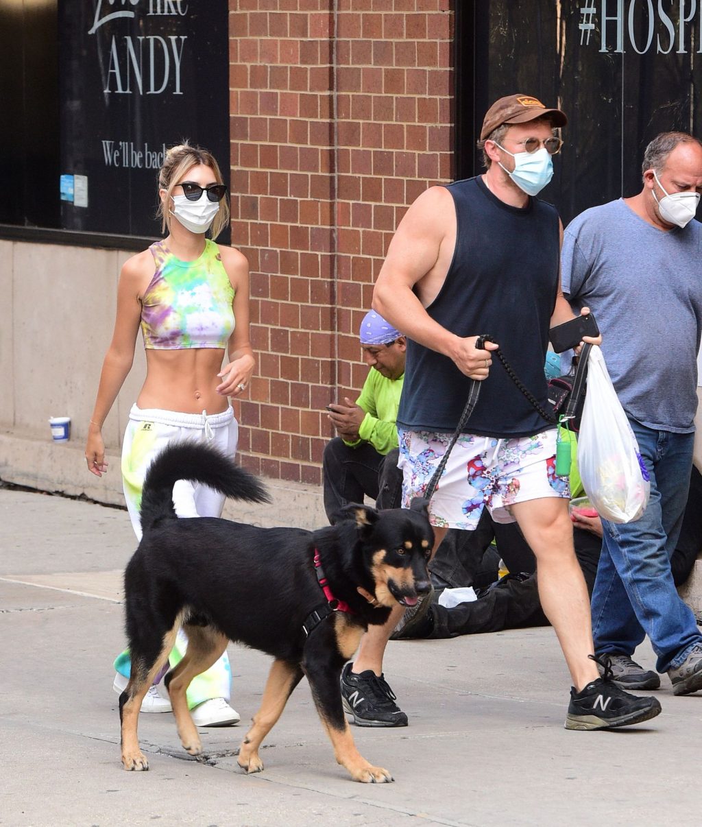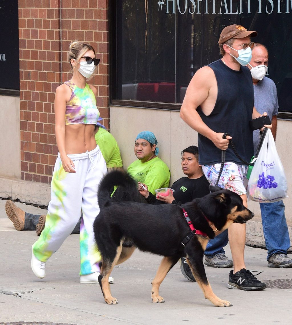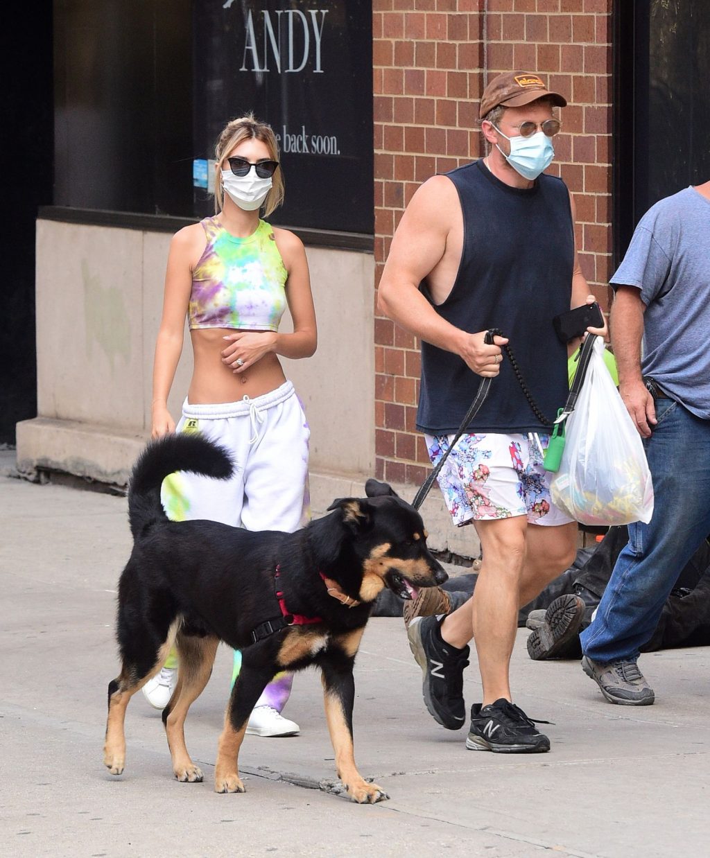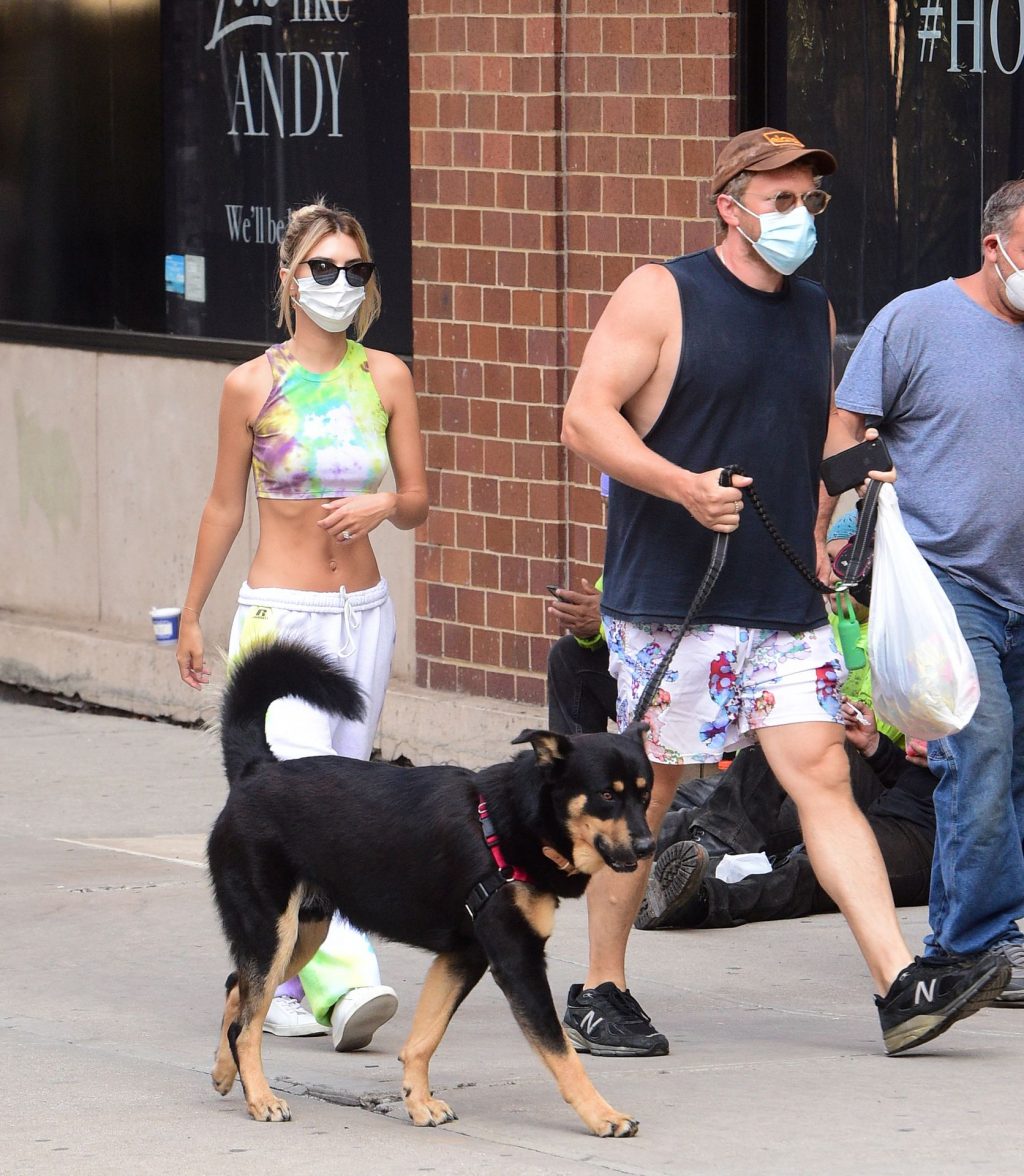 Model, actrice, star de The Fappening Emily Ratajkowski et Sebastian Bear-McClard sont photographiés en train de promener leur chien Colombo à New York, 07/09/2020. La mannequin de 29 ans et créatrice de maillots de bain portait un crop top tie-dye, un jogging assorti et des baskets blanches.