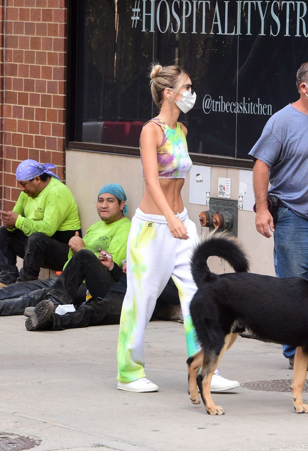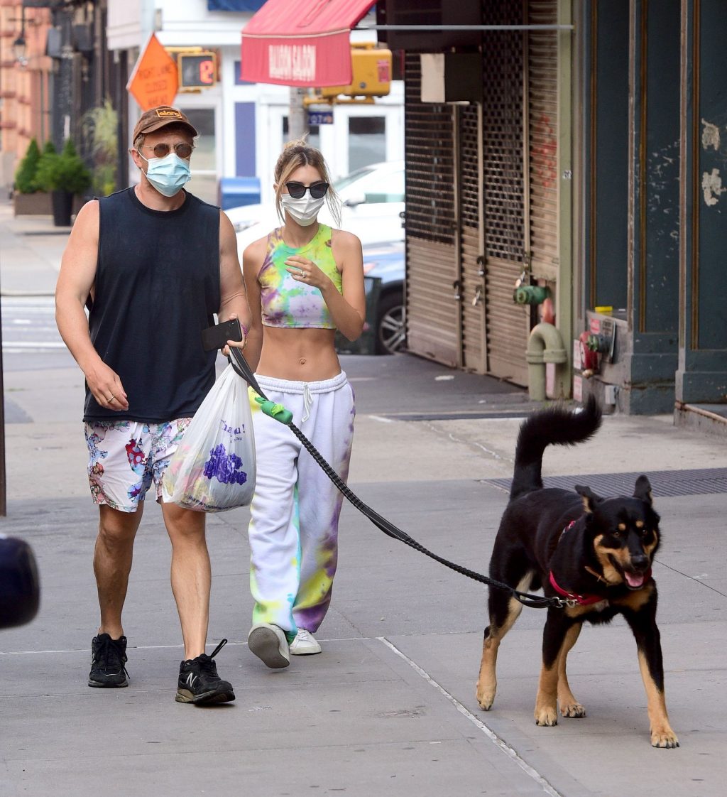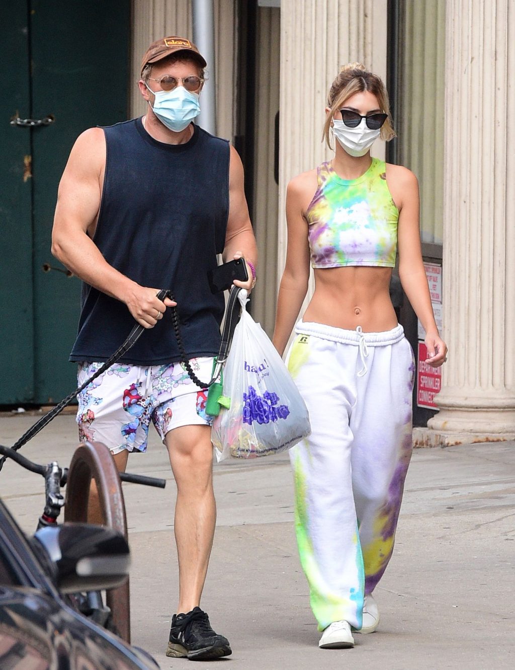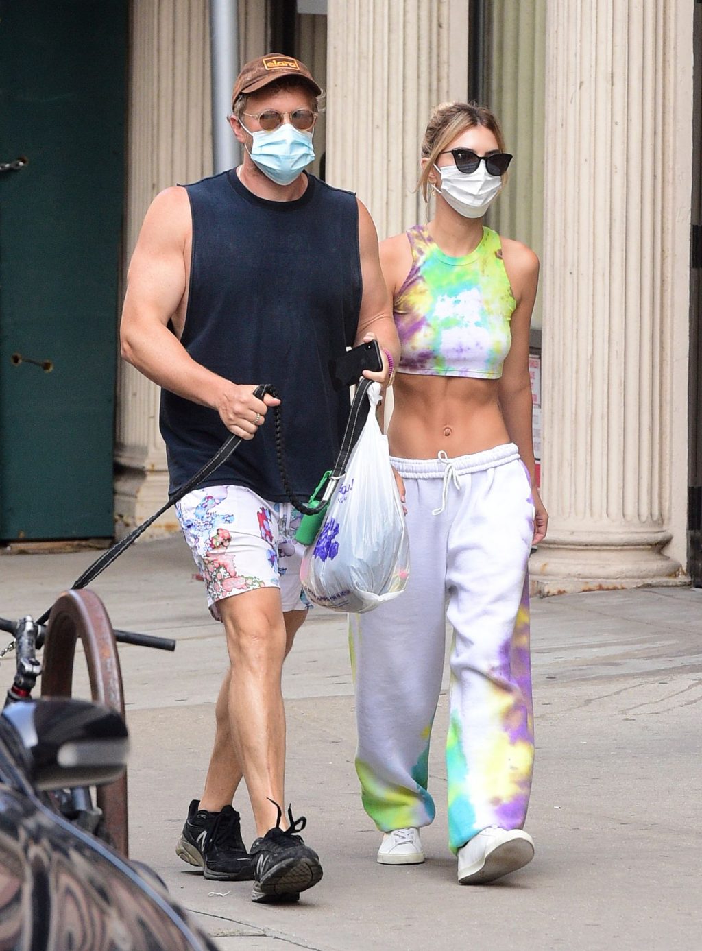 Model, actrice, star de The Fappening Emily Ratajkowski et Sebastian Bear-McClard sont photographiés en train de promener leur chien Colombo à New York, 07/09/2020. La mannequin de 29 ans et créatrice de maillots de bain portait un crop top tie-dye, un jogging assorti et des baskets blanches.