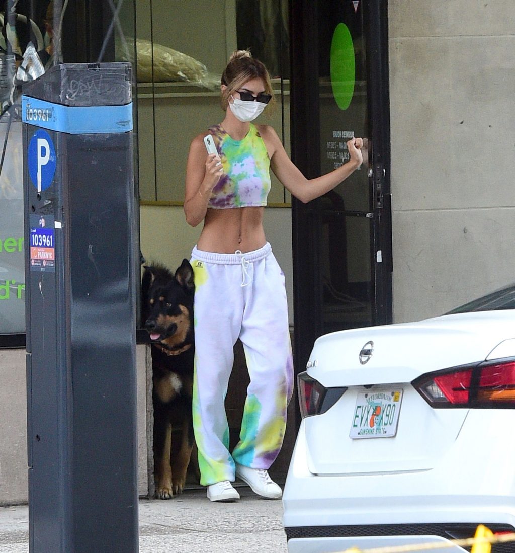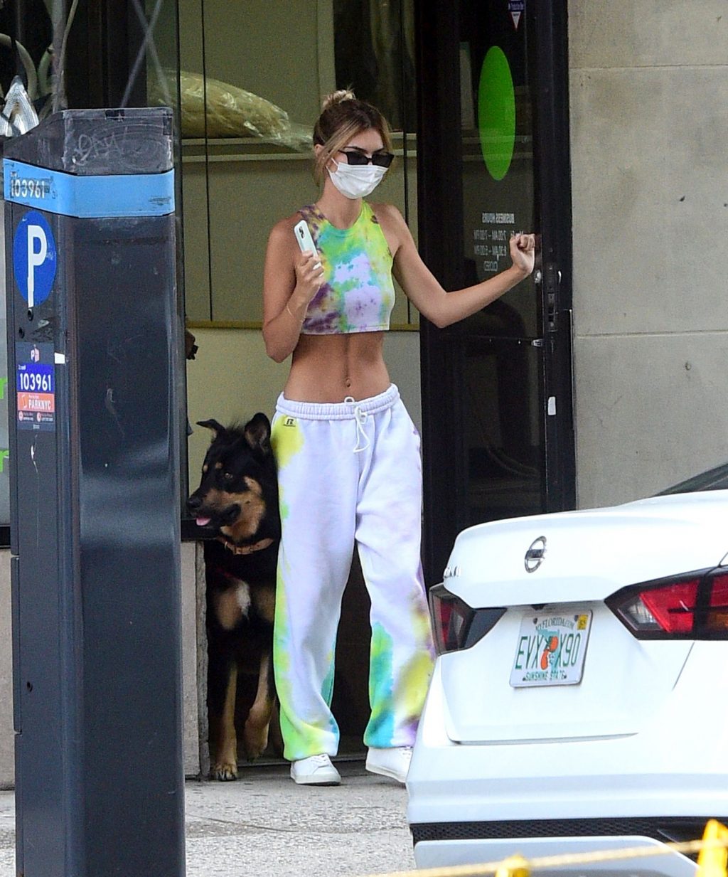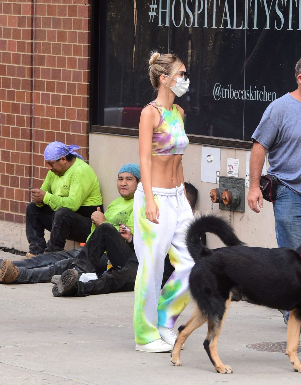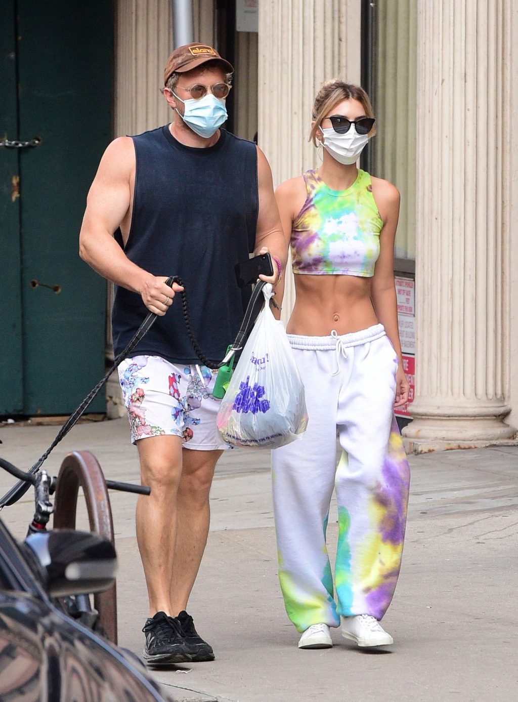 Model, actrice, star de The Fappening Emily Ratajkowski et Sebastian Bear-McClard sont photographiés en train de promener leur chien Colombo à New York, 07/09/2020. La mannequin de 29 ans et créatrice de maillots de bain portait un crop top tie-dye, un jogging assorti et des baskets blanches.