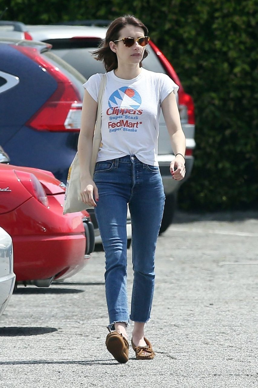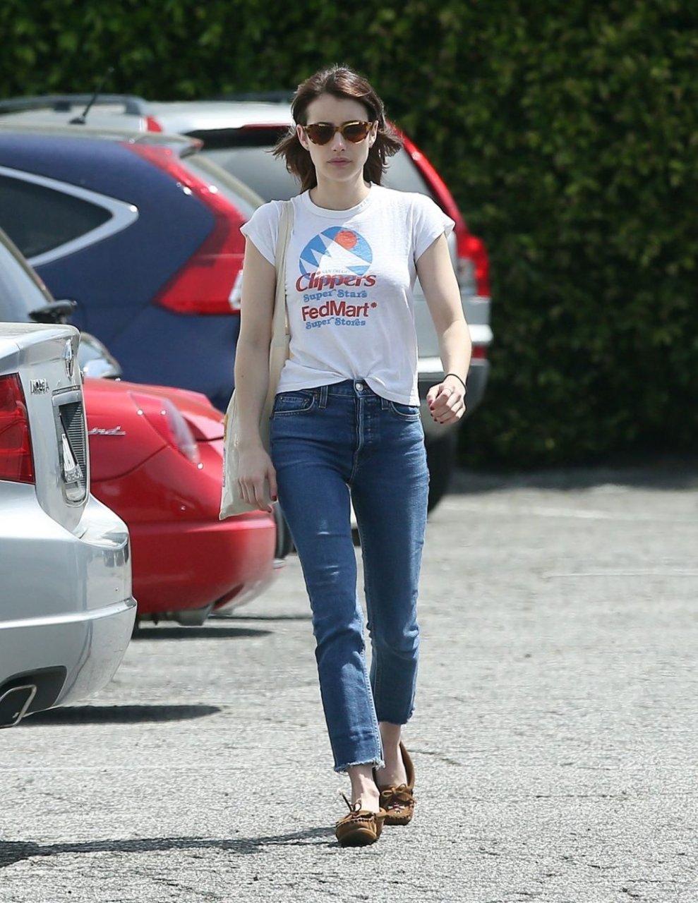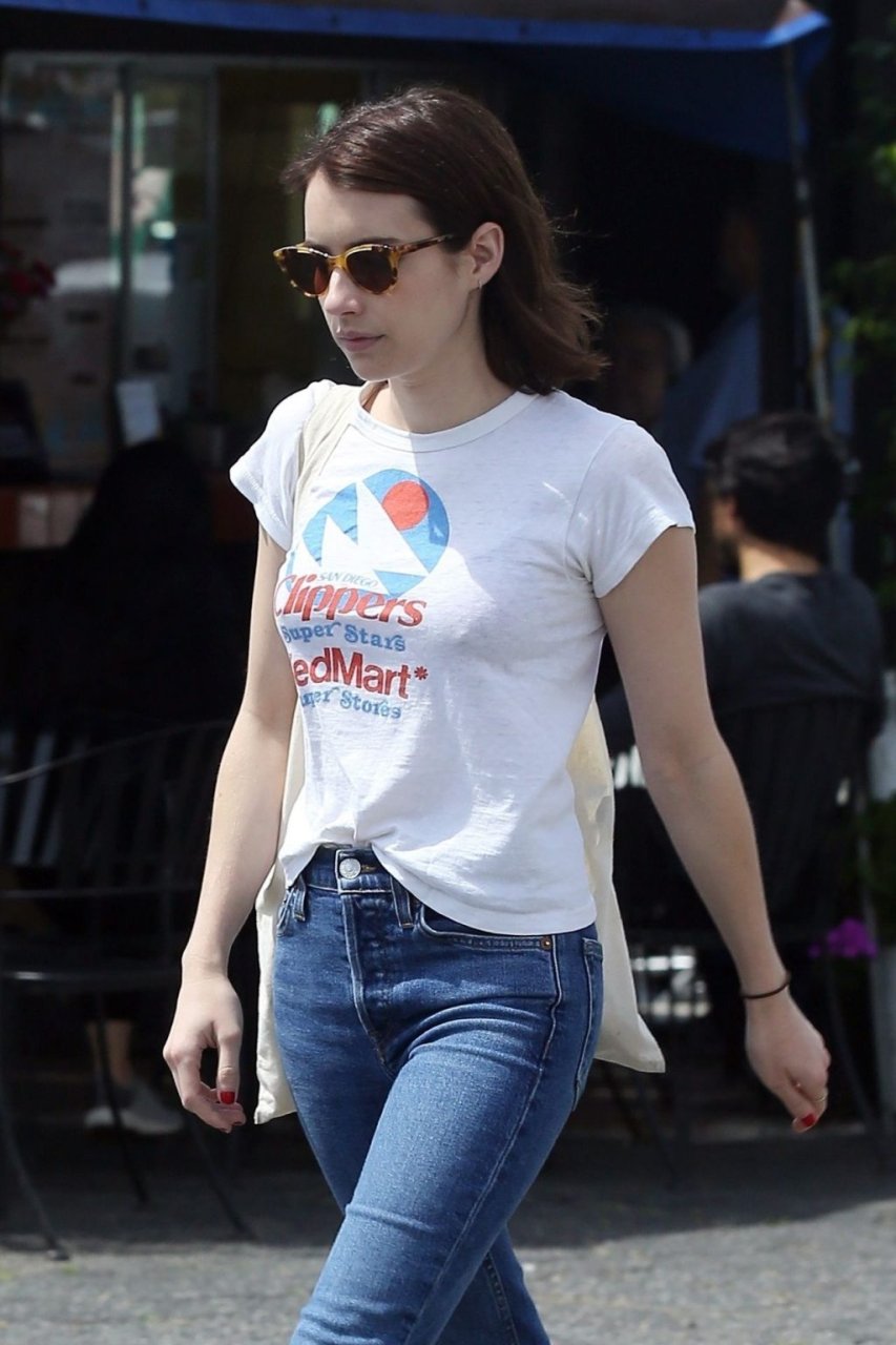 L’actrice Emma Roberts fait quelques courses dans le quartier de Los Feliz à Los Angeles, vêtue d’un tee-shirt blanc sans soutien-gorge et d’un jean bleu, 09/04/2019.