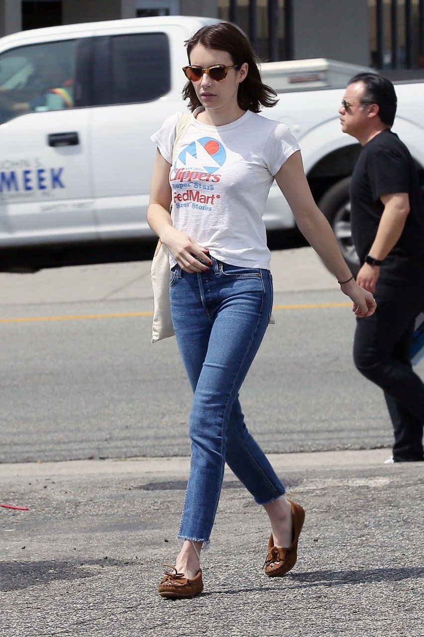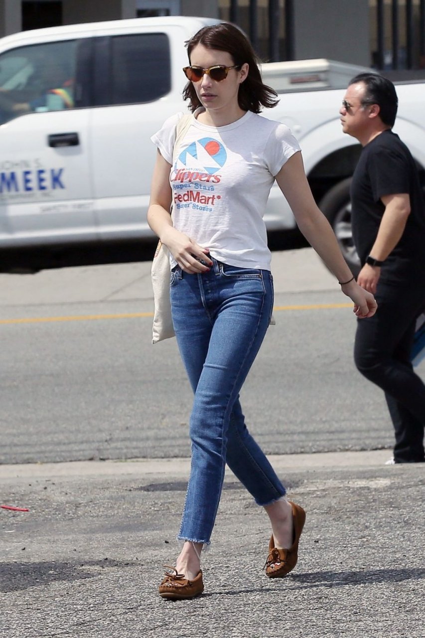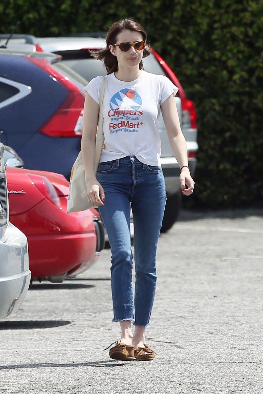 L’actrice Emma Roberts fait quelques courses dans le quartier de Los Feliz à Los Angeles, vêtue d’un tee-shirt blanc sans soutien-gorge et d’un jean bleu, 09/04/2019.