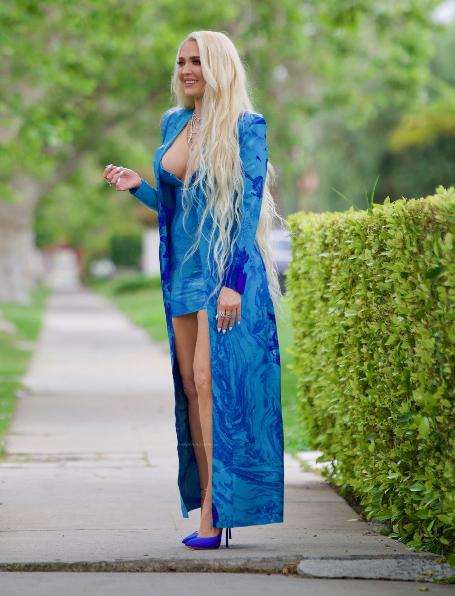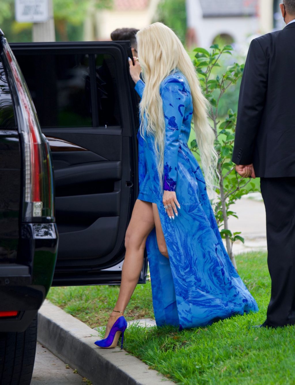 L’actrice/chanteuse/présentatrice TV s’est habillée d’une mini robe en latex bleu Nlod, avec un manteau assorti, alors qu’elle se rendait au Hollywood Palladium pour l’enregistrement de la cérémonie de remise des prix.