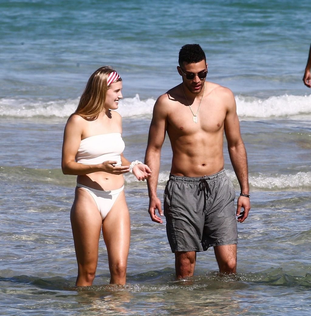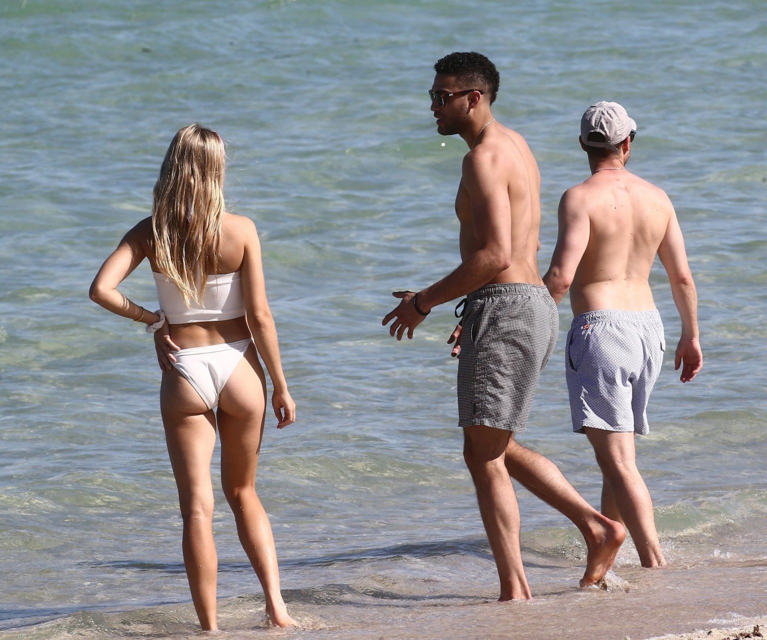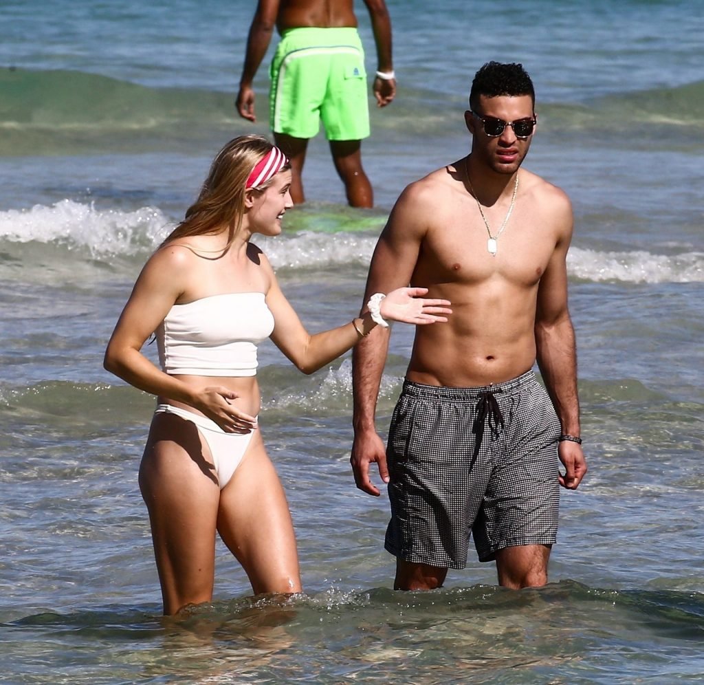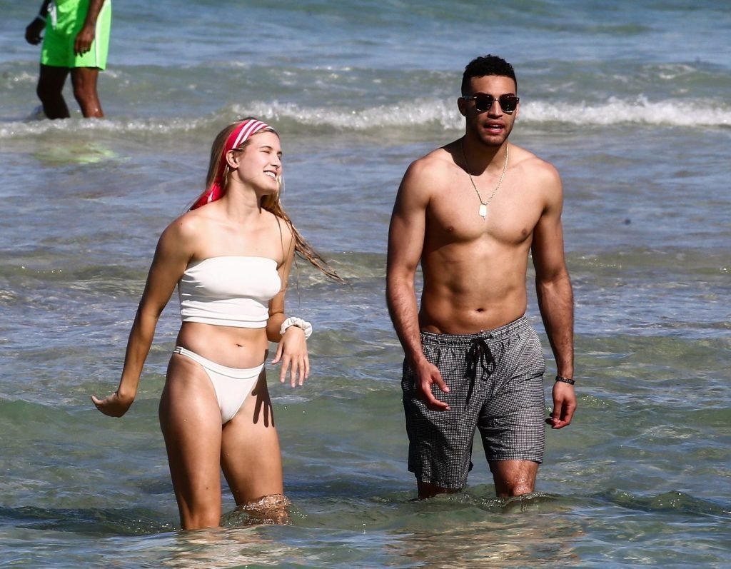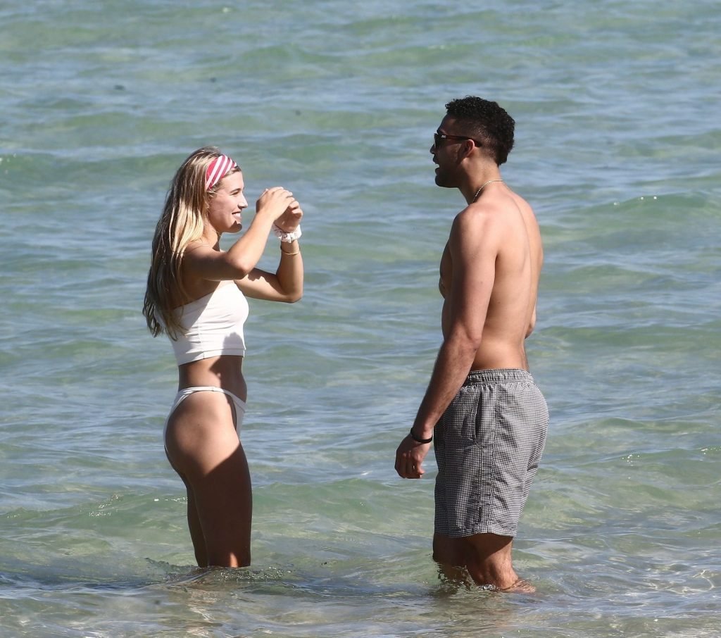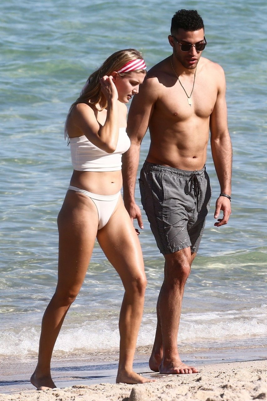La star du tennis Genie Bouchard et un homme mystérieux célèbrent le dimanche de Pâques avec une baignade chaude dans les eaux de Miami Beach, 21/04/2019. Genie, qui portait un bikini deux pièces blanc, sourit largement tandis que le beau gosse musclé la rejoint pour une baignade.