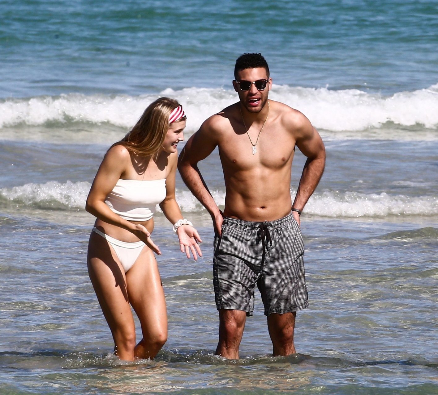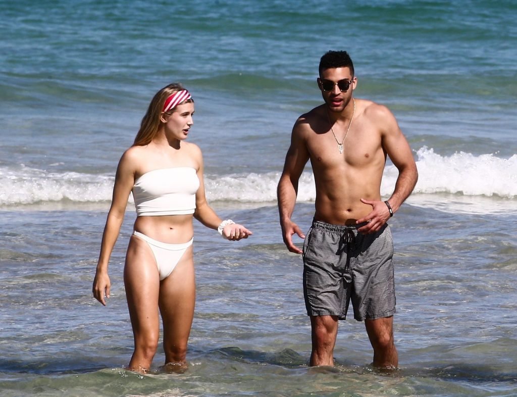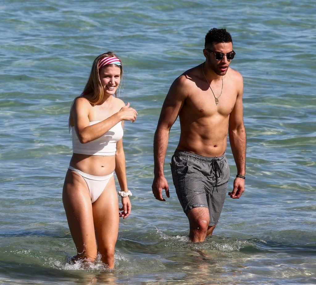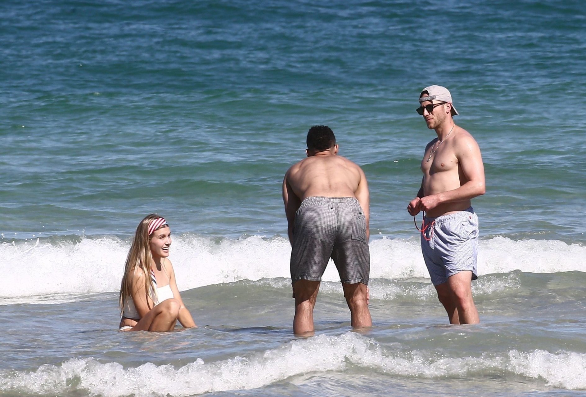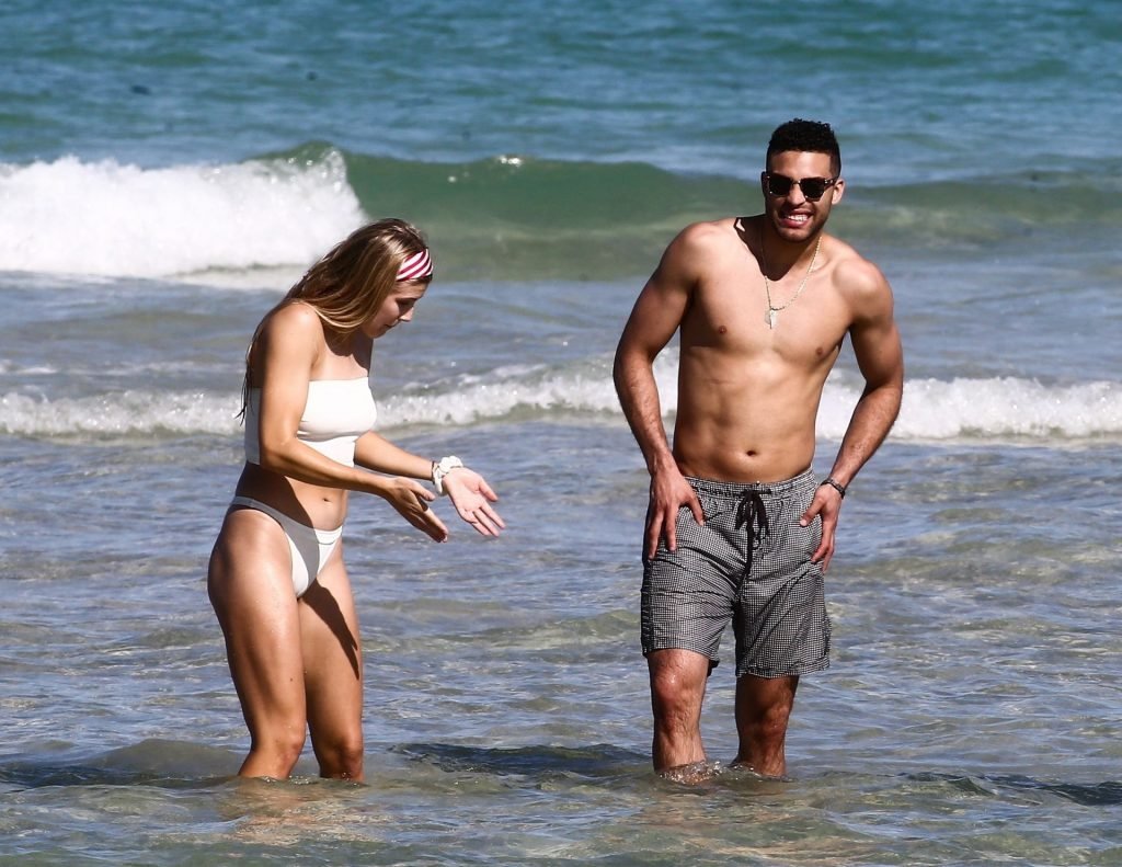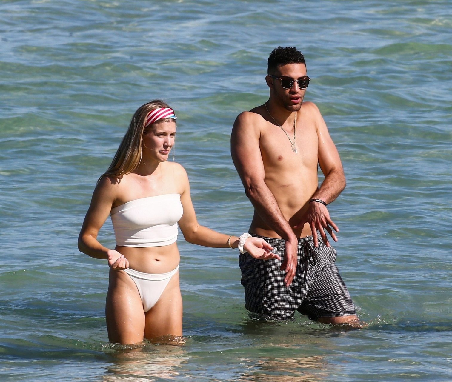 La star du tennis Genie Bouchard et un homme mystérieux célèbrent le dimanche de Pâques avec une baignade chaude dans les eaux de Miami Beach, 21/04/2019. Genie, qui portait un bikini deux pièces blanc, sourit largement tandis que le beau gosse musclé la rejoint pour une baignade.