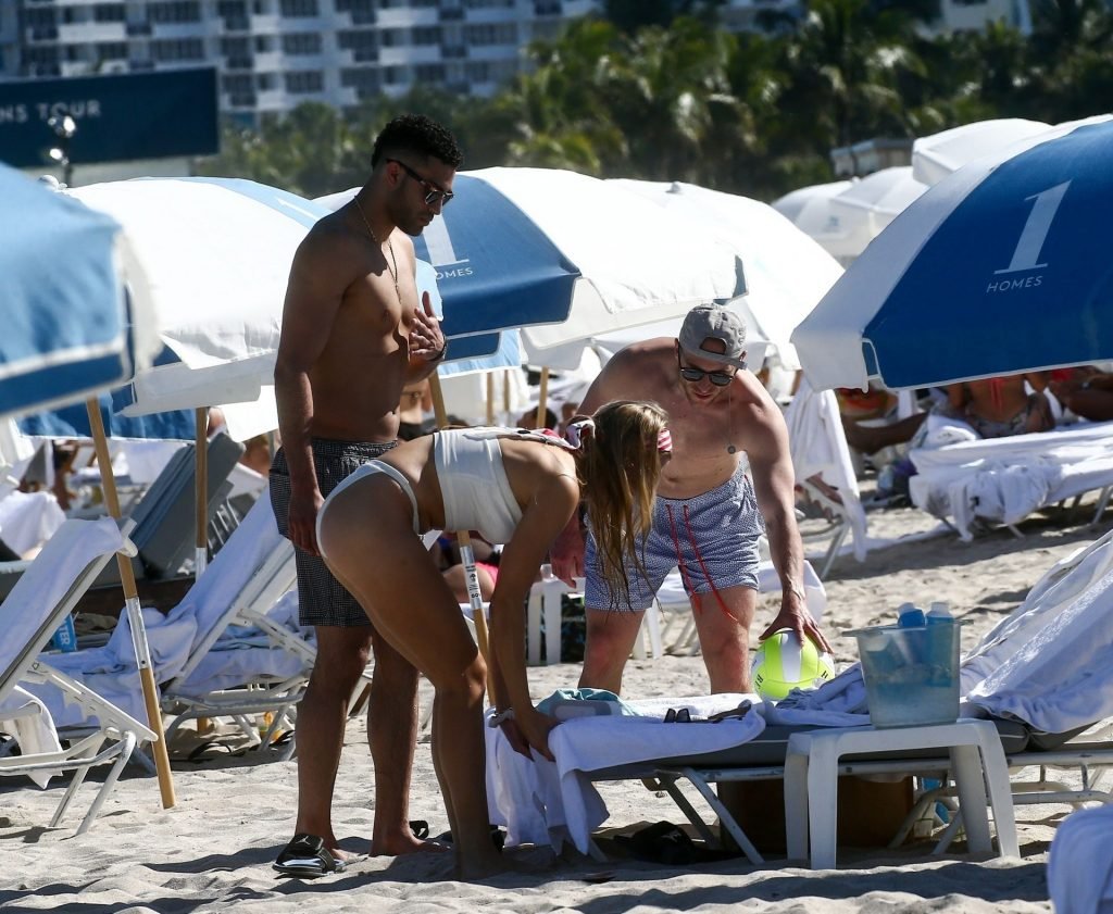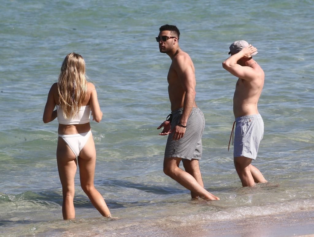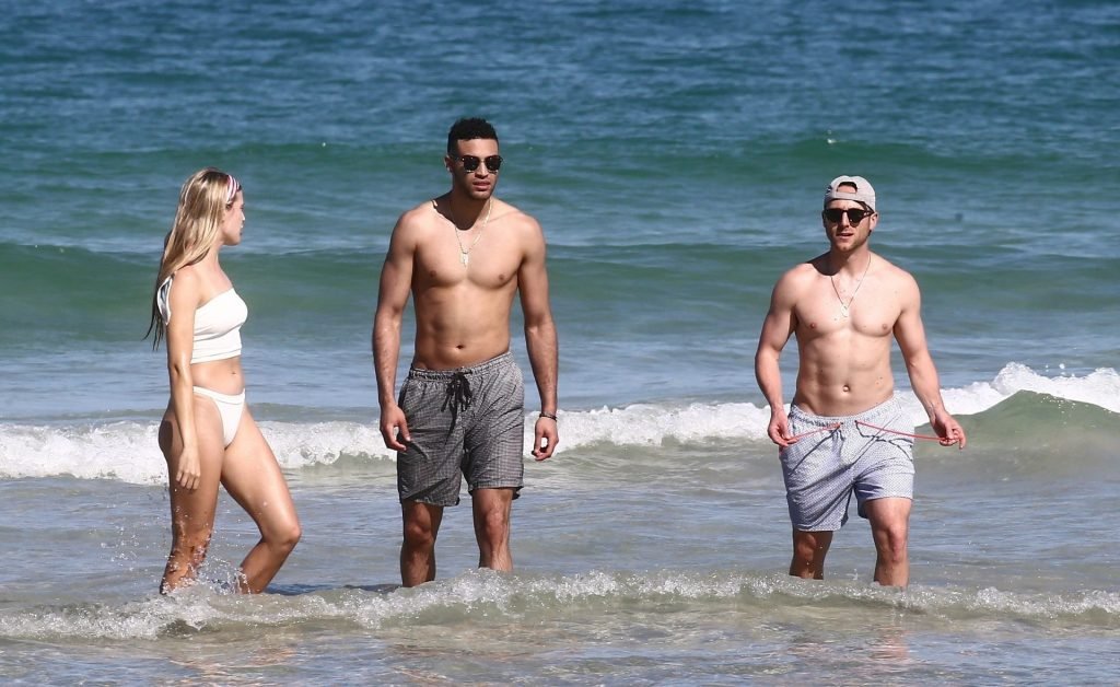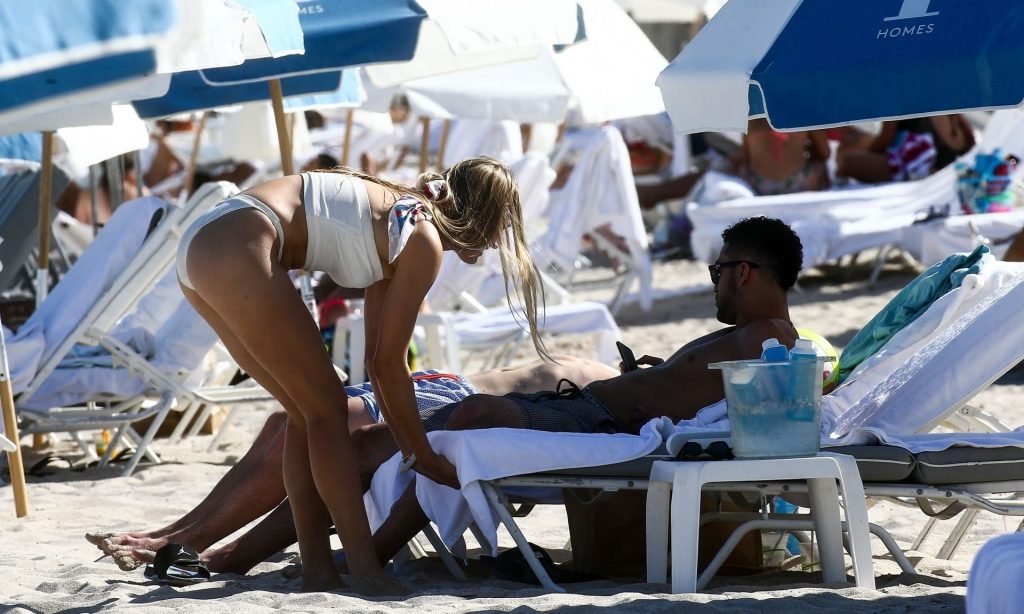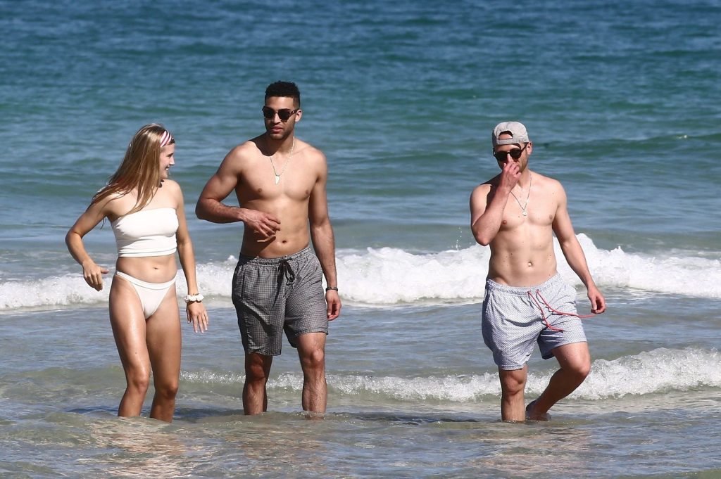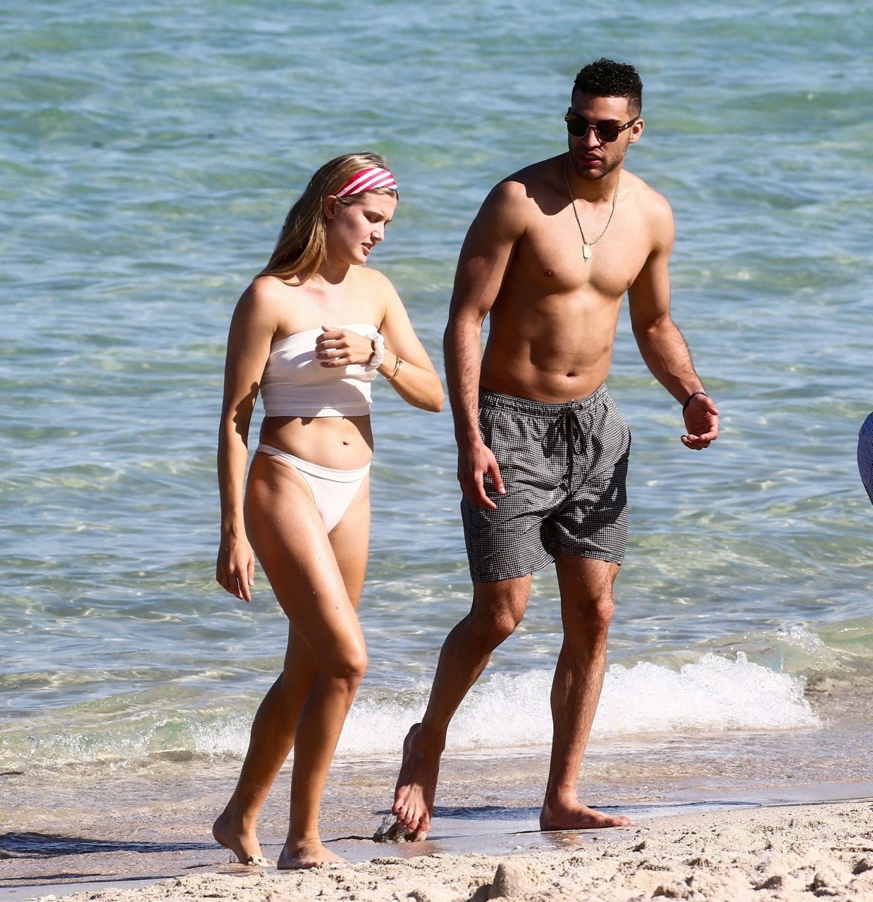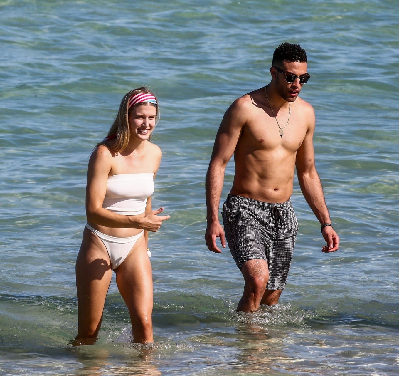 La star du tennis Genie Bouchard et un homme mystérieux célèbrent le dimanche de Pâques avec une baignade chaude dans les eaux de Miami Beach, 21/04/2019. Genie, qui portait un bikini deux pièces blanc, sourit largement tandis que le beau gosse musclé la rejoint pour une baignade.