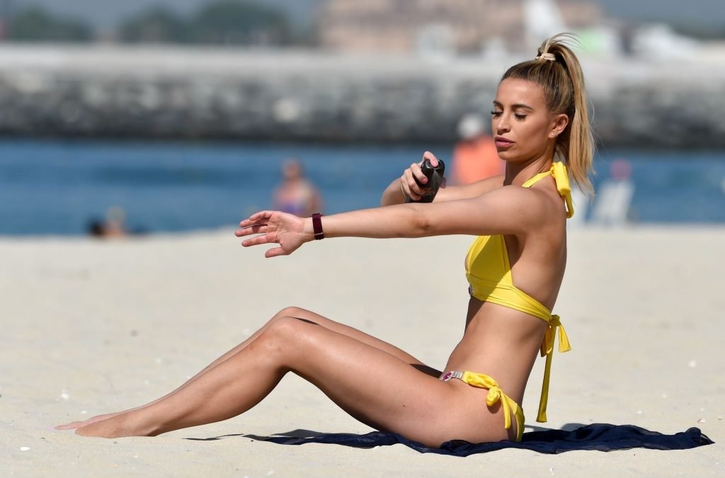 Ferne McCann profite de ses vacances en bikini jaune à Dubaï, 29/12/2018. Le mannequin anglais de 28 ans et star de la télévision a exhibé sa silhouette athlétique sur la plage. Ferne a lancé son propre DVD de fitness cette semaine « Fit as Ferne ».